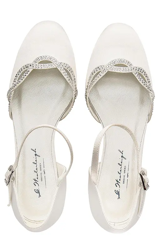 Benötigen Sie Schuhe mit einem niedrigen Absatz? Brautschuhe sind schwerer zu finden, und wir haben dieses Modell für Sie. Sie haben eine geschlossene Spitze und der Satin ist in einem feinen, geflochtenen Muster mit glänzenden Steinchen besetzt. Sie werden bequem mit einer Schnalle geschlossen. Die Innensohle ist weich und mit feinem Leder bezogen. Der 4 cm hohe Absatz ist sicherlich bequem.