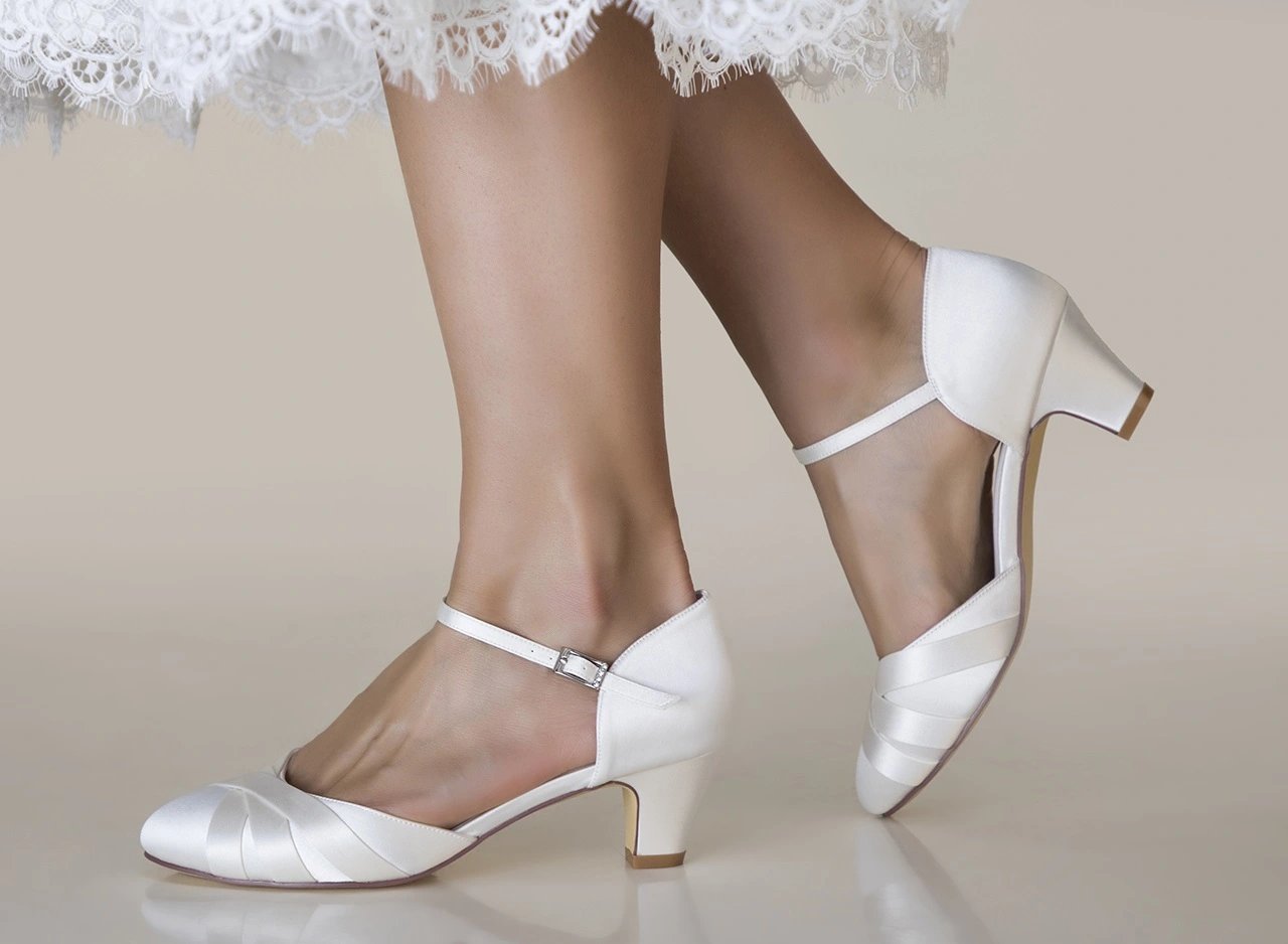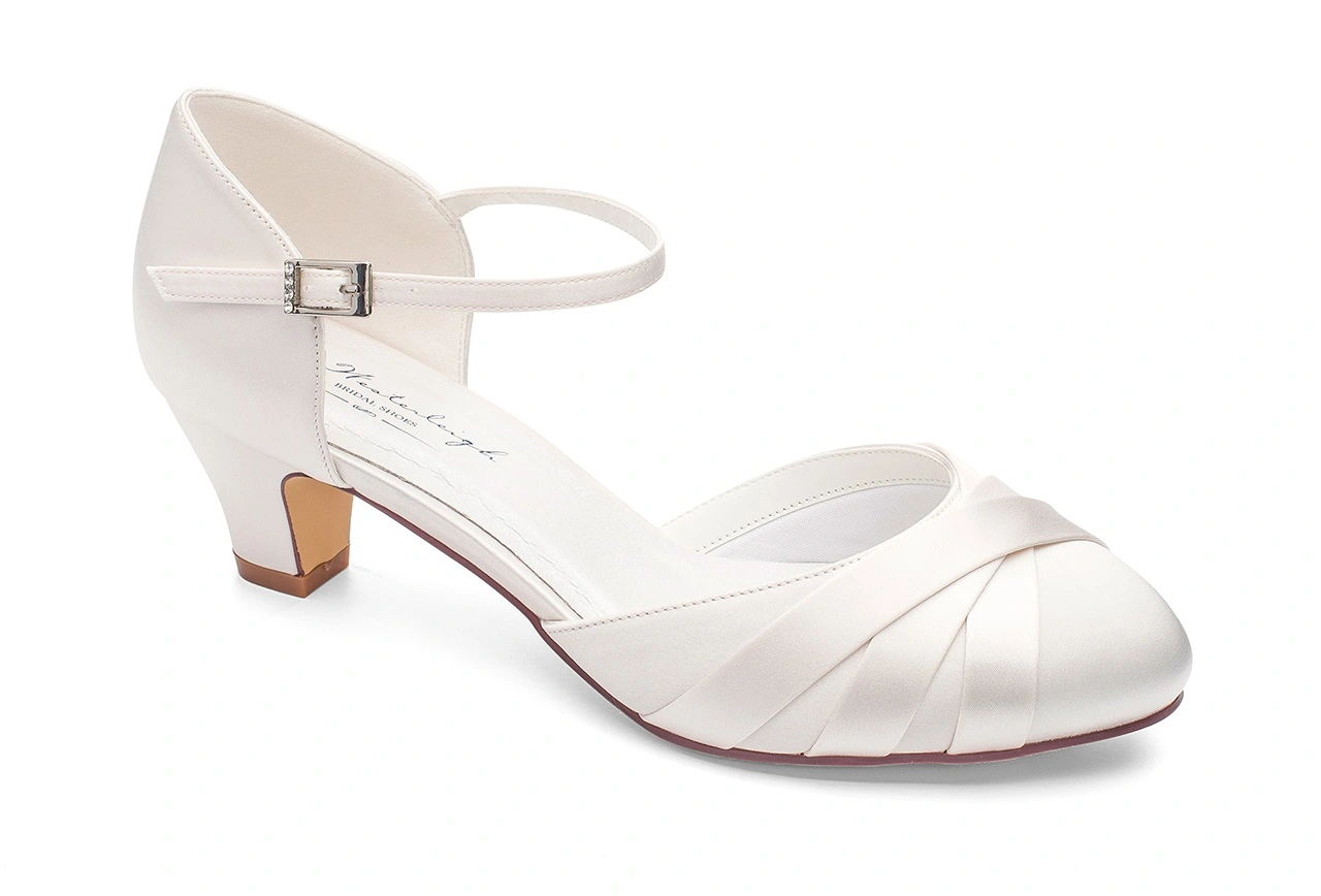 Wunderschöne Brautschuhe mit überkreuzten Satin-Details an der Spitze. Diese handgefertigten Brautschuhe verfügen über eine versteckte Schaumpolsterung und eine sehr weiche Lederinnensohle für ein angenehmes Tragegefühl. Den stabilen, nicht hohen 5 cm Absatz werden Sie während einer langen Nacht definitiv zu schätzen wissen.