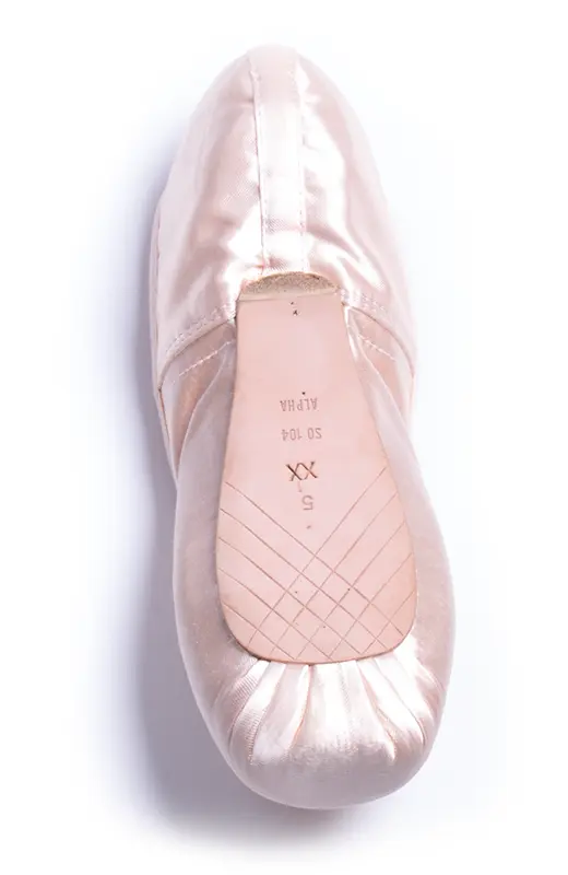 Die Ballettspitzenschuhe Alpha sind für leicht fortgeschrittene und fortgeschrittene Tänzerinnen mit ausreichend "starkem" Knöchel und Fuß geeignet. Sie haben eine 3/4 Ledersohle. Die Innensohle im Spitzenschuh ist durchgehend; wir empfehlen, sie (abzuschneiden) auf die benötigte Länge anzupassen, damit sie den Fuß unterstützt. Die Standfläche der Spitze ist breit und stabil. Die Box hat die Form des Buchstabens U, ist breit und verjüngt sich im unteren Bereich nicht. Durch das Tragen dieser Spitzenschuhe wird der Fuß weiter gekräftigt.