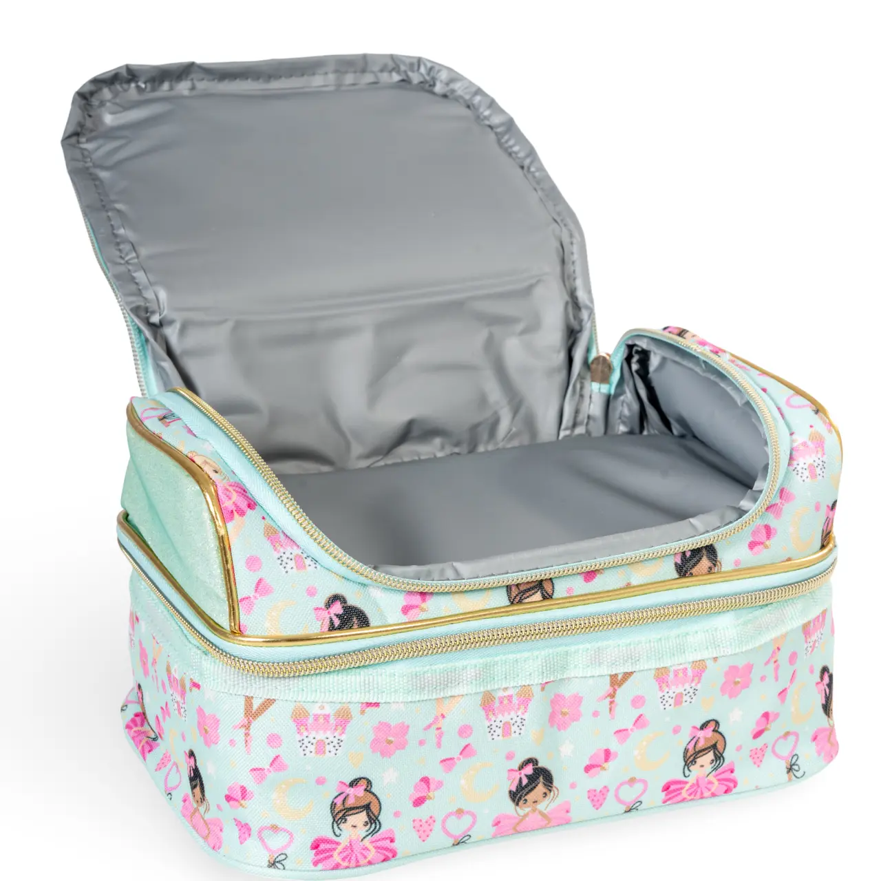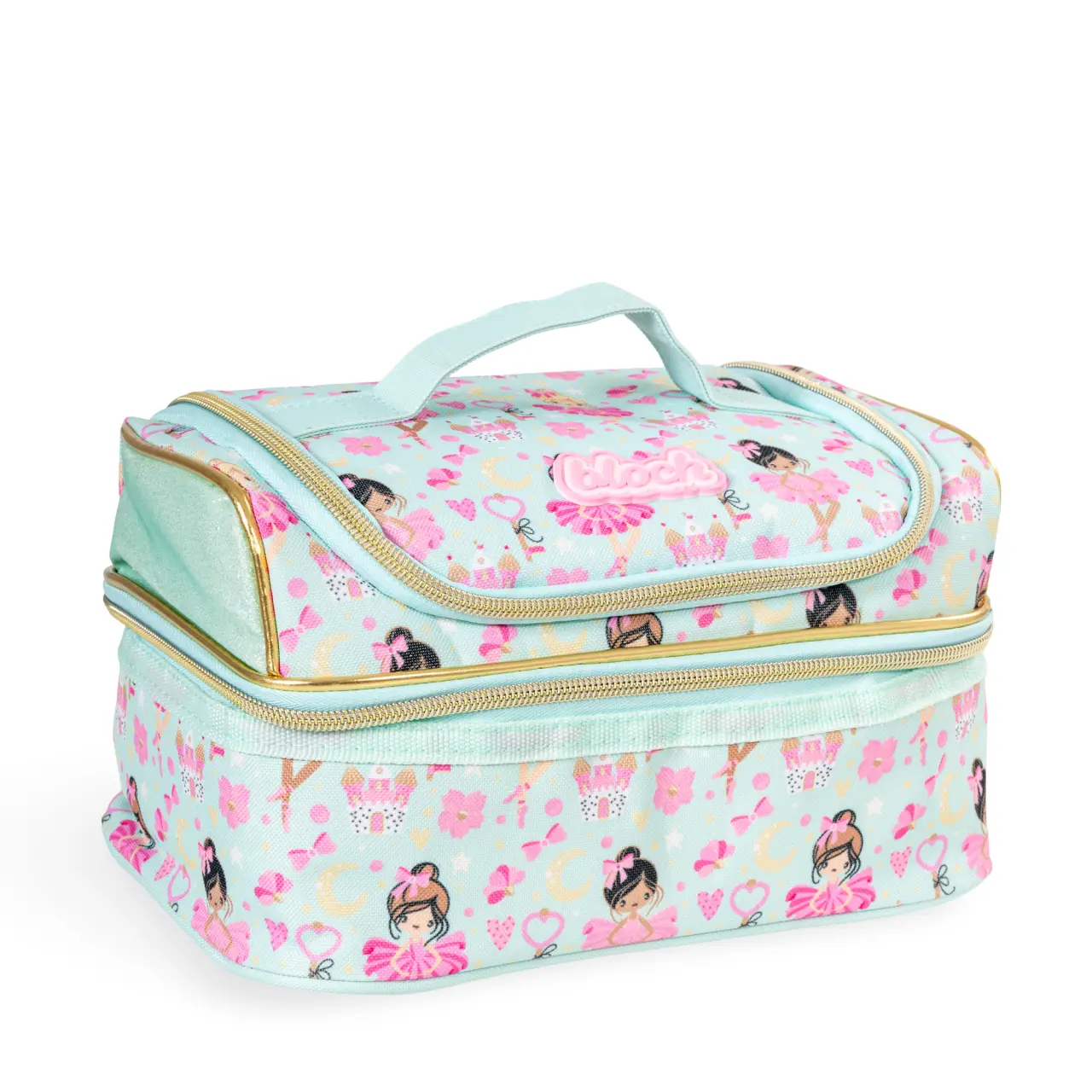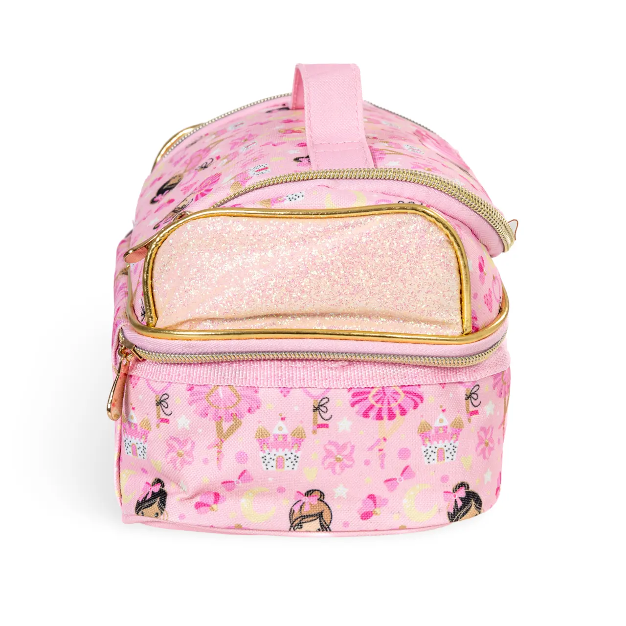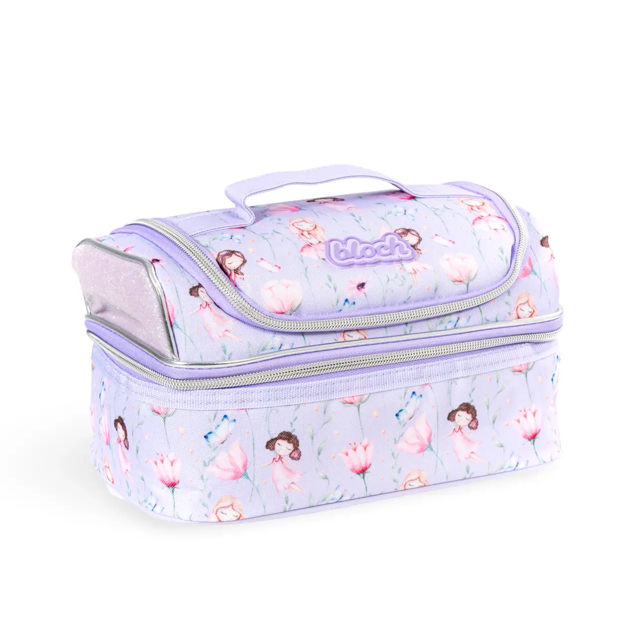Zauberhafte Tasche mit Motiv kleiner Ballerinas und Blümchen, an den Seiten mit Glitzer belebt ist vor allem zur Aufbewahrung von Snacks für kleine Tänzerinnen bestimmt.