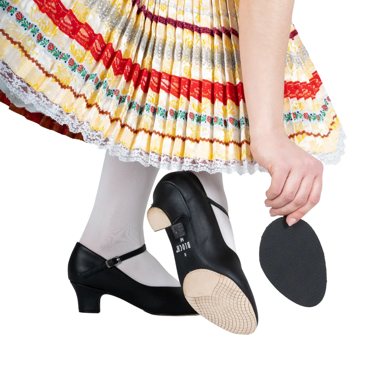 Der Knöchelriemen hält den Fuß fest im Schuh, wodurch der Tanzschritt sicherer wird. Der vordere Teil der Sohle aus feinem, gitterartigem Leder ist so konzipiert, dass er für Tanzböden geeignet ist. Die Verpackung enthält außerdem 1 Paar Gummisohlen (für den vorderen Teil der Einlegesohle), die Sie aufkleben können, wenn Sie auf glatten und rutschigen Böden tanzen.