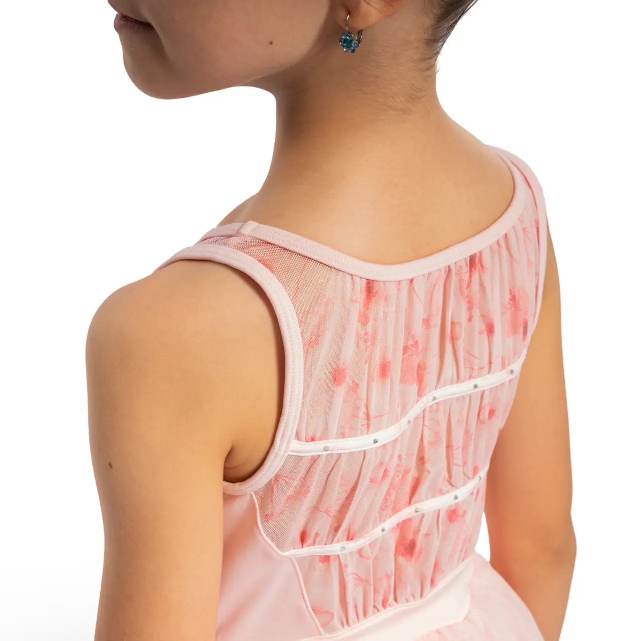 Evie, Trikot mit Tutu-Röckchen für Mädchen begeistert mit weichen Mesh-Trägern mit Blumenprint. Vorne glatt, mit herzförmigem Ausschnitt im Brustbereich hat es am Rücken leicht gerafftes florales Mesh in Kombination mit glänzenden Strasssteinen. Dieses Detail macht es einzigartig.