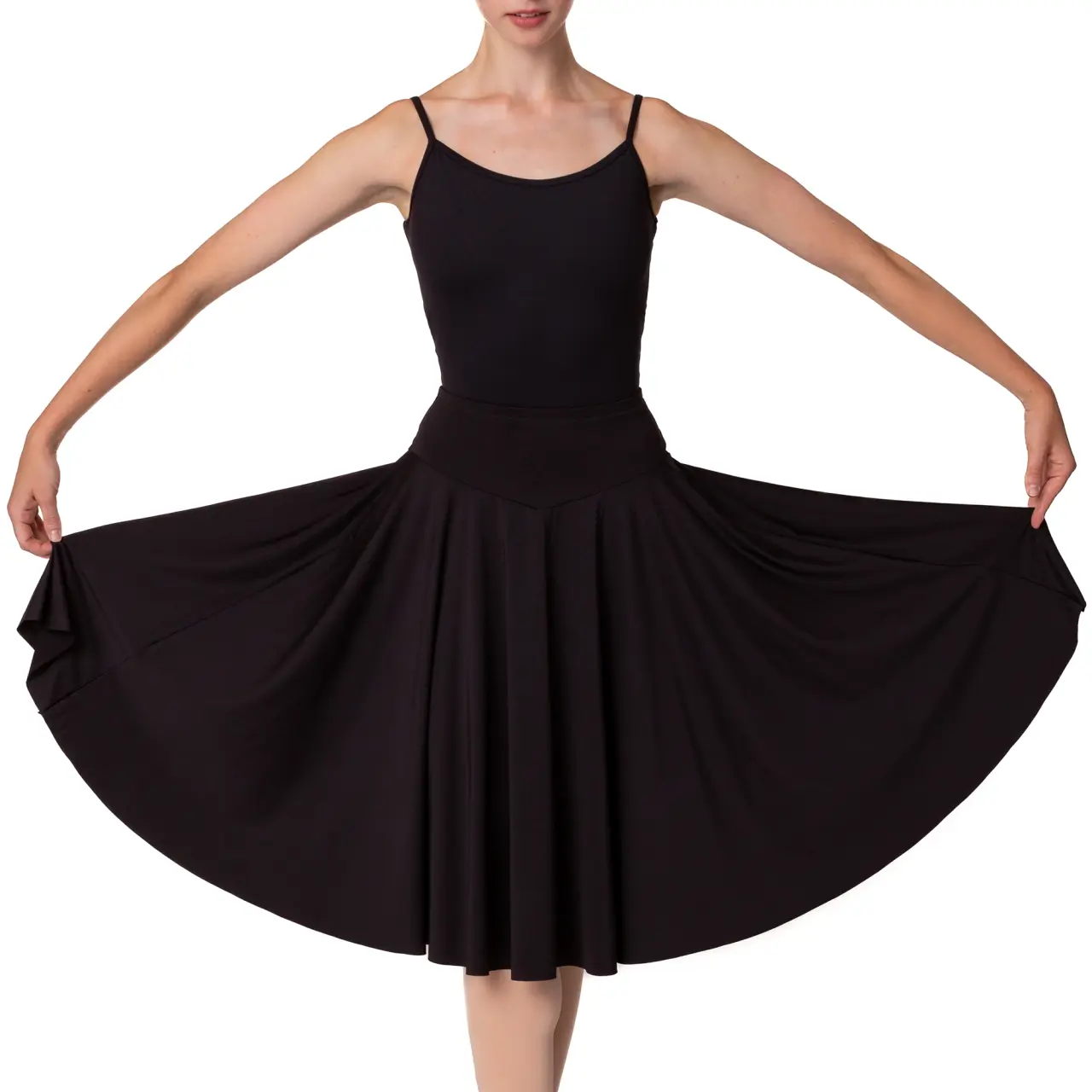 Dieser kreisförmige knielange Rock mit elastischem Bund ist so konzipiert, dass er fest und glatt in der Taille sitzt – ganz ohne unnötiges Volumen. Dank des vollen Teller-Schnitts erhält er ein schönes Volumen und eine elegante Form bei jeder Bewegung – ideal für Tanz, Unterricht und Theateraufführungen.