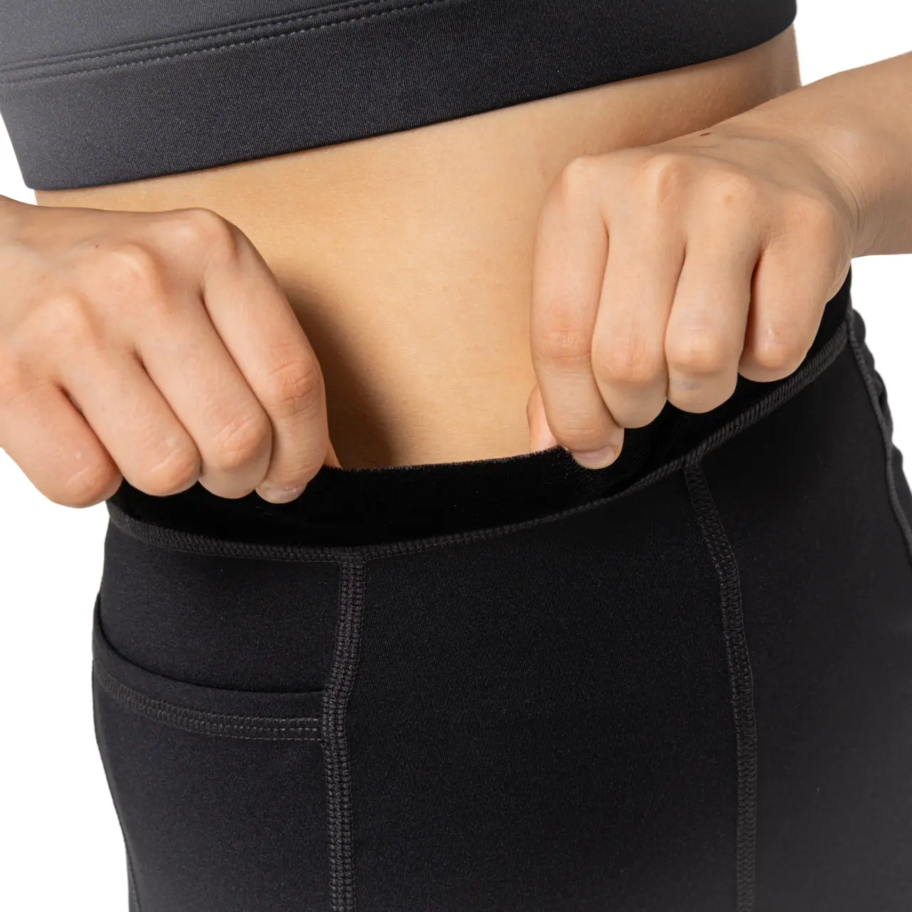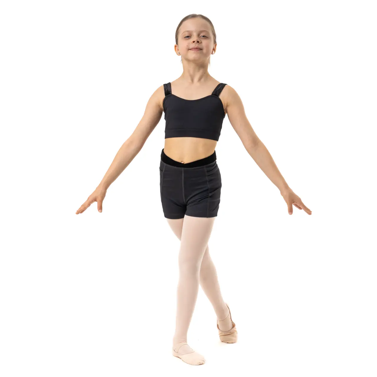 Flexible, elastische Shorts mit höherem Bund, mit Samt eingefasst, halten Mädchen bei einfacheren wie auch anspruchsvolleren Bewegungen bequem. Seitliche Taschen auf beiden Seiten sind eine angenehme Überraschung.