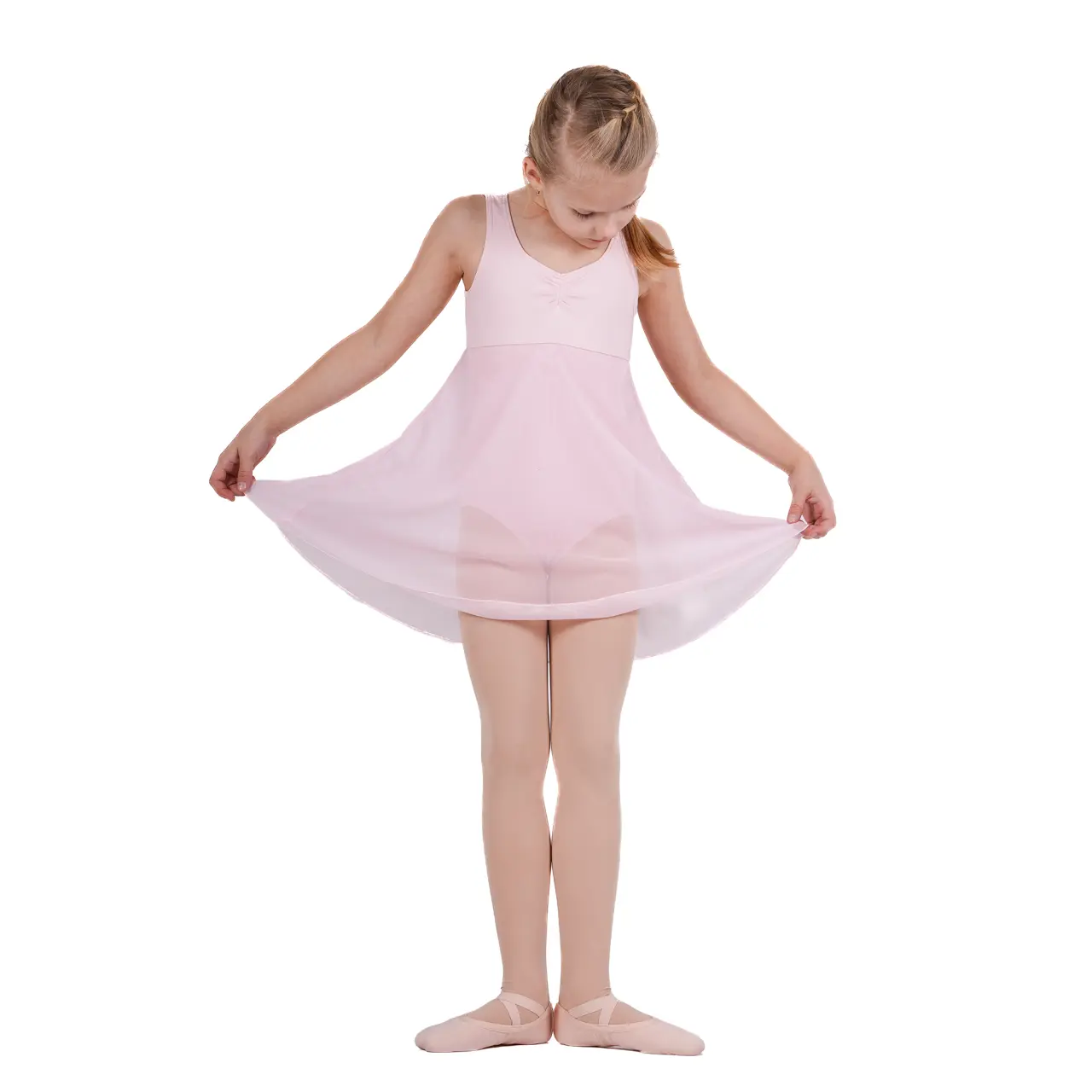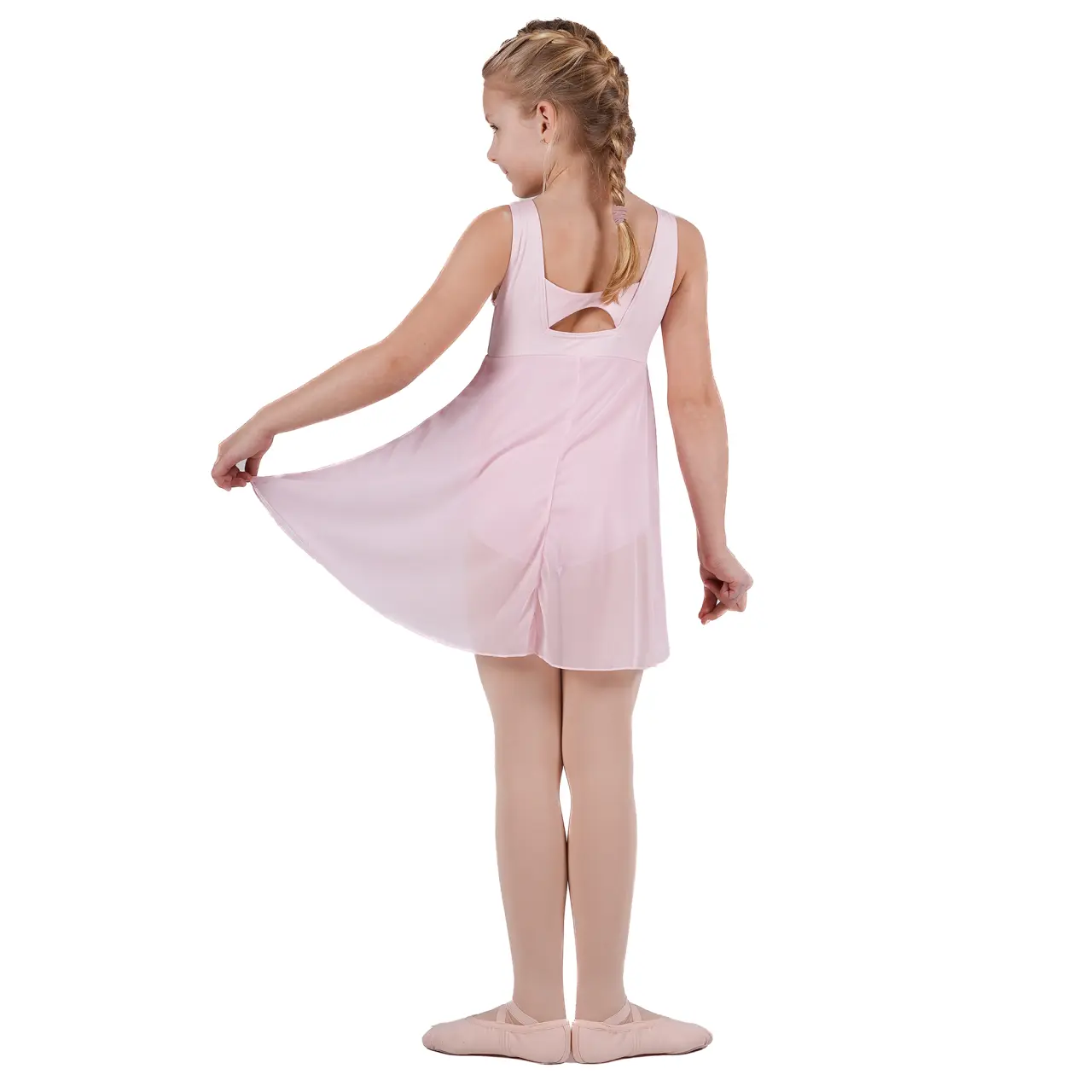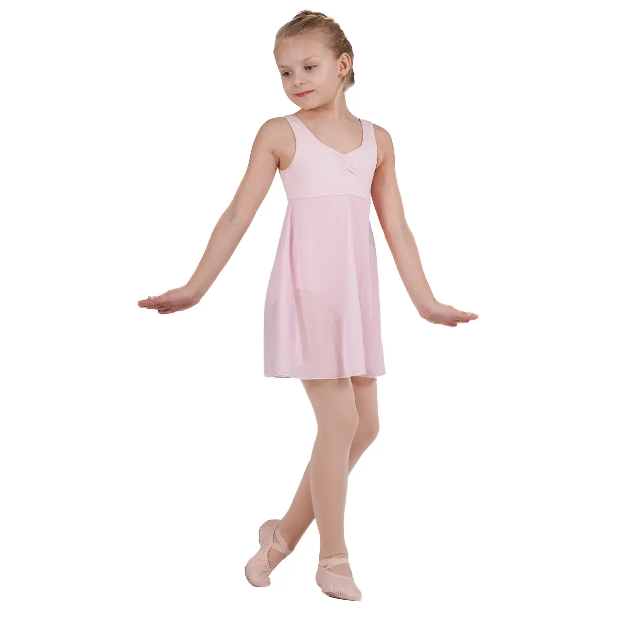 Einfache, glatte Linien dieses Mädchenkleides unterstreichen die Bewegung auf wunderschöne Weise. Breite Träger bieten zusätzlichen Halt und ermöglichen gleichzeitig freie Bewegungsfreiheit. Das Röckchen beginnt unter der Brust, wodurch ein zarter und anmutiger Look entsteht, der Ballerinen ein nobles Gefühl verleiht. Der vordere Teil ist leicht gerafft, was ihre Schönheit betont und das Gefühl von Leichtigkeit beim Tanzen verstärkt. Sie eignen sich natürlich auch für Tanzaufführungen.