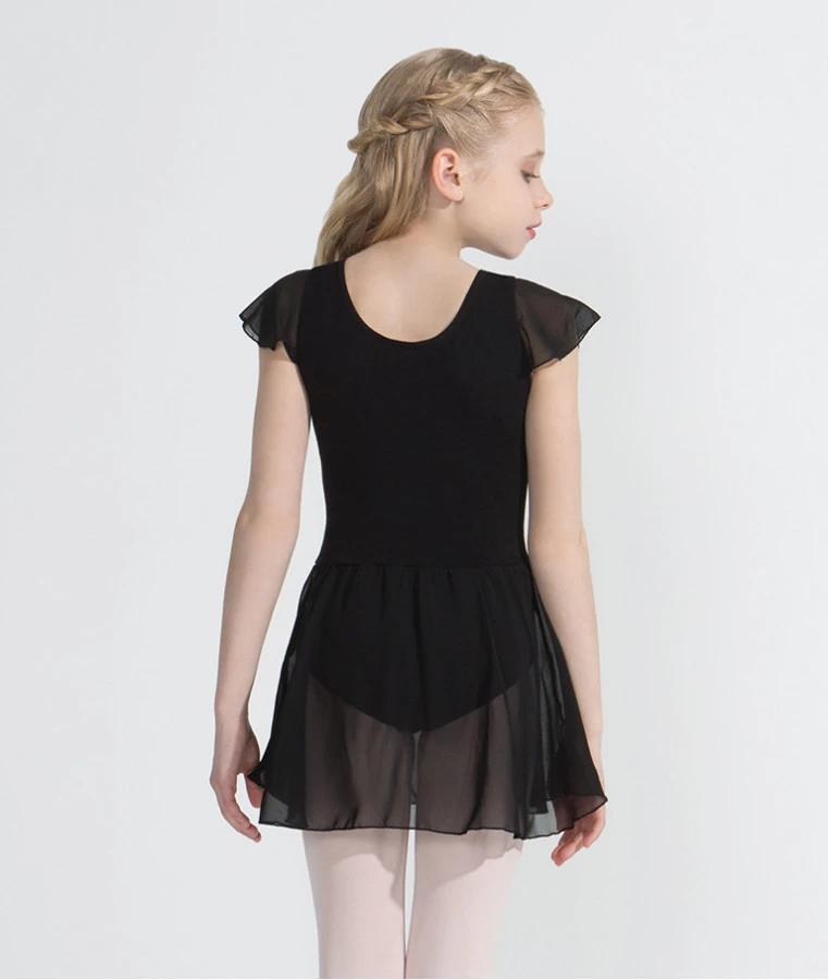 Ein wunderschönes, zartes und hübsches Tanztrikot mit Röckchen. Ärmel und Röckchen sind aus 100% Chiffon gefertigt und wirken bei Bewegung sehr leicht. Das Trikot selbst besteht aus 90% Nylon und 10% Spandex. An der Brust ist es leicht gerafft. Der Rücken ist nicht ausgeschnitten, sondern hat einen zarten, bogenförmigen Ausschnitt.