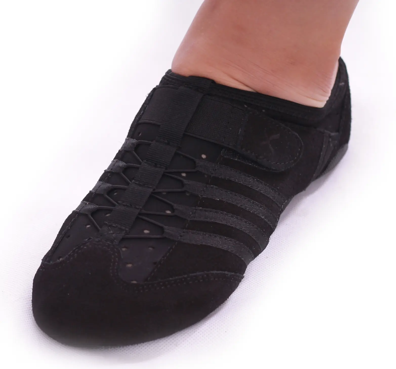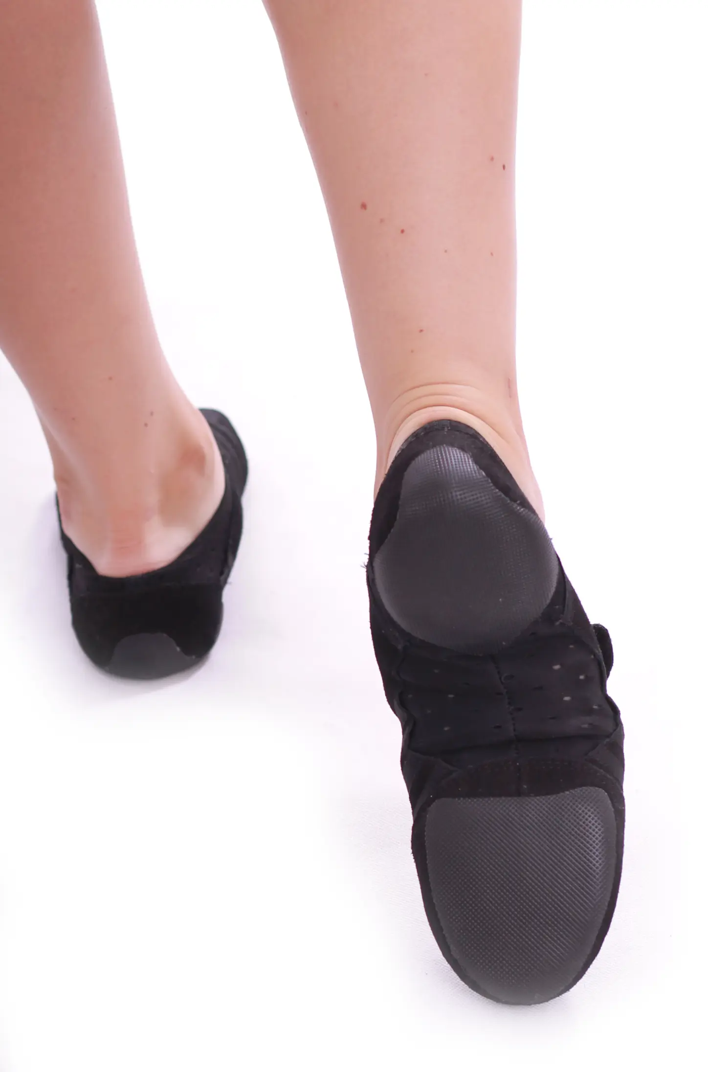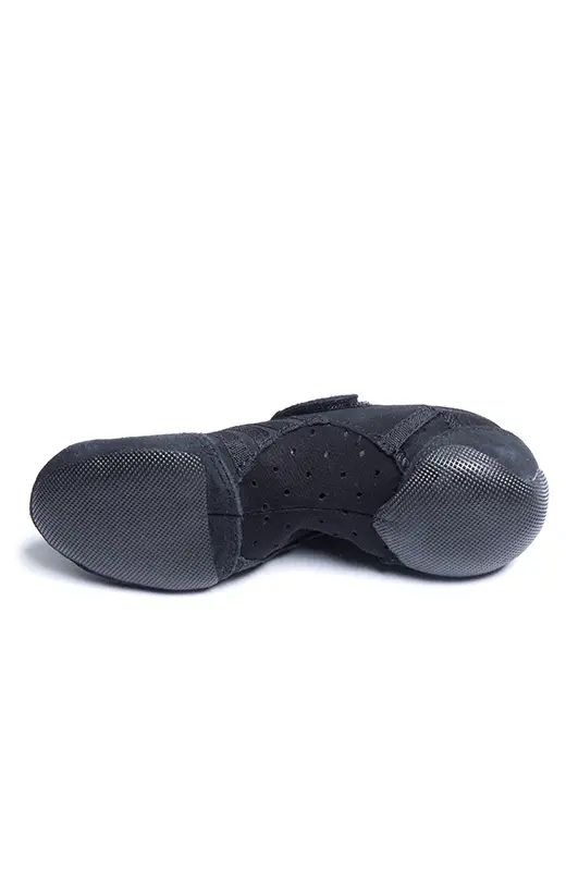 Jazzschuhe mit geteilter Sohle und verstellbarem Klettverschluss. Das Obermaterial ist aus Wildleder, außerdem wird perforiertes Neopren sowie elastische Elemente verwendet. Die Schuhe bieten dem Fuß des Tänzers ausreichenden Halt und sind zugleich atmungsaktiv. Am Spann liegen sie eng an. Die geteilte Gummisohle sorgt für Flexibilität. Die Capezio Jag Schuhe – stehen zudem für einfaches An- und Ausziehen. Häufig verwendet für Disco Dance, sind langlebig und sitzen sehr gut am Fuß.
