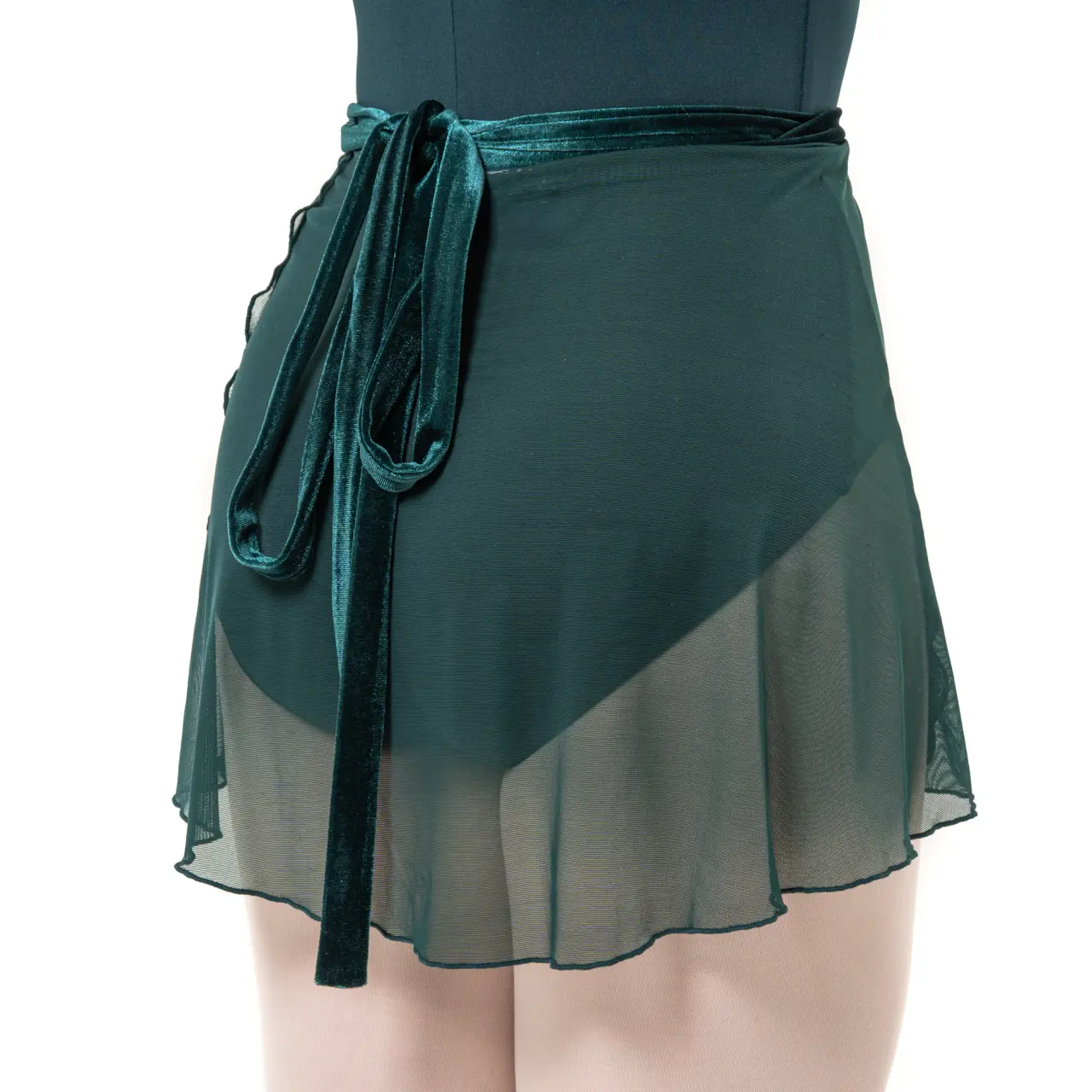 Das Samtdetail verbindet den Rock optisch mit den Trikots derselben Kollektion (Aspen oder Pine Leotard). Der Rock ist nicht gerafft, sondern gerade geschnitten, wodurch die Hüften nicht breiter wirken. Er gehört zu den kürzeren Modellen.