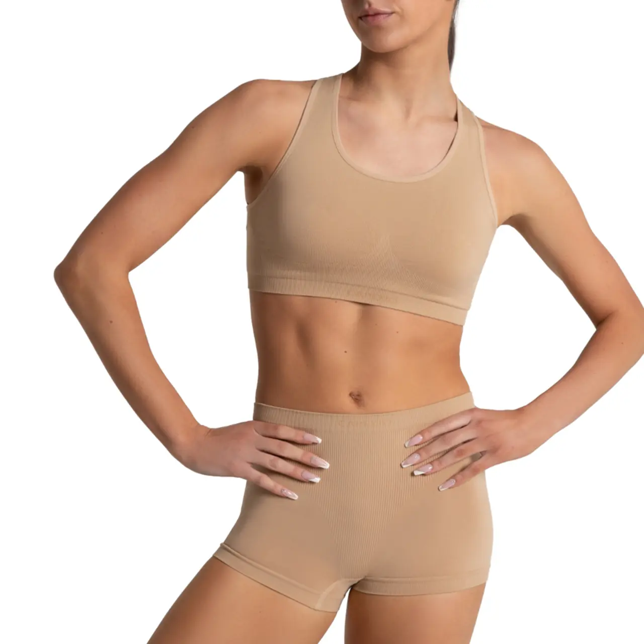 Elastische, weiche Untershorts ohne Seitennähte bieten eine bequeme, körpernahe Passform. Strategische Rippung des Materials im Vorder- und im Rückenbereich in Tanga-Form vermittelt ein sicheres Gefühl. Ideal unter Kleidern, Kostümen und verschiedener Tanzbekleidung. Hergestellt aus 92% Nylon und 8% Spandex.