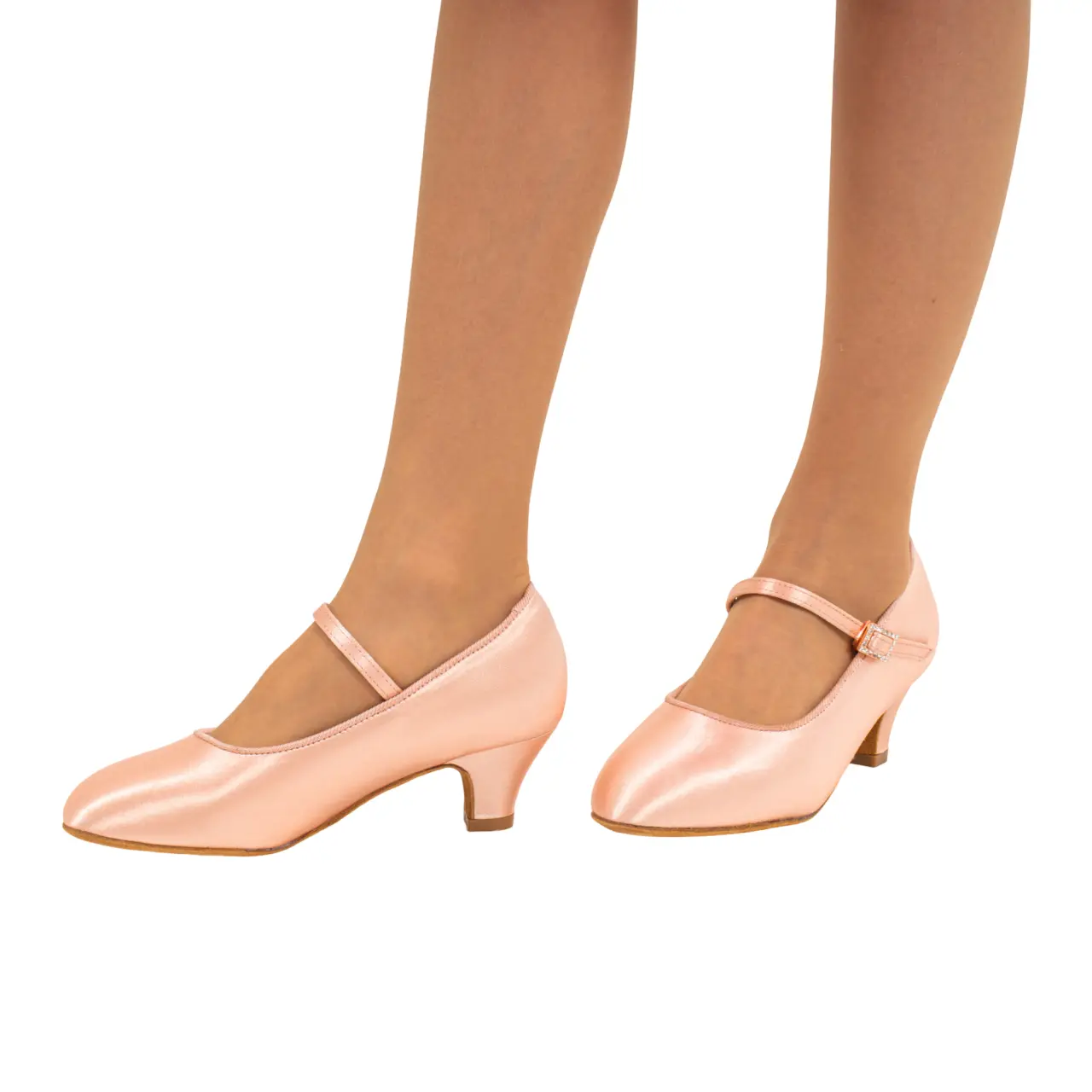Das Obermaterial ist aus hochwertigem Satin in heller Flesh-Farbe mit einem zarten rosa Schimmer gefertigt, der sehr fein und mädchenhaft wirkt. Die helle Farbe kommt auf dem Parkett schön zur Geltung und lässt sich leicht mit Tanzkleidern kombinieren.
