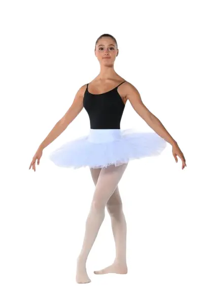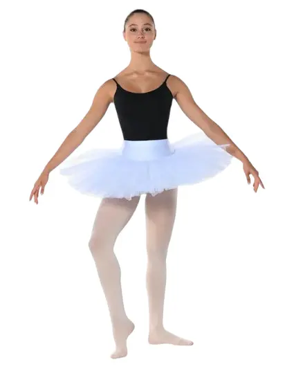 Hochwertiger, bis zu 7-lagiger Rock mit elastischem Bund. Der Rock hat eingenähte Höschen. Er ist ideal für Trainings und Tanzschulen. Material: 92% Nylon, 8% Spandex.