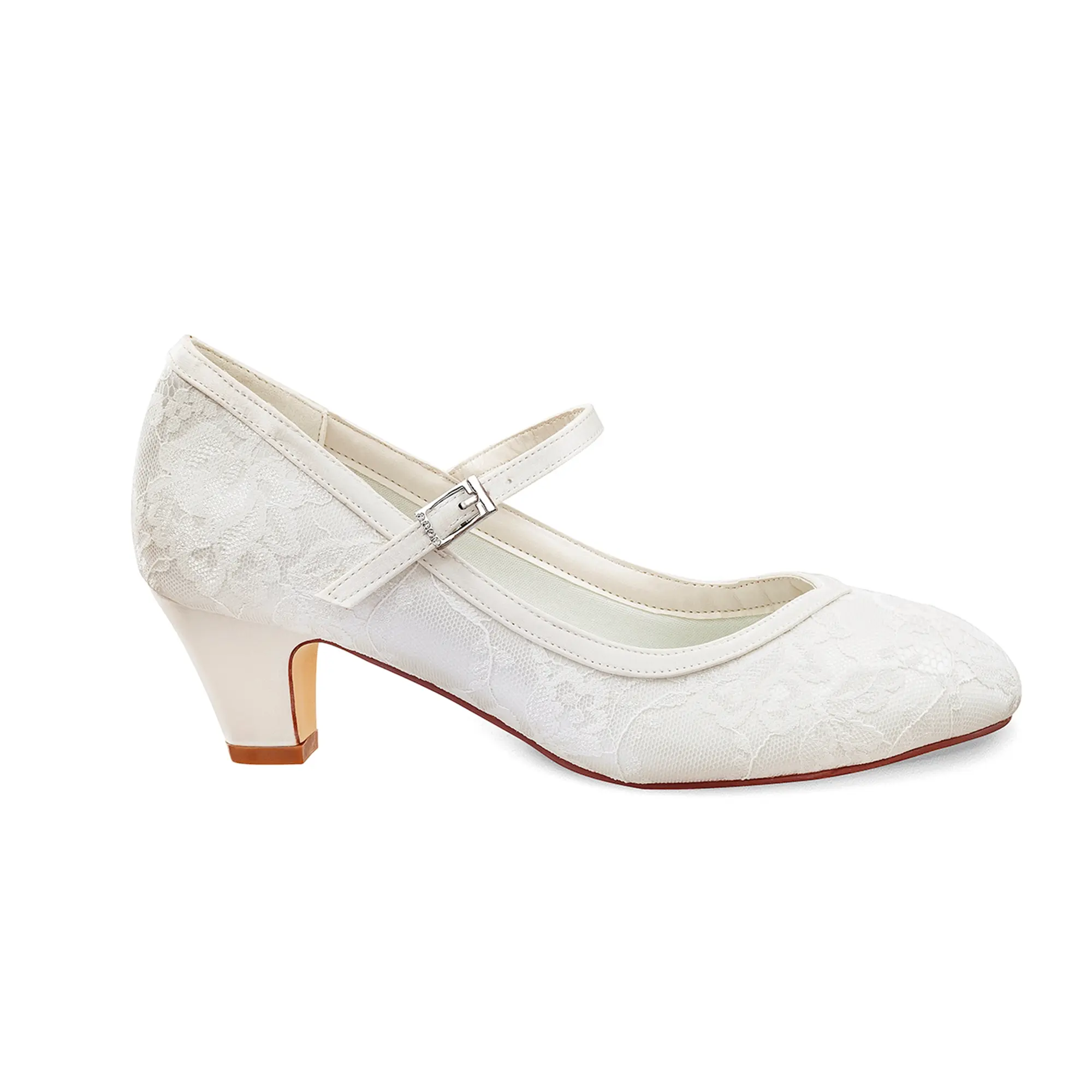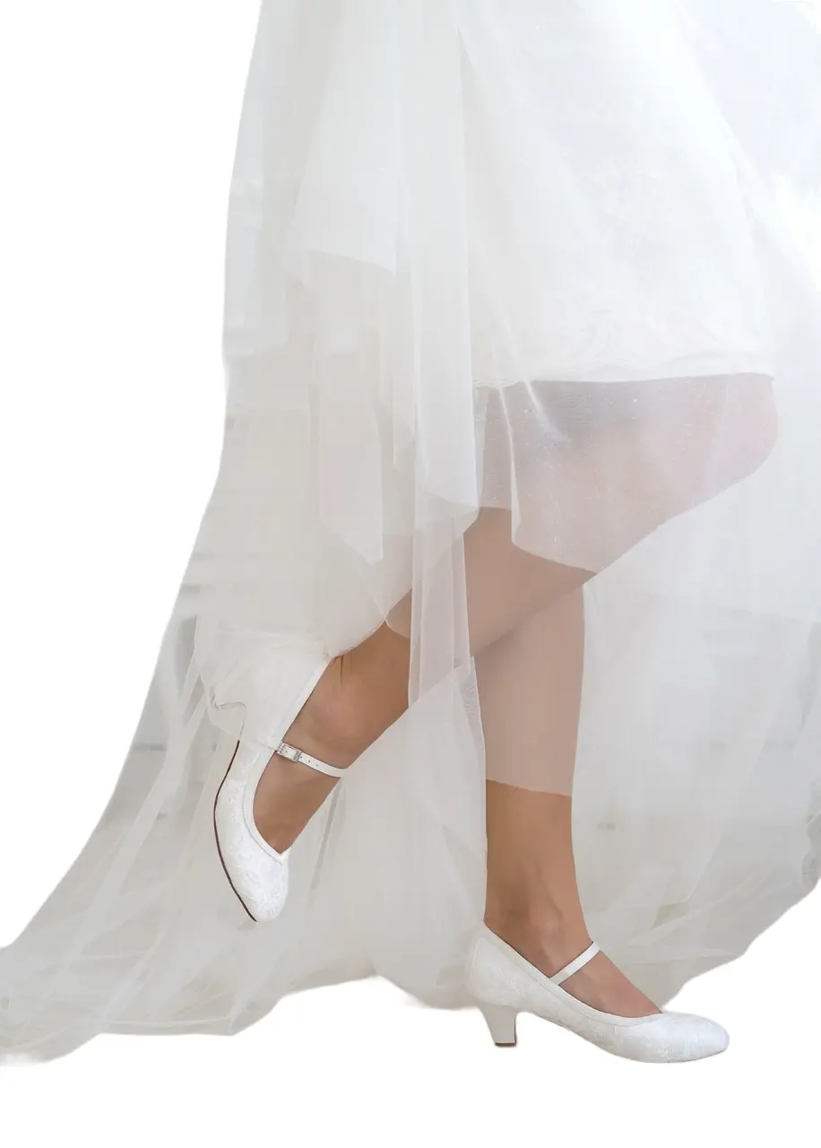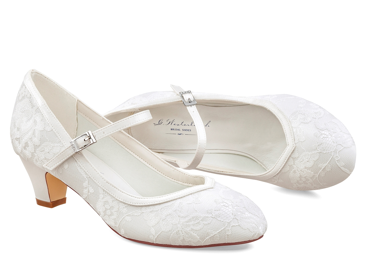 Zeitloser Klassiker unter den Hochzeitsschuhen mit bequemem 5 cm Absatz. Die Schuhe sind vollständig aus Spitze, die innere Lederdecksohle ist perfekt gepolstert. Geeignet für mittelbreite bis auch breitere Fußtypen. Die Sohle ist stabil und auch für den Außenbereich geeignet.