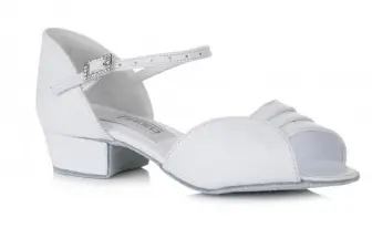 Tanzschuhe für kleine Tänzerinnen mit offener Spitze, gefertigt aus hochwertigem weißem Leder. Die Schnalle am Riemen über dem Spann ist mit Kristallsteinchen verziert. Der Absatz ist 3,81 cm hoch. Die Sohle ist weich, aus Wildleder.