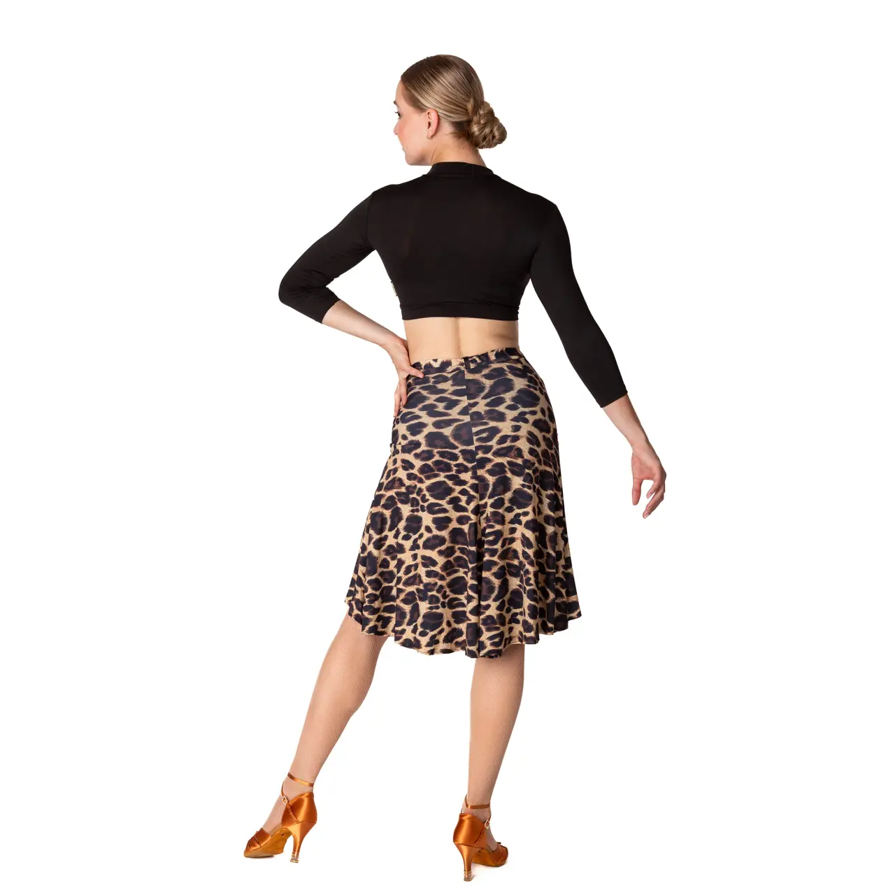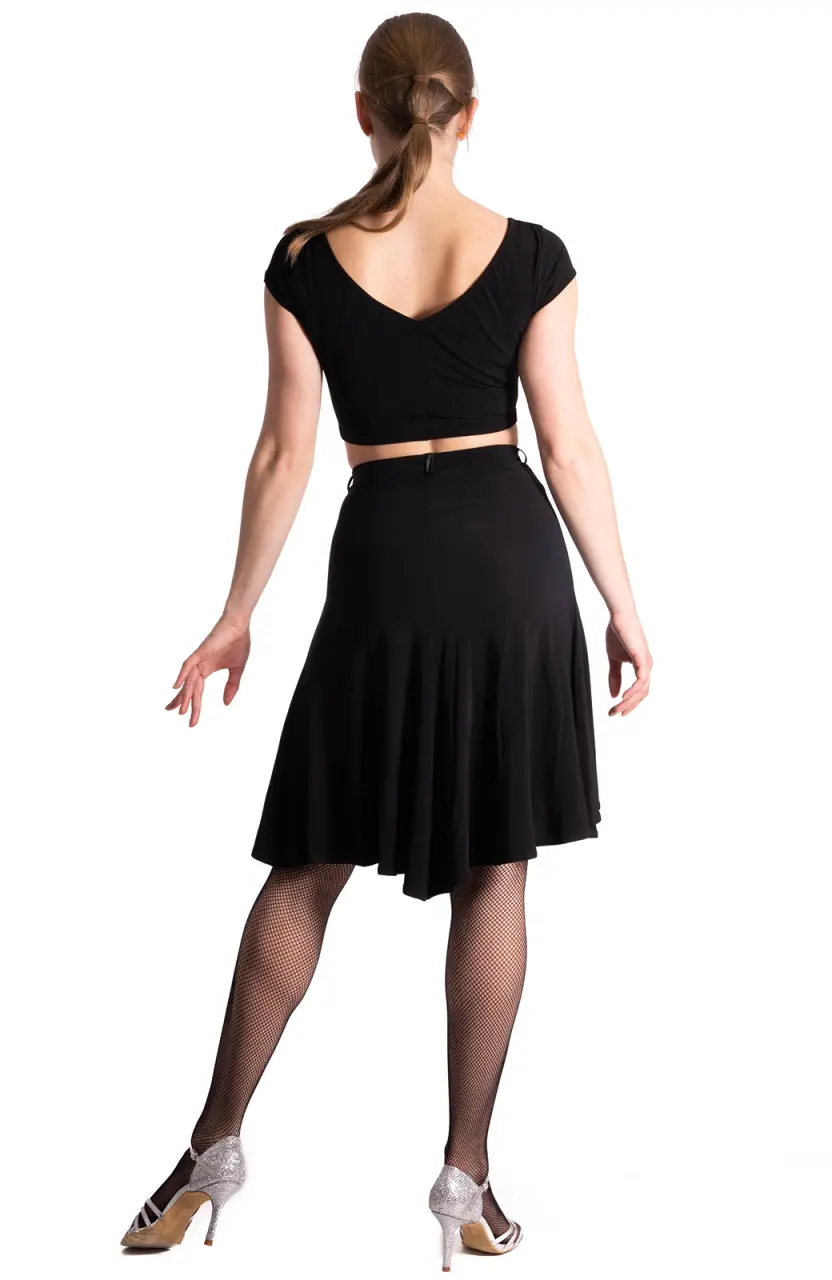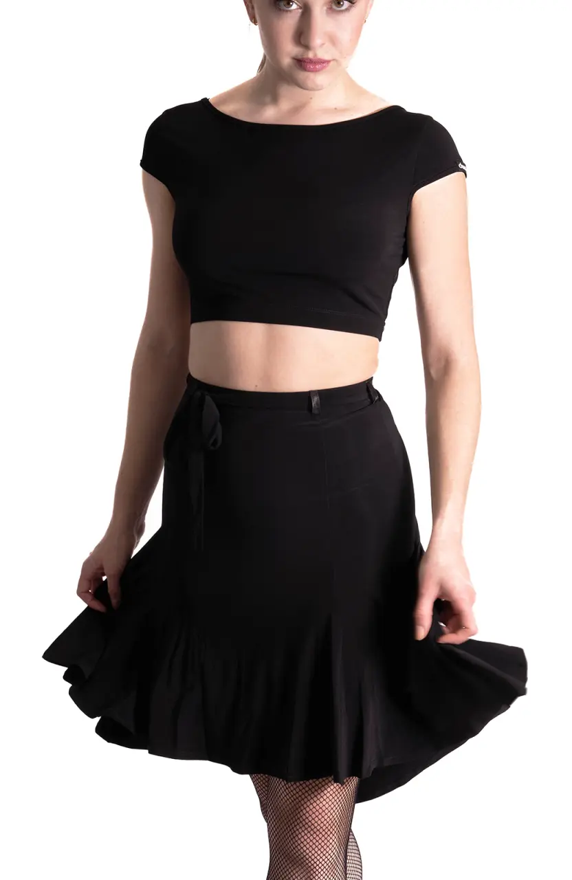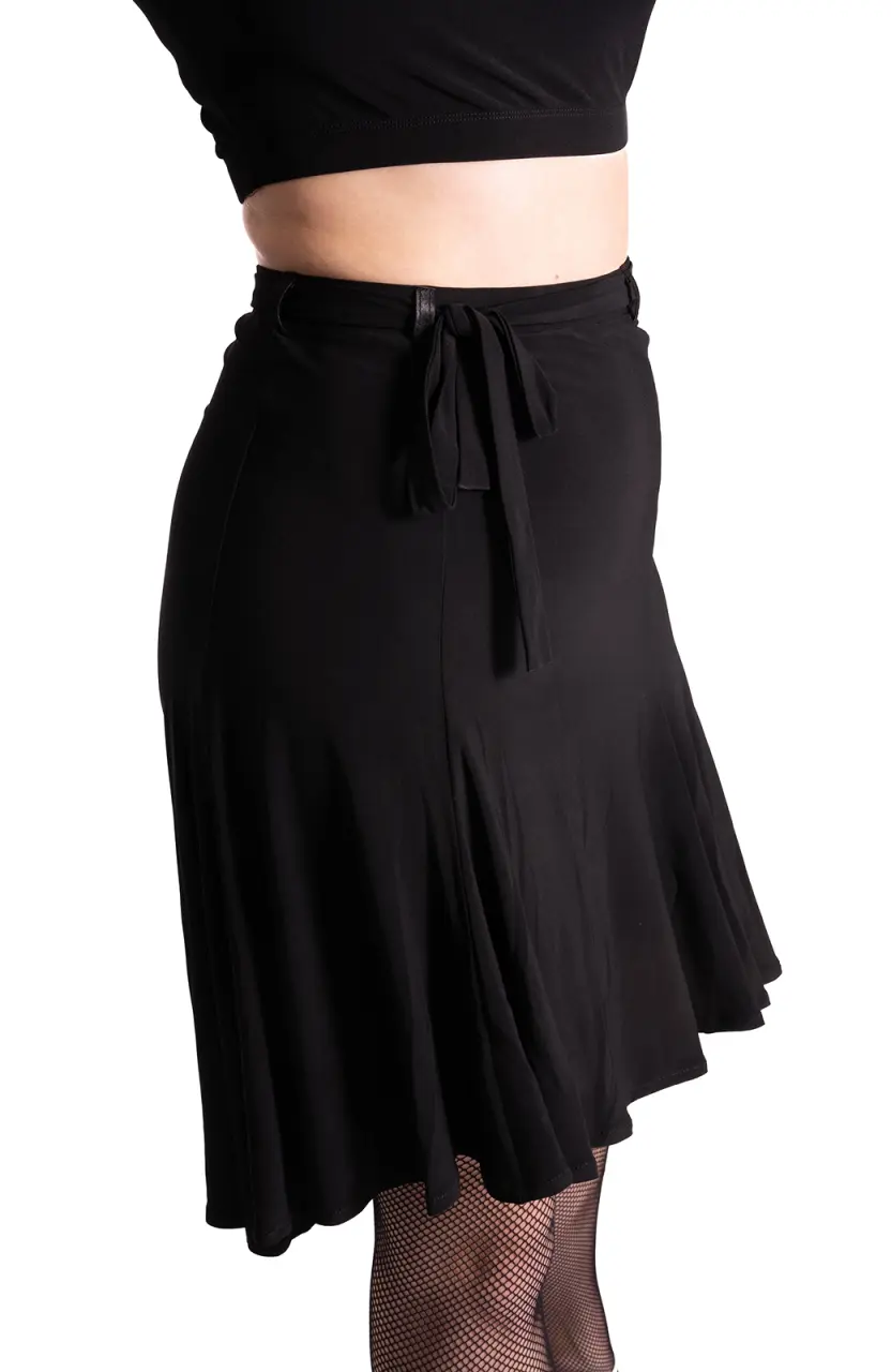 Raffiniert geschnittener Rock aus fünf Teilen, nach unten ausgestellt, mit Satin-Schlaufen und Stoffgürtel aus dem gleichen Material wie der Rock selbst am flachen Bund (ca. 3 cm breit). Vorne ist er etwas kürzer und lässt so die Arbeit der Knie hervortreten. Material: Polyamid, Elastan, Spandex.