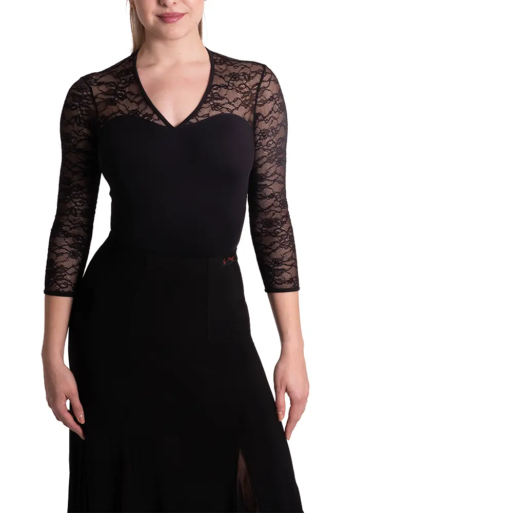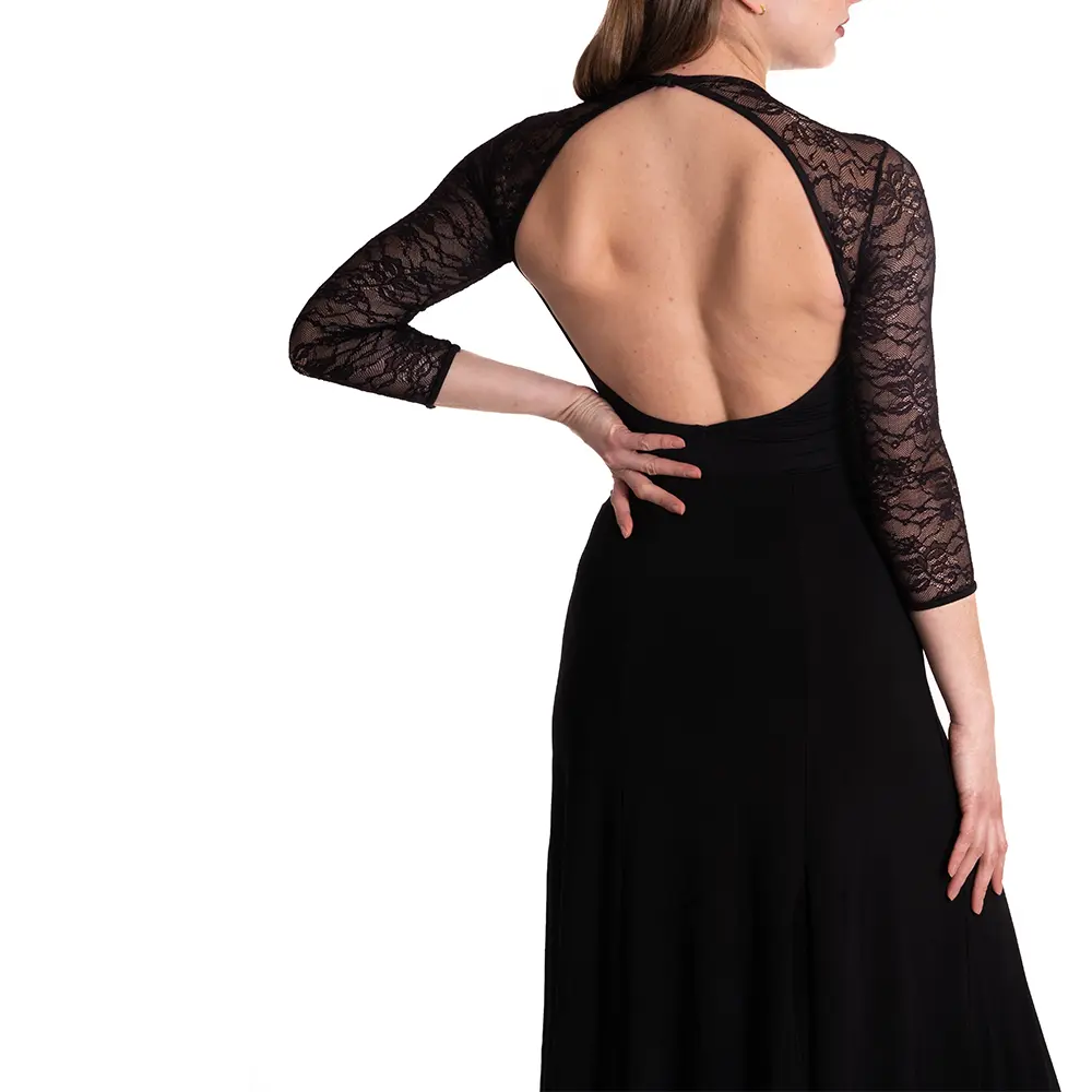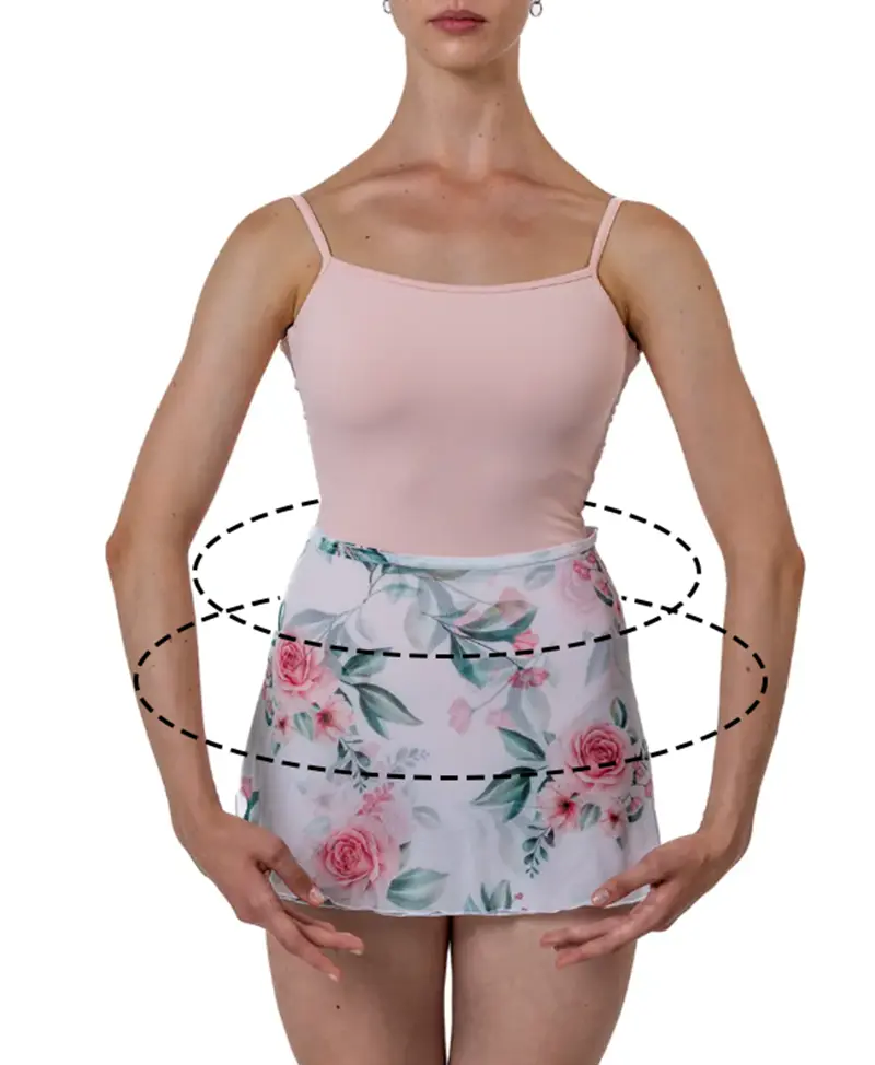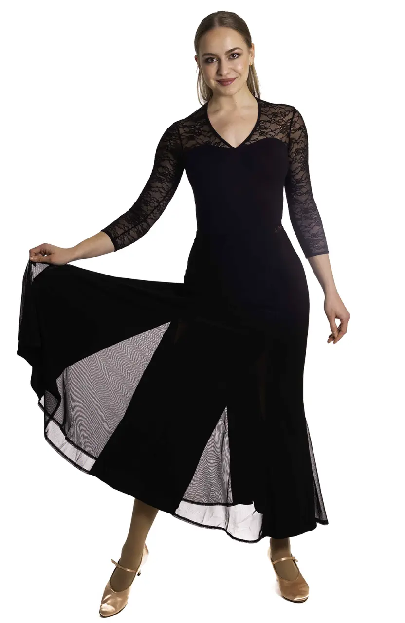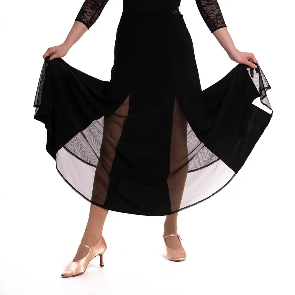 Trainingsrock für Standardtänze – elastisch, fließend. Er ist aus sechs blickdichten Bahnen geschnitten, zwischen die ein transparenter Keil eingenäht ist. An den Seiten liegt er eng an und wird Richtung Knöchel weiter. Der Bund ist elastisch. Das Material, aus dem er gefertigt ist, gehört zu den pflegeleichten. Er wird in kaltem Wasser mit einem milden Waschmittel gewaschen und zum freien Trocknen aufgehängt.