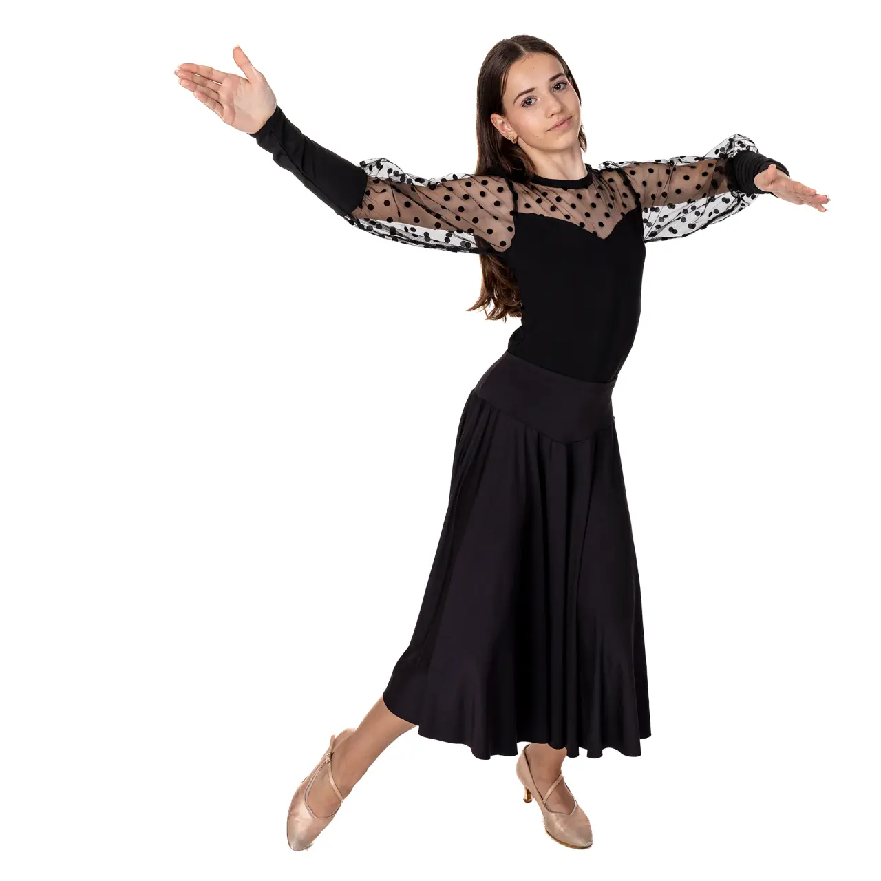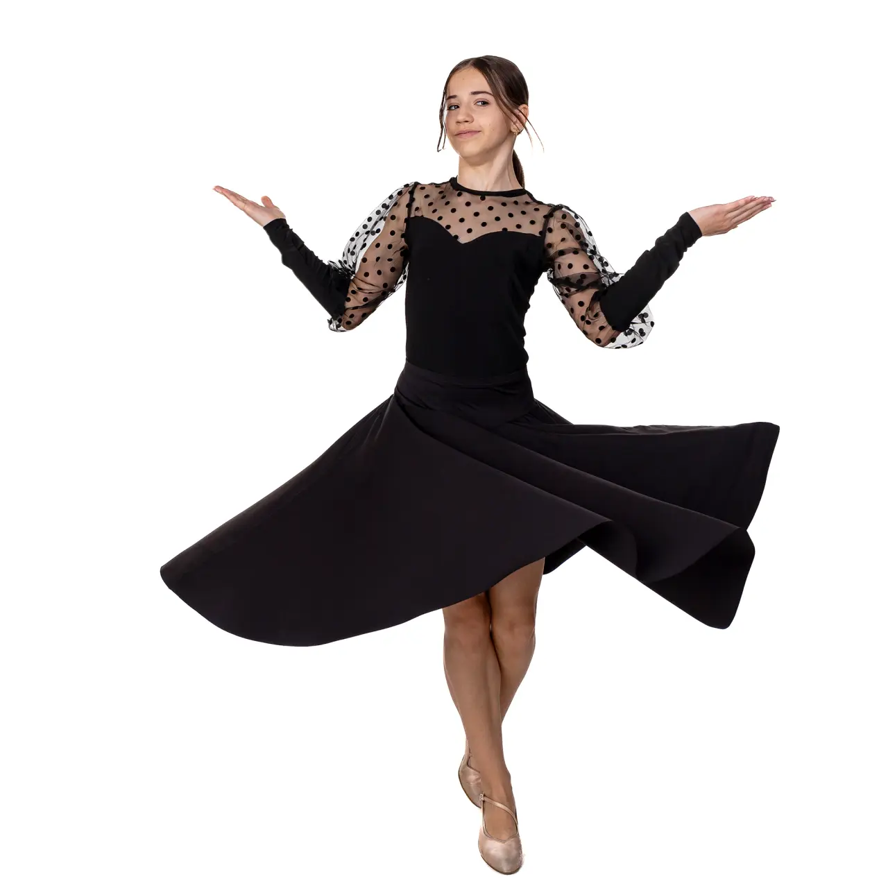 Eleganter, charmanter Schnitt mit transparenten Ärmeln. Die Punkte unterstreichen diesen zeitlosen Stil. Es ist aus einem weichen, elastischen Material gefertigt. Das Trikot hat einen tieferen Beinausschnitt. Material 100% Polyester. In kaltem Wasser von Hand waschen und frei trocknen lassen.