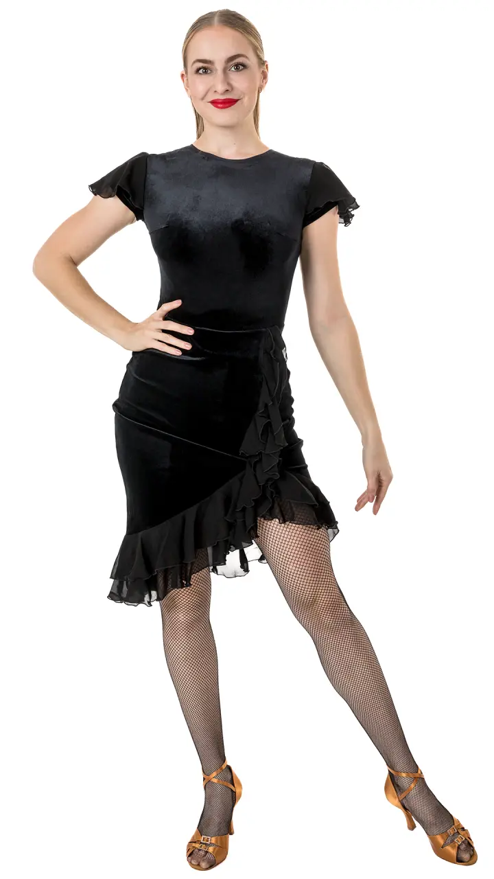 Das Kleid aus elastischem Samt wird durch leichten Chiffon an den Ärmeln sowie durch eine Applikation am Rock in Form eines Volants aufgefrischt. Es wirkt dezent. Dieses Modell hat eingenähte Höschen. Es wird über die Halsöffnung angezogen. Diese ist mit einem elastischen Band eingefasst. Das Kleid wird mit einem Schnellverschluss-Haken geschlossen. Material – elastischer Samt, Elasthan, Polyamid.