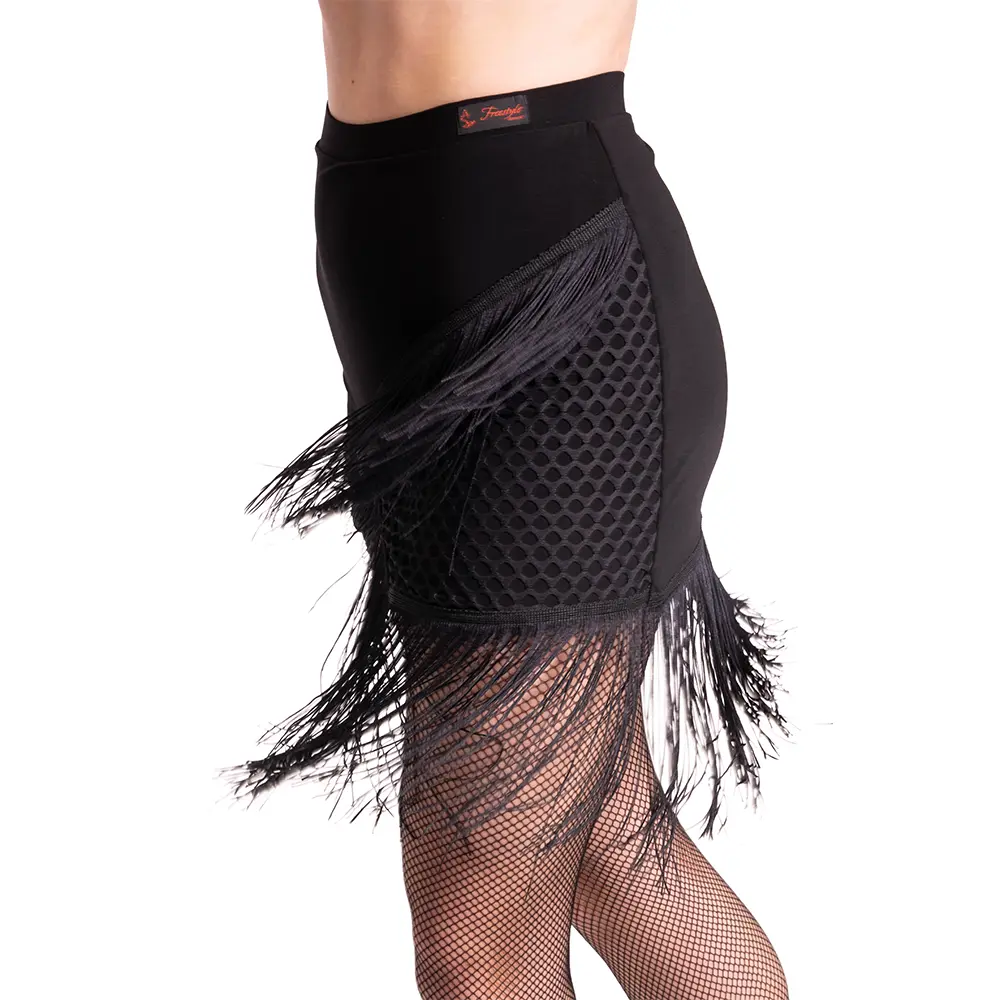 Dieser Rock ist wie gemacht für energiegeladene und selbstbewusste Tänzerinnen! Dank eingenähter Höschen können Sie bei jeder Bewegung auf Komfort vertrauen. Die Fransen sind nicht nur am Saum – vorne verlaufen sie „gewickelt“ Richtung Taille und erzeugen so bei jedem Schritt einen dynamischen und eleganten Effekt. Der Rock in Schwarz hat unter der Wickelpartie einen unterlegten Stoff mit Gittermuster.