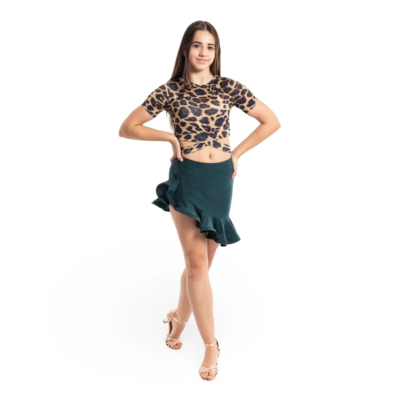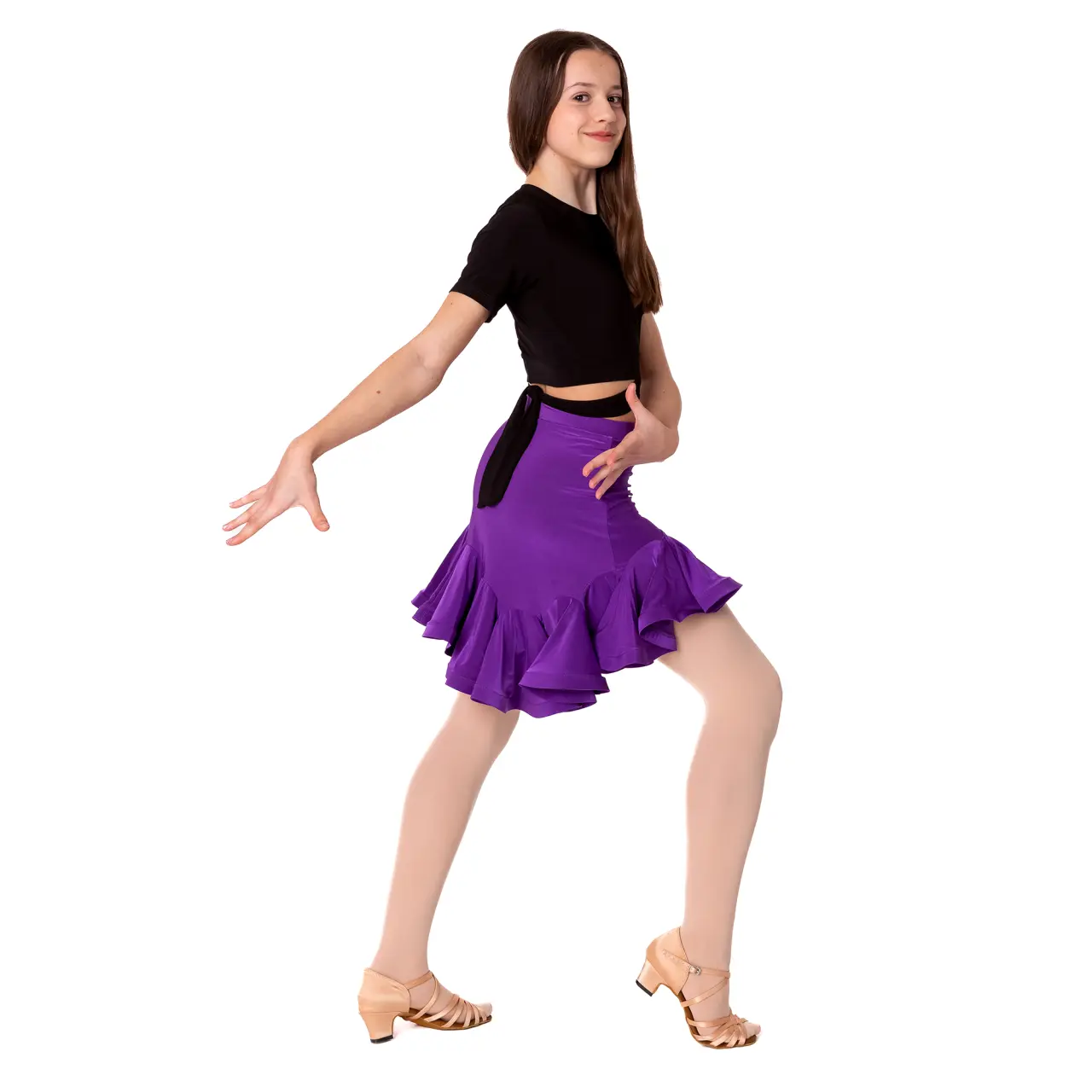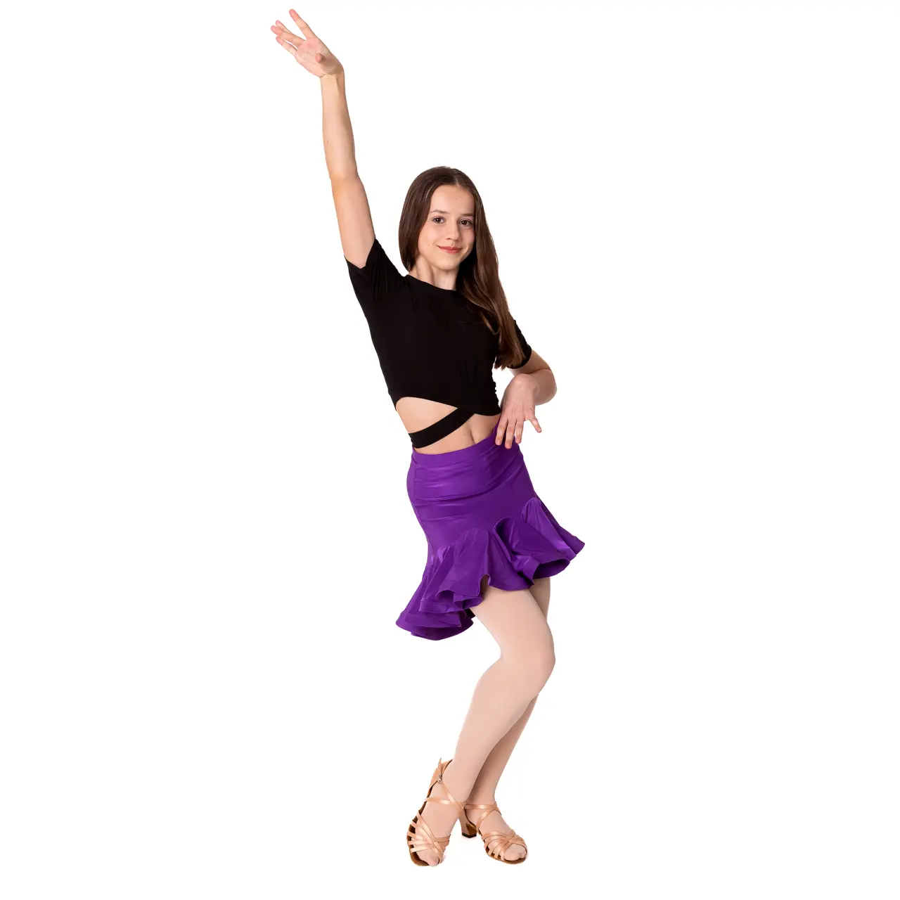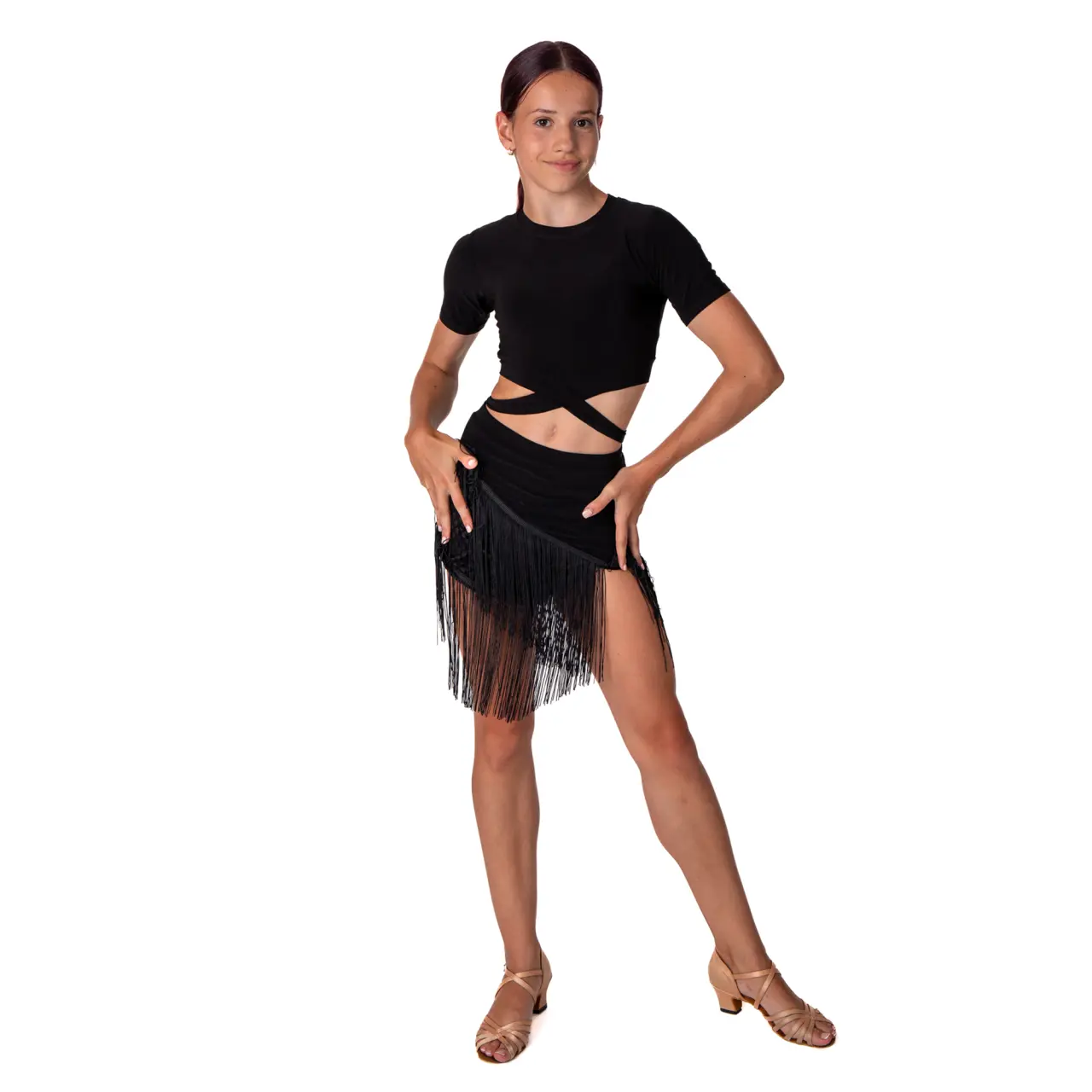 Der Top Beny ist das ideale Trainingsteil für alle jungen Tänzerinnen im Gesellschaftstanz und Showdance. Auf den ersten Blick wirkt er wie ein klassischer Basic-Top, doch sein stilvolles Detail im unteren Bereich wertet ihn sofort auf – ein angenähter Streifen aus demselben elastischen Material wird um die Taille gewickelt und erzeugt einen eleganten, dynamischen Effekt, der begeistert.