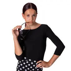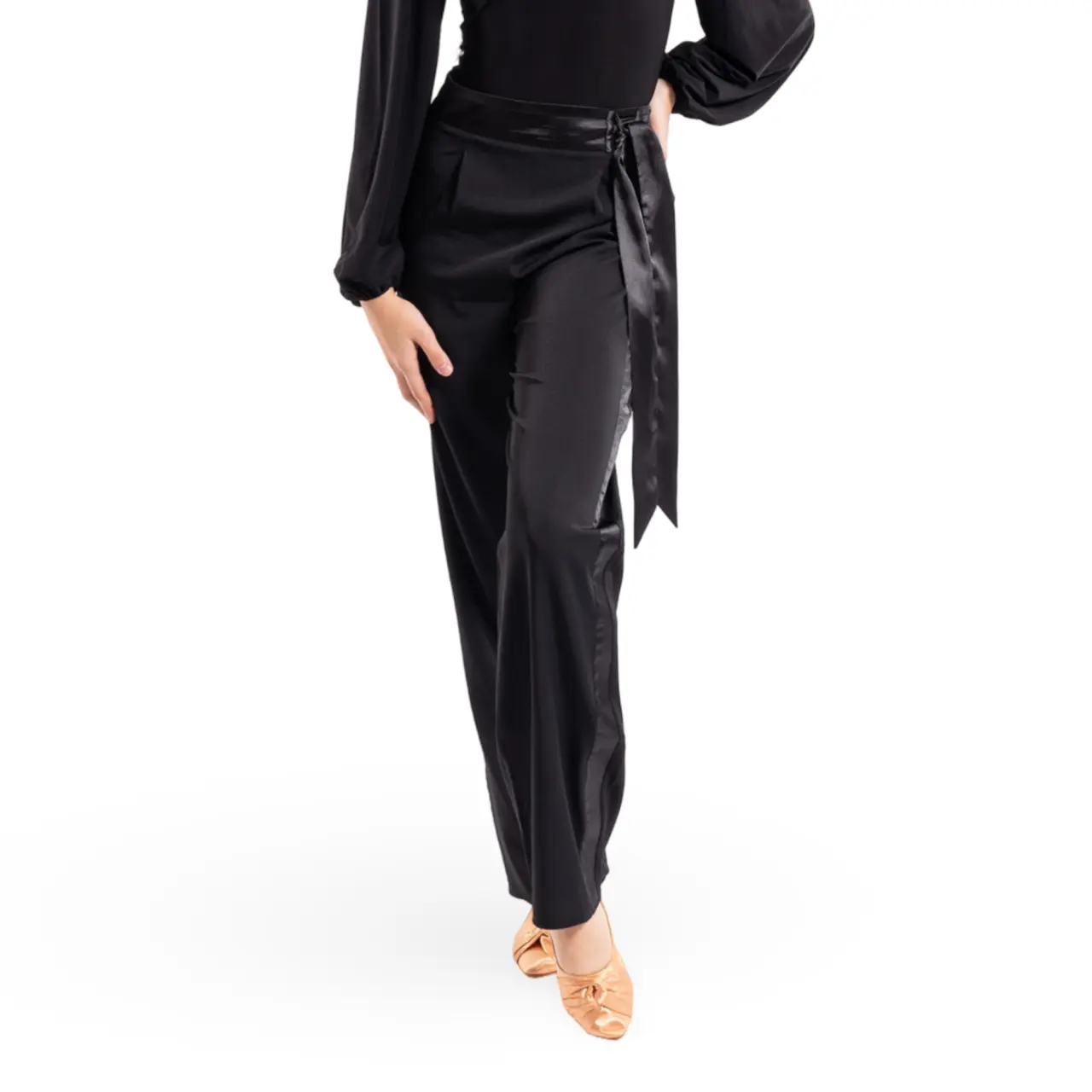 Emily, Mädchen-Trainingshose für Standardtänze, ist gefertigt aus festem, nicht elastischem Stoff. Der mit Satin verzierte flache Bund sowie die dekorative Bindung betonen die Eleganz des Modells.