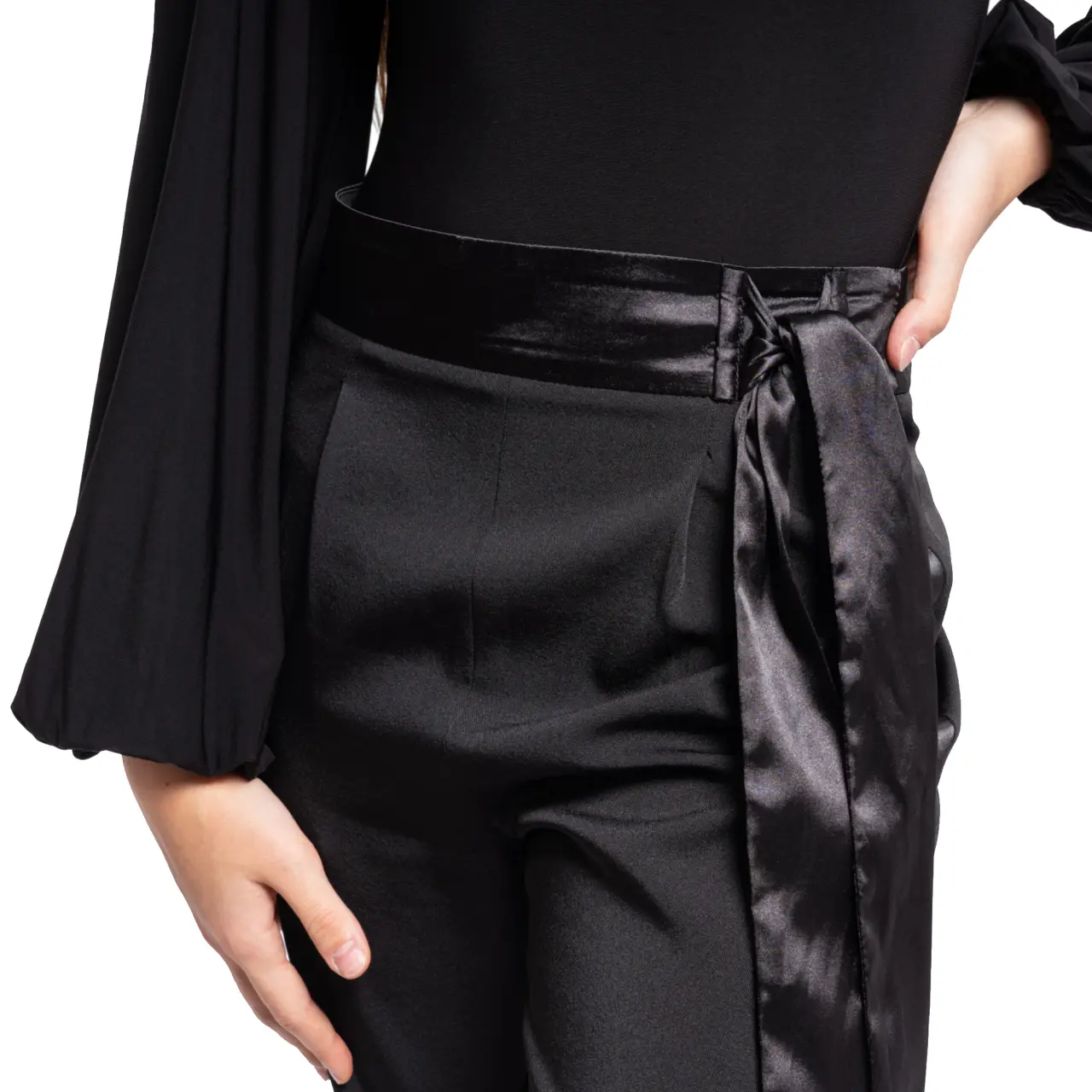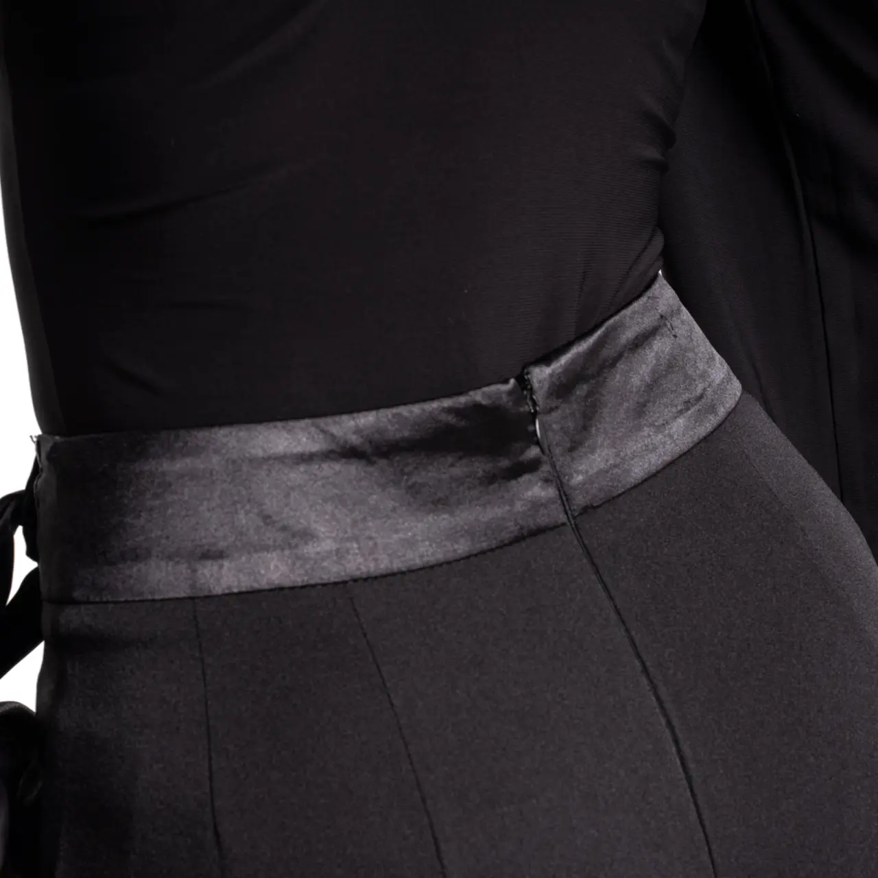 Der erwähnte Satin wird auch vertikal an den Seiten der Hose verwendet. Sie werden hinten mit einem Reißverschluss geschlossen und betonen zusammen mit feinen Abnähern den Taillenbereich und die Körperhaltung.