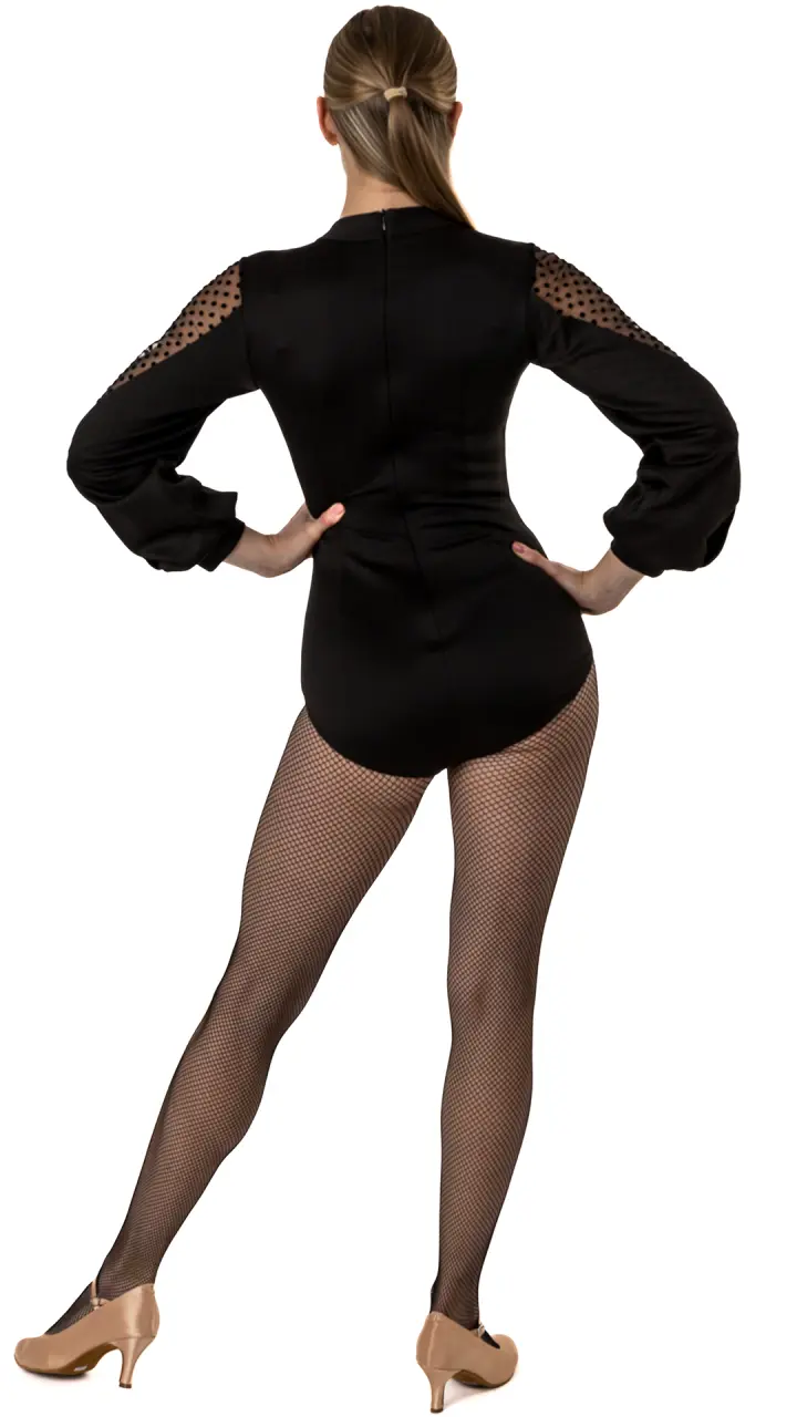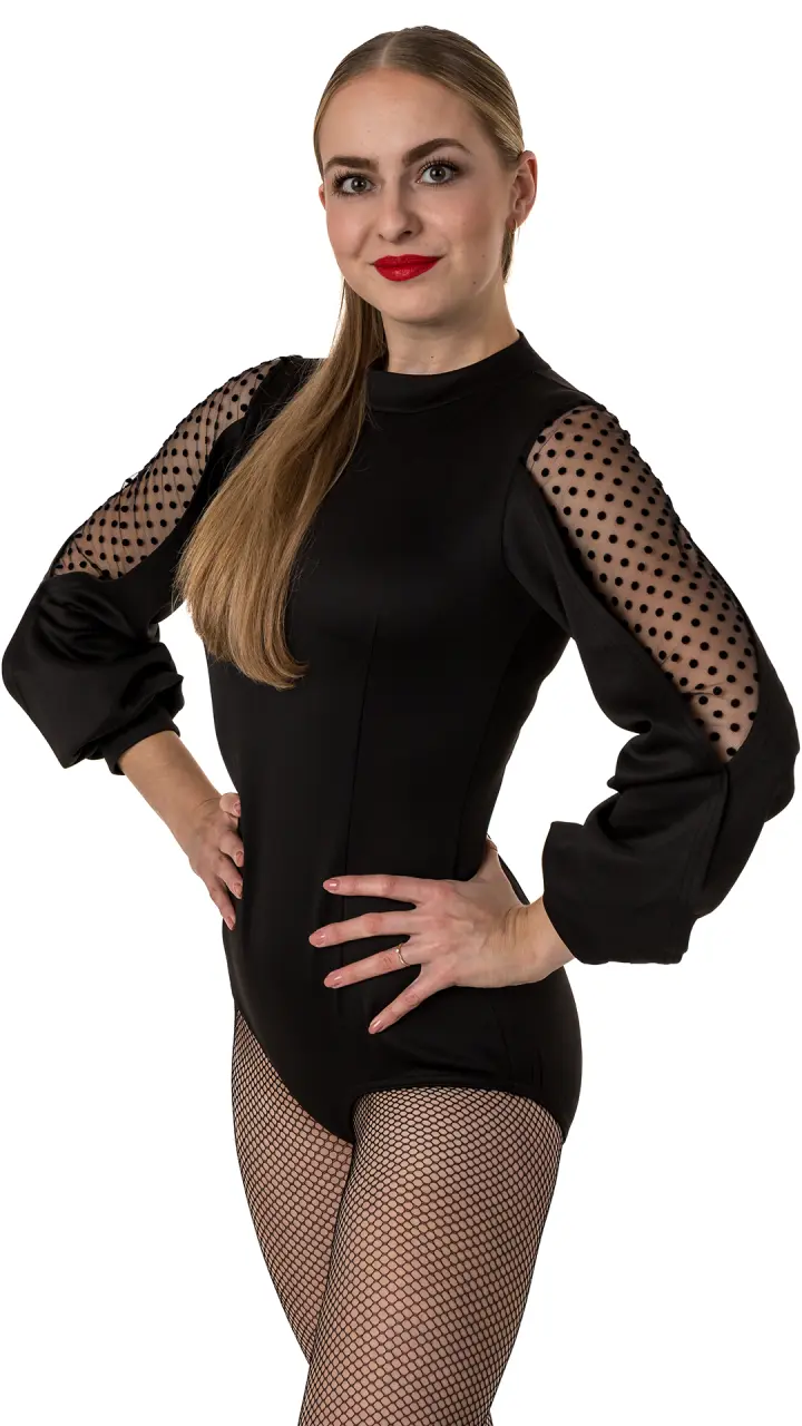 Body mit auffälliger Applikation an den Ärmeln. Transparenter Stoff mit feinen Punkten ist mit blickdichtem Stoff kombiniert. Die Ärmel sind ausgestellt und am Handgelenk gerafft. Wird hinten mit einem Reißverschluss geschlossen. Am Hals befindet sich ein feiner Stehkragen. Der Schnitt im Höschenbereich ist tiefer. Das Material ist fester (dabei leicht elastisch), blickdicht, formstabil und rutscht nicht. Ideal auch für Tanzabende. Material: 90% Polyamid, 10% Elastan.