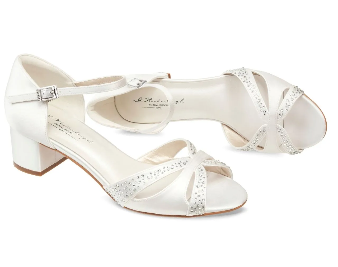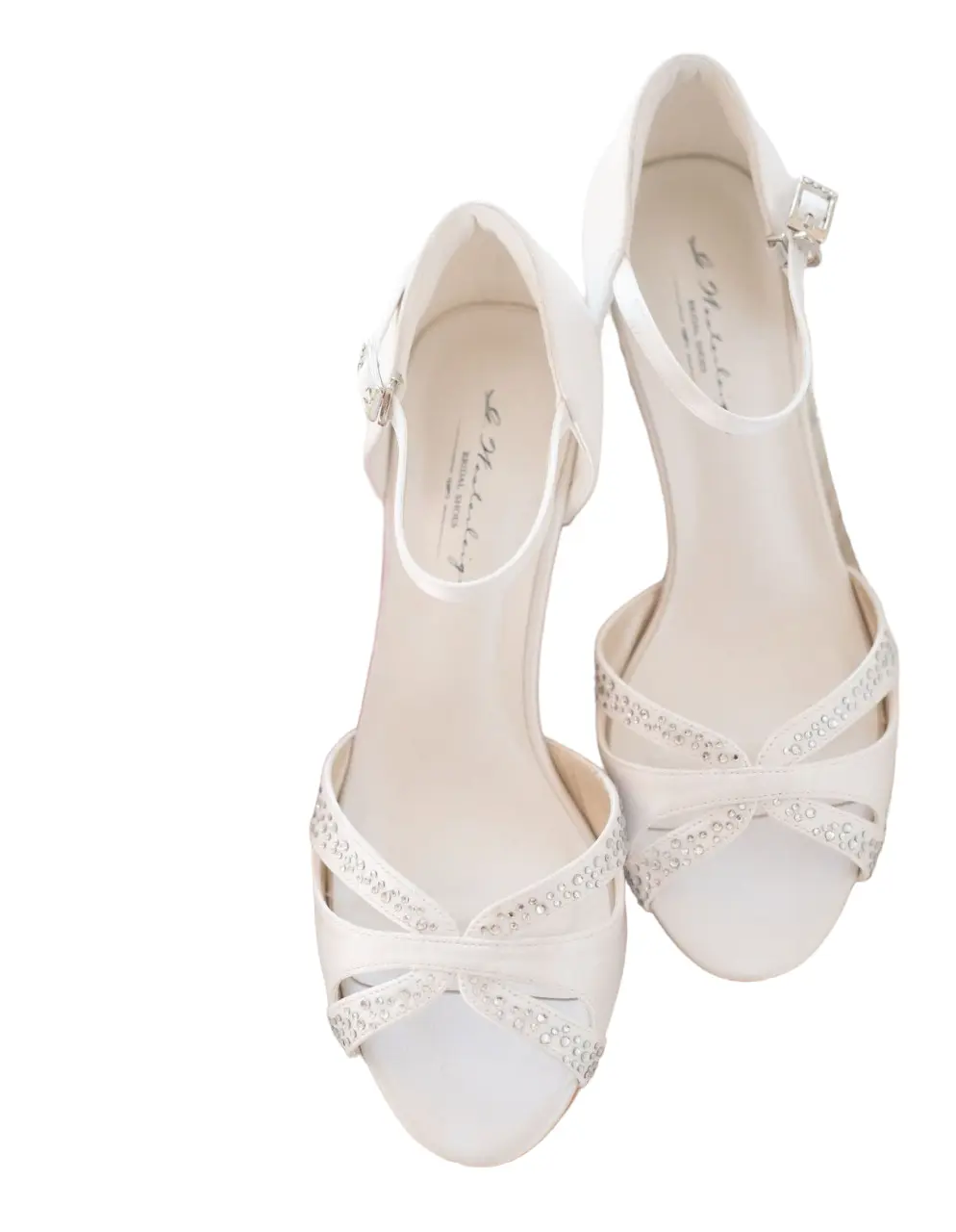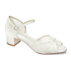 Handgefertigte exklusive Sandalen für die Braut erfreuen Auge und Füße. Der bequeme, breitere Absatz und die weiche Lederinnensohle mit Gelpolsterung verschönern Ihren großen Tag. Satinriemchen sind mit feinen glitzernden Kristallen verziert. Der Absatz ist 4,5 cm hoch.