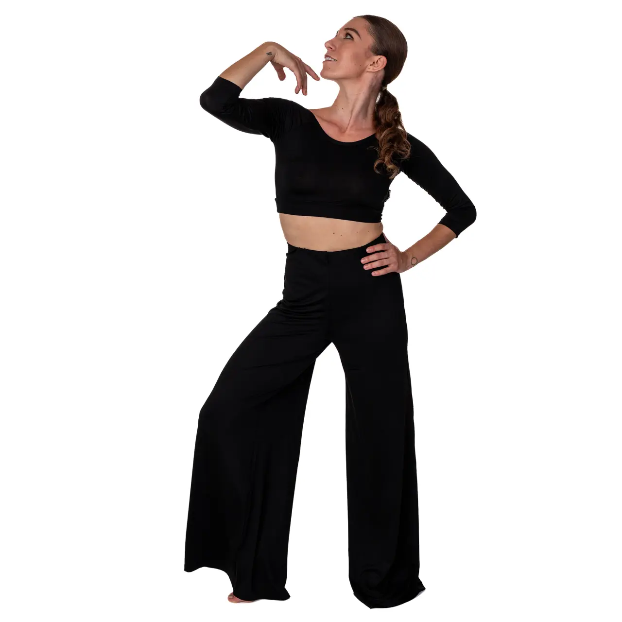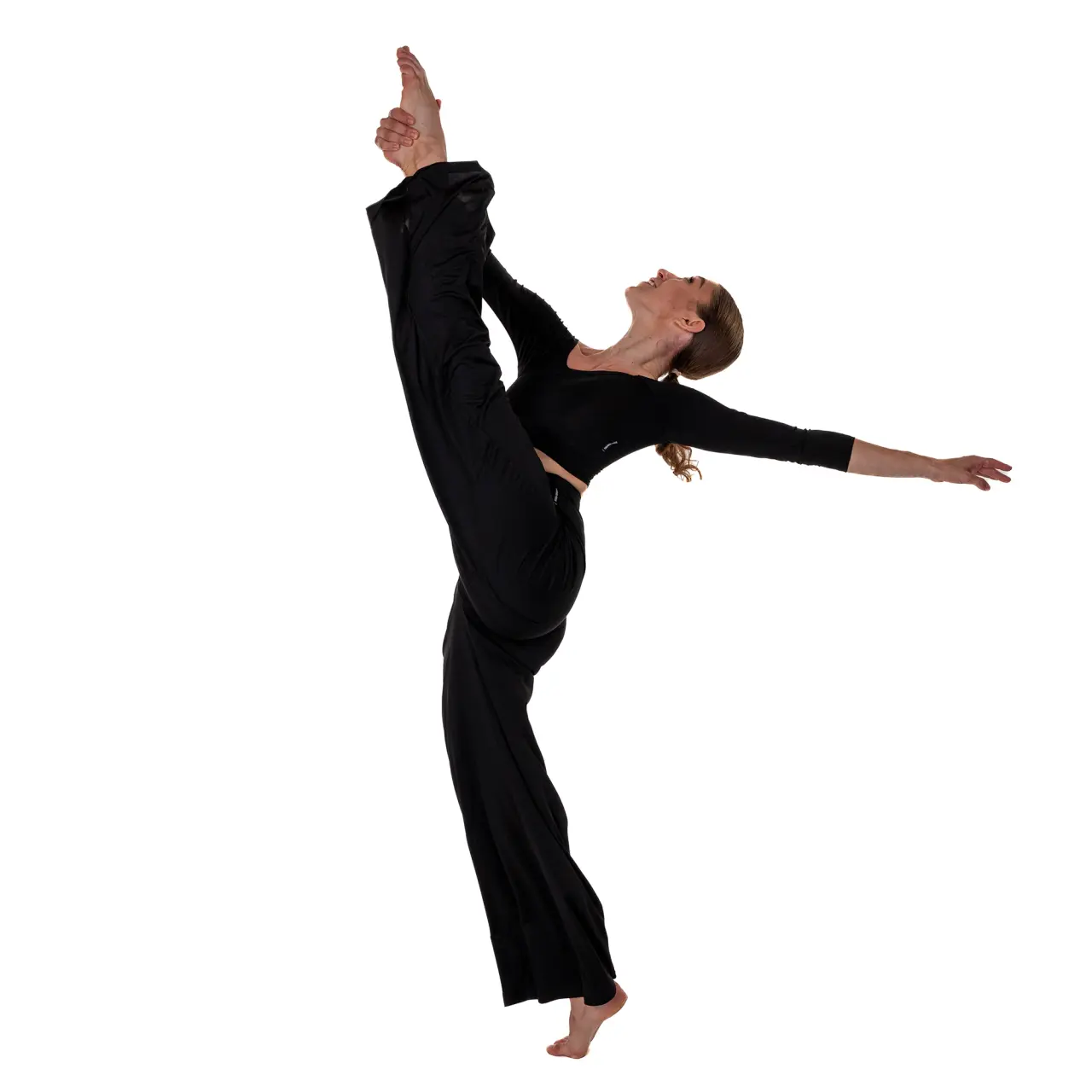 Die Hose aus elastischem Material hat glatte, klare Linien. In der Taille und an den Hüften liegt sie eng an, Richtung Knöchel ist sie weiter. Sie hat einen geraden Schnitt. Sie können sie auch als Tanzkostüm für Choreografien verwenden. Das Material Micropolyamid wird in kaltem Wasser mit einem milden Waschmittel gewaschen und zum Trocknen frei aufgehängt.