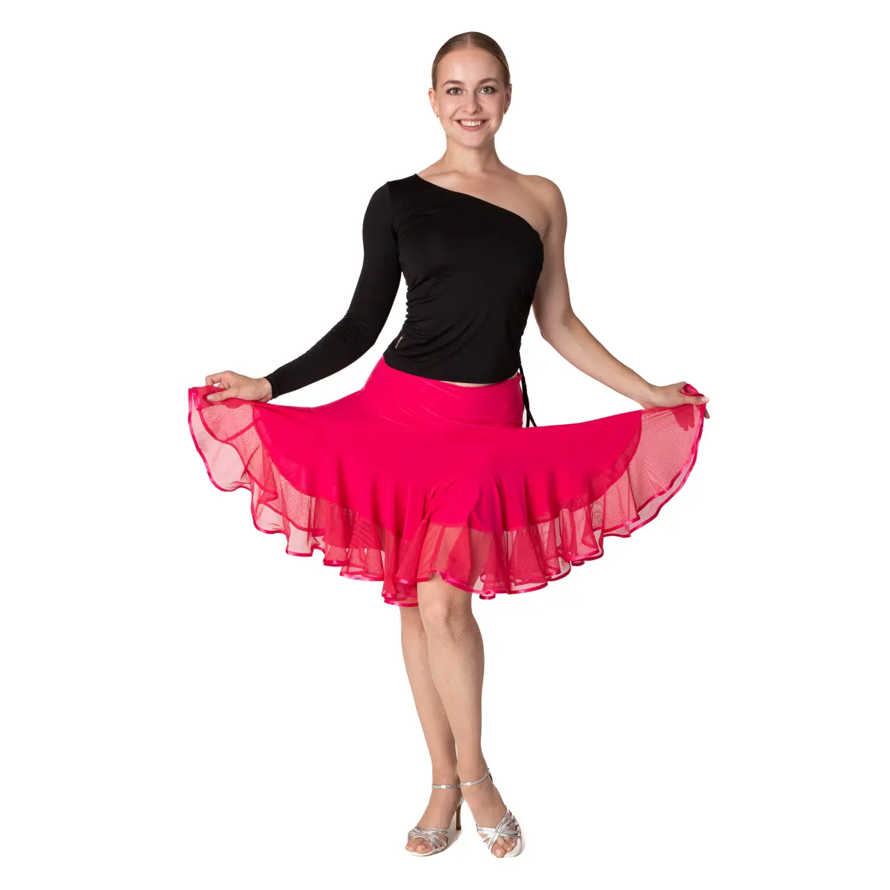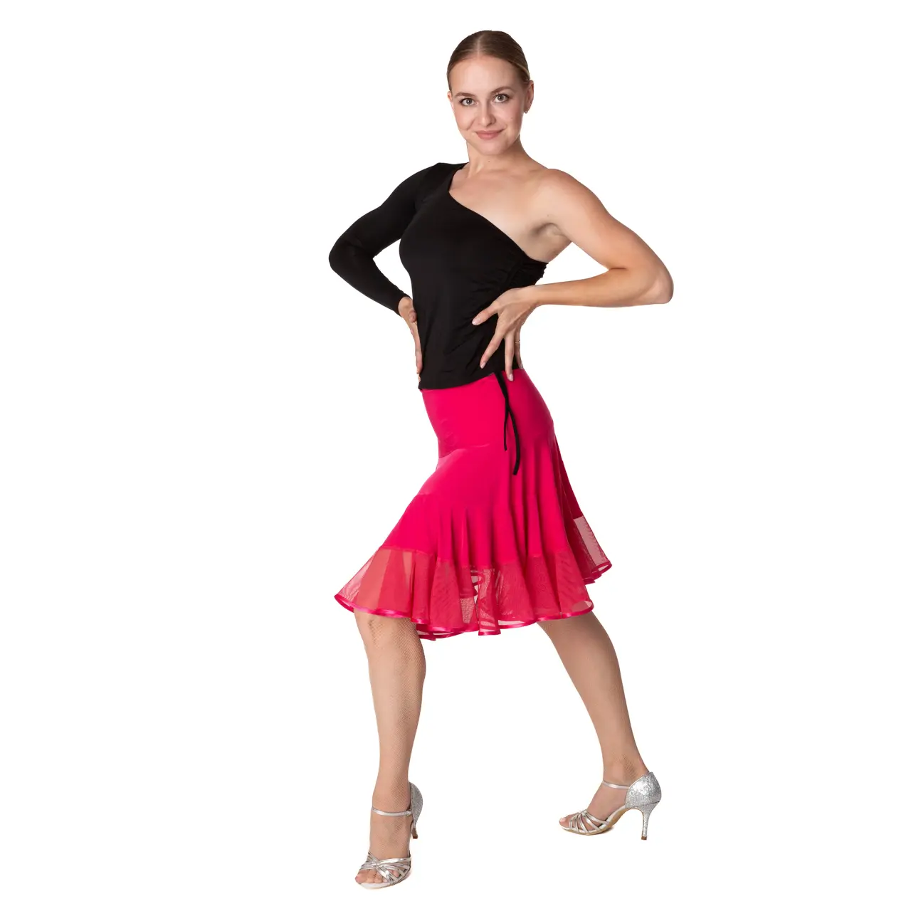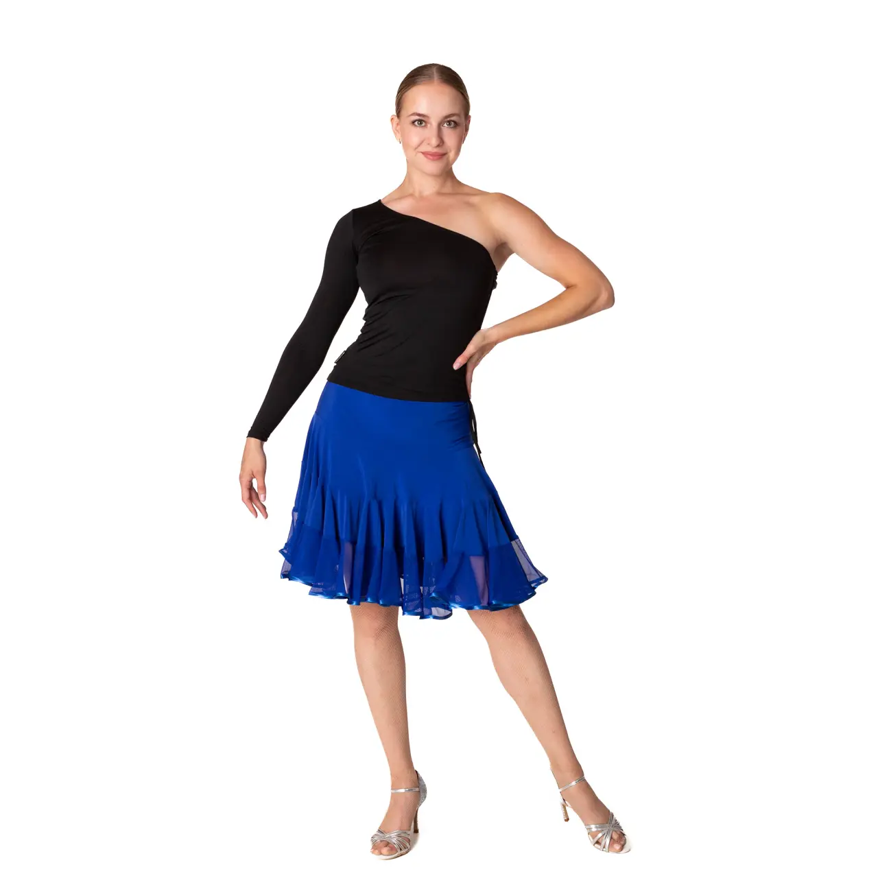 Top mit einer freien Schulter hat an der Seite ein kleines Detail, eine Kordel zur Längenanpassung. Es besteht aus angenehm elastischem Material, Polyamid. Es wird in kaltem Wasser gewaschen und an der Luft getrocknet.