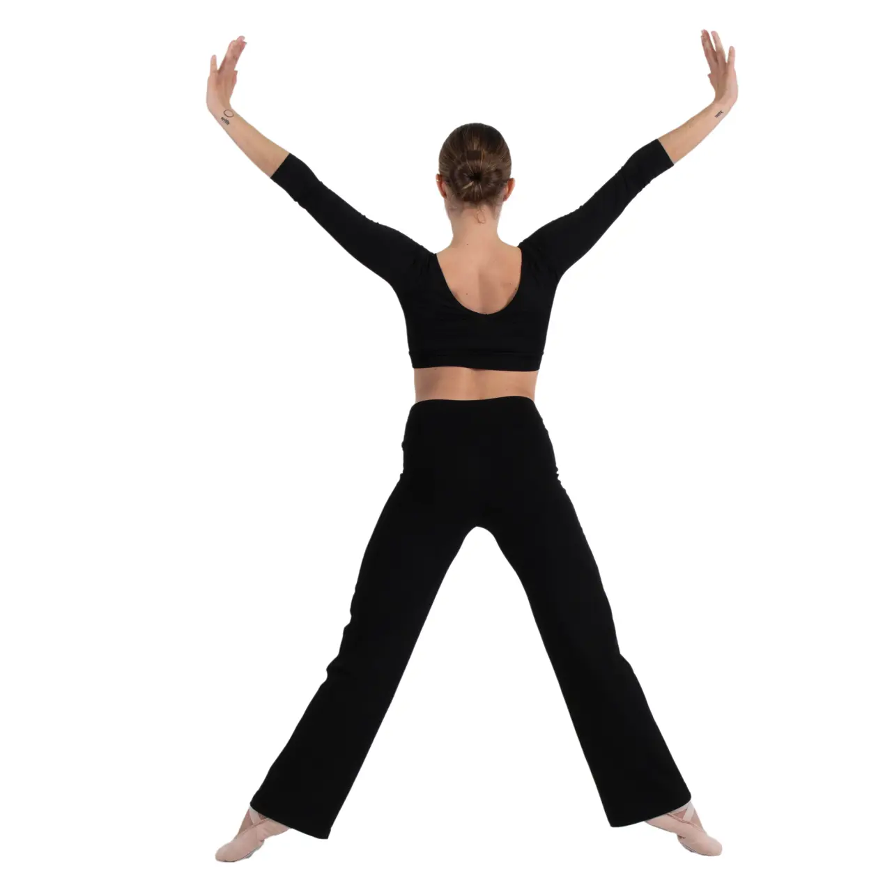 Ein feiner, elastischer, leichter Top, der feminin wirkt. Der U-Boot-Ausschnitt betont den Hals,, der freiliegende Bauch und die Dreiviertelärmel betonen die Bewegung der Taille und der Arme. Material: Mikropolyamid. Er wird von Hand in kaltem Wasser gewaschen und zum Trocknen frei aufgehängt.