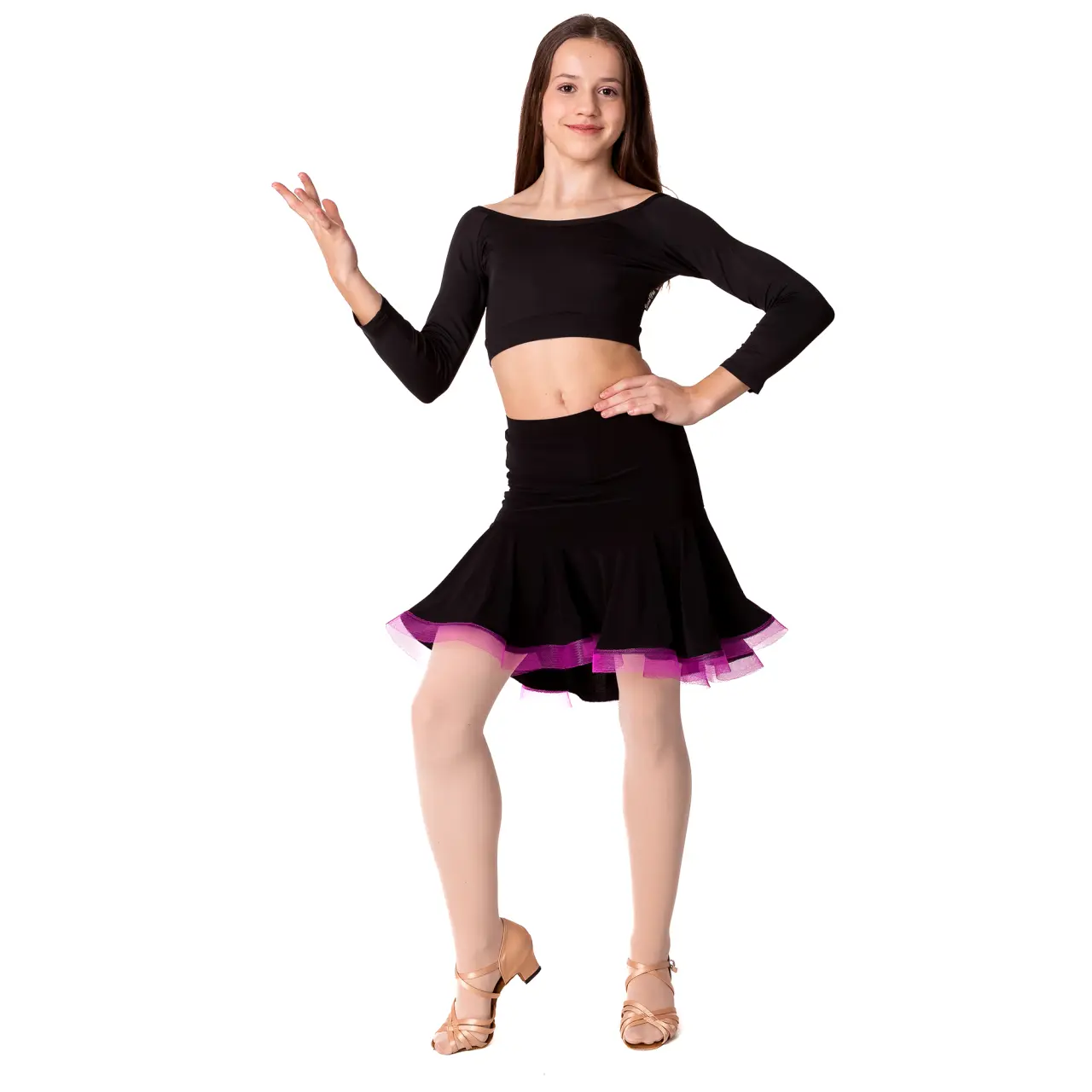 Der zarte, elastische und leichte Fabiana-Crop-Top für Mädchen wirkt sanft und elegant. Der U-Boot-Ausschnitt betont den Hals wunderschön, und der freiliegende Bauch verleiht einen modernen Tanz-Look. Dreiviertelärmel betonen die Bewegung von Taille und Armen und unterstützen so den Ausdruck beim Tanzen.