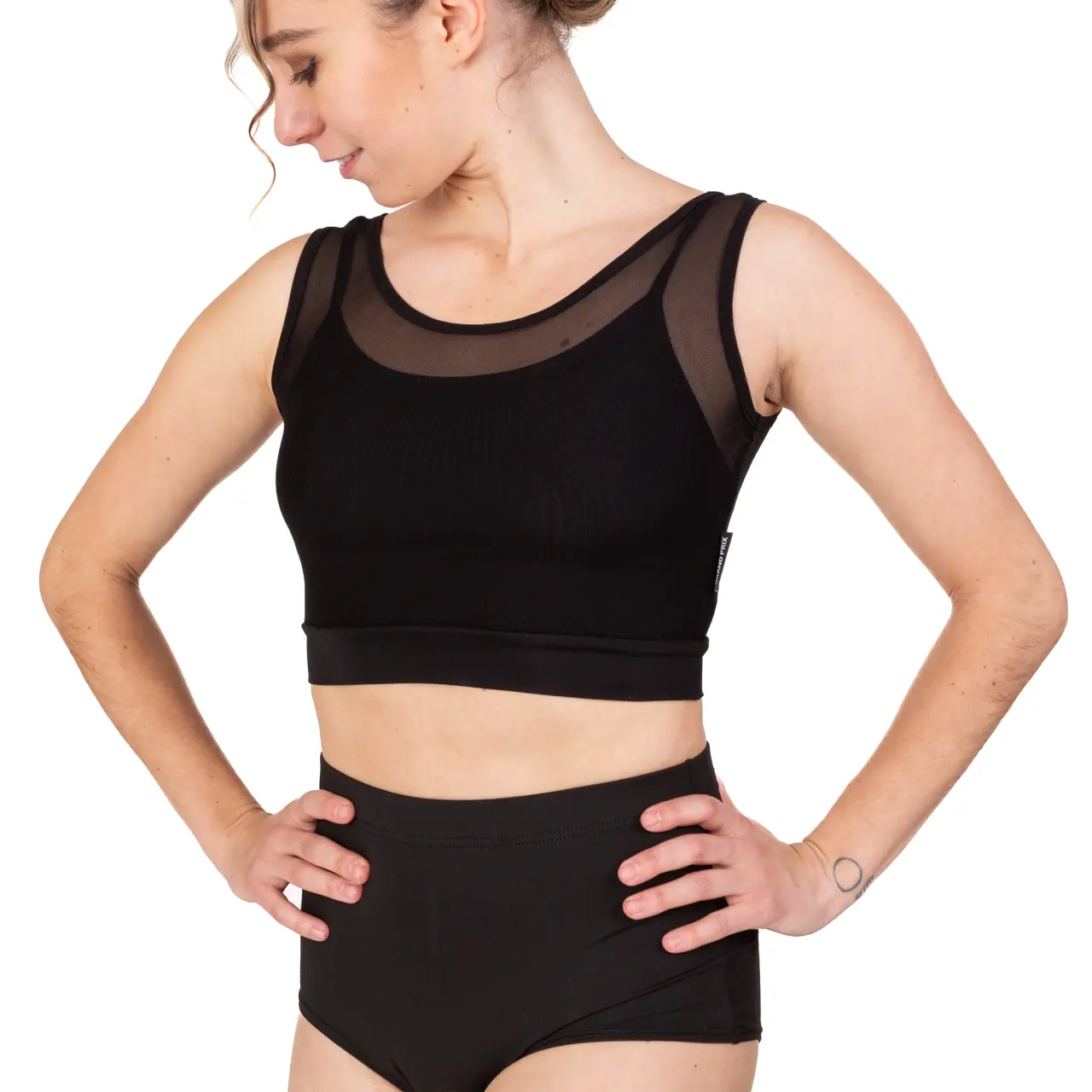 Crop-Top im Schnitt einer klassischen Lambada, über die ein elastisches, feines Netz mit breiten Trägern aufgenäht ist. Beide Teile sind in einem breiteren Bund an der Taille verbunden. Es gehört zu den beliebten Stücken der Tanzbekleidung. Material – Mikropolyamid, wird von Hand in kaltem Wasser gewaschen und zum Trocknen frei aufgehängt.