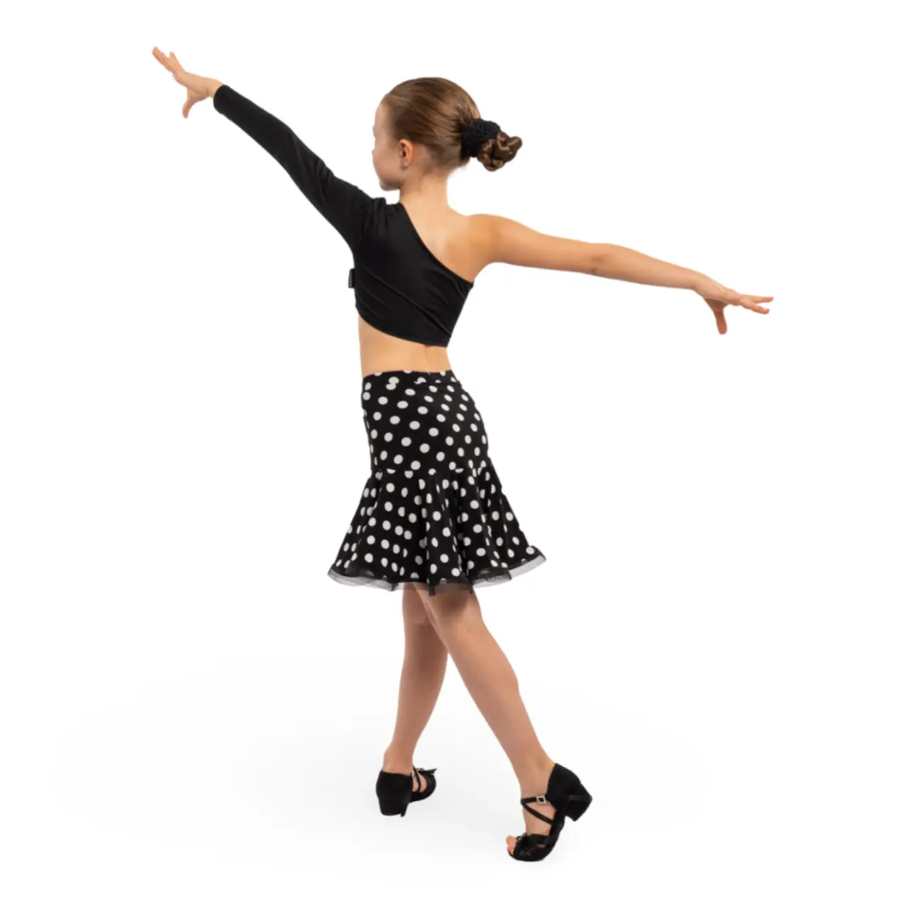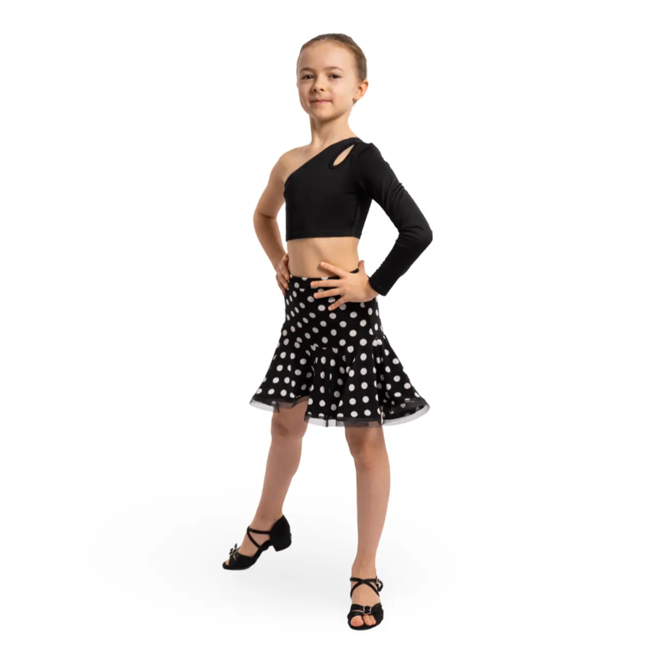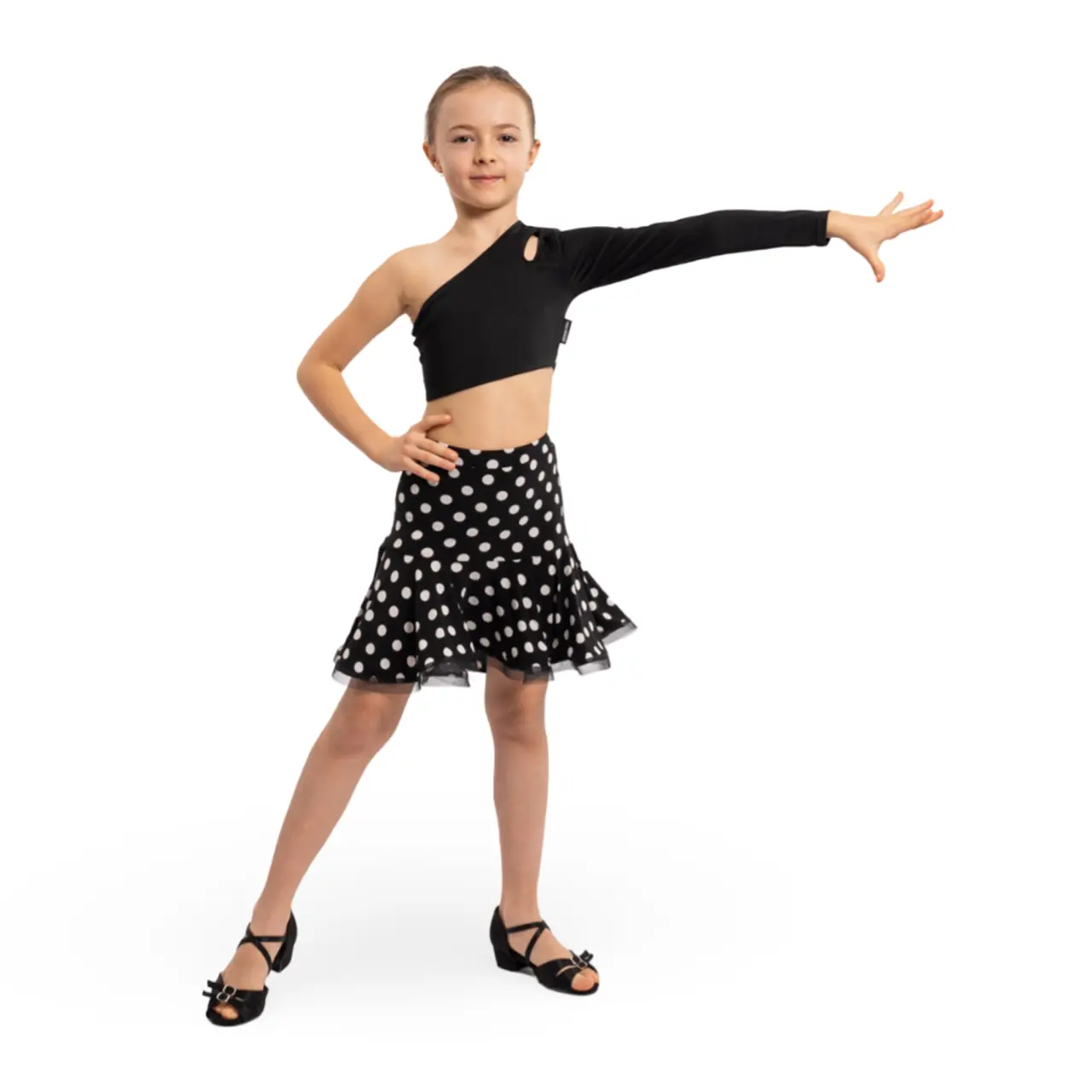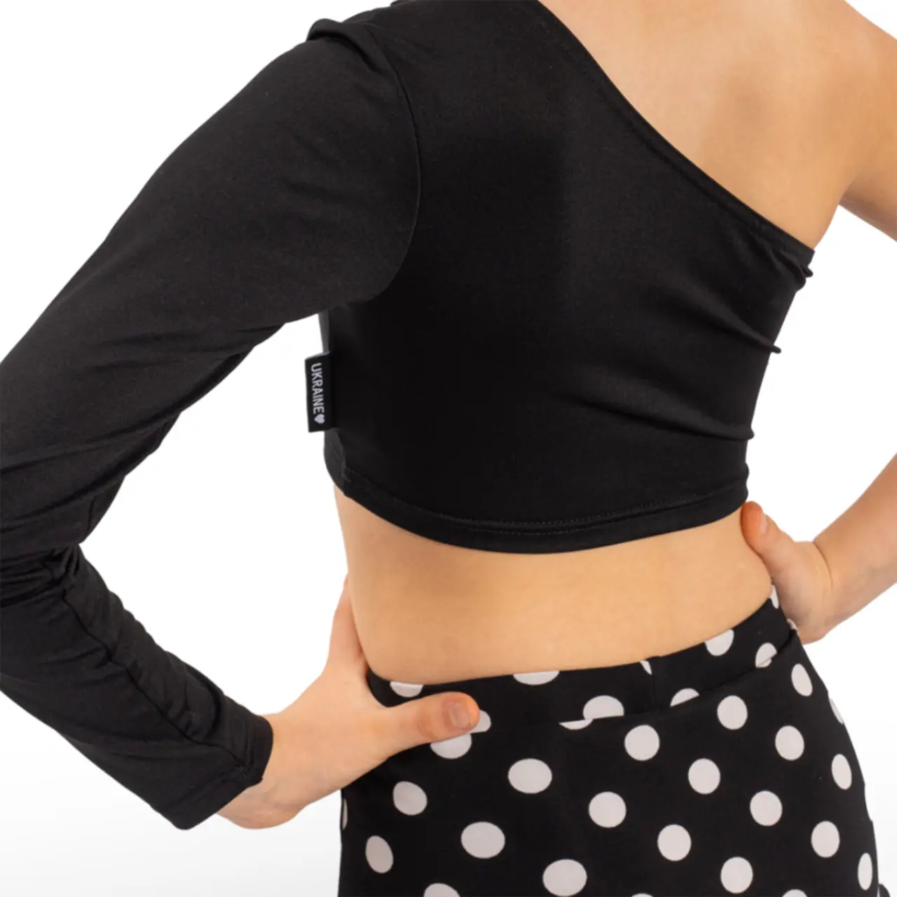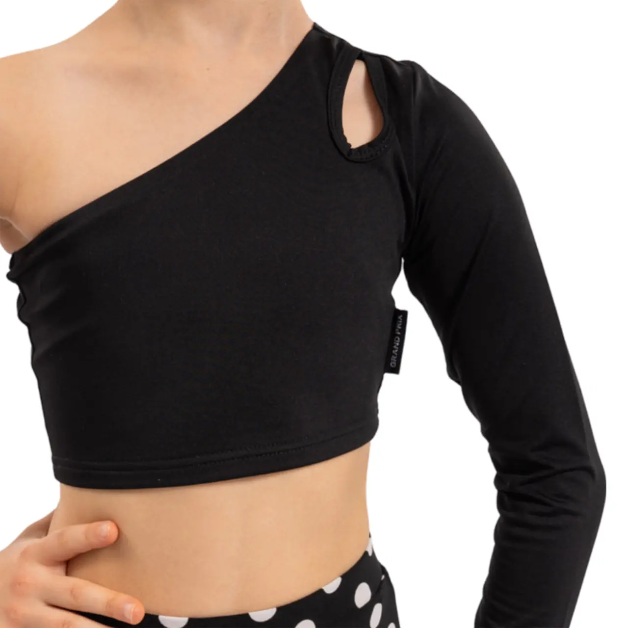 Der Mädchen-Top mit einem Schulterriemen und einem eleganten eingefassten Tropfenausschnitt an der anderen Schulter zieht die Aufmerksamkeit der Umgebung auf sich.