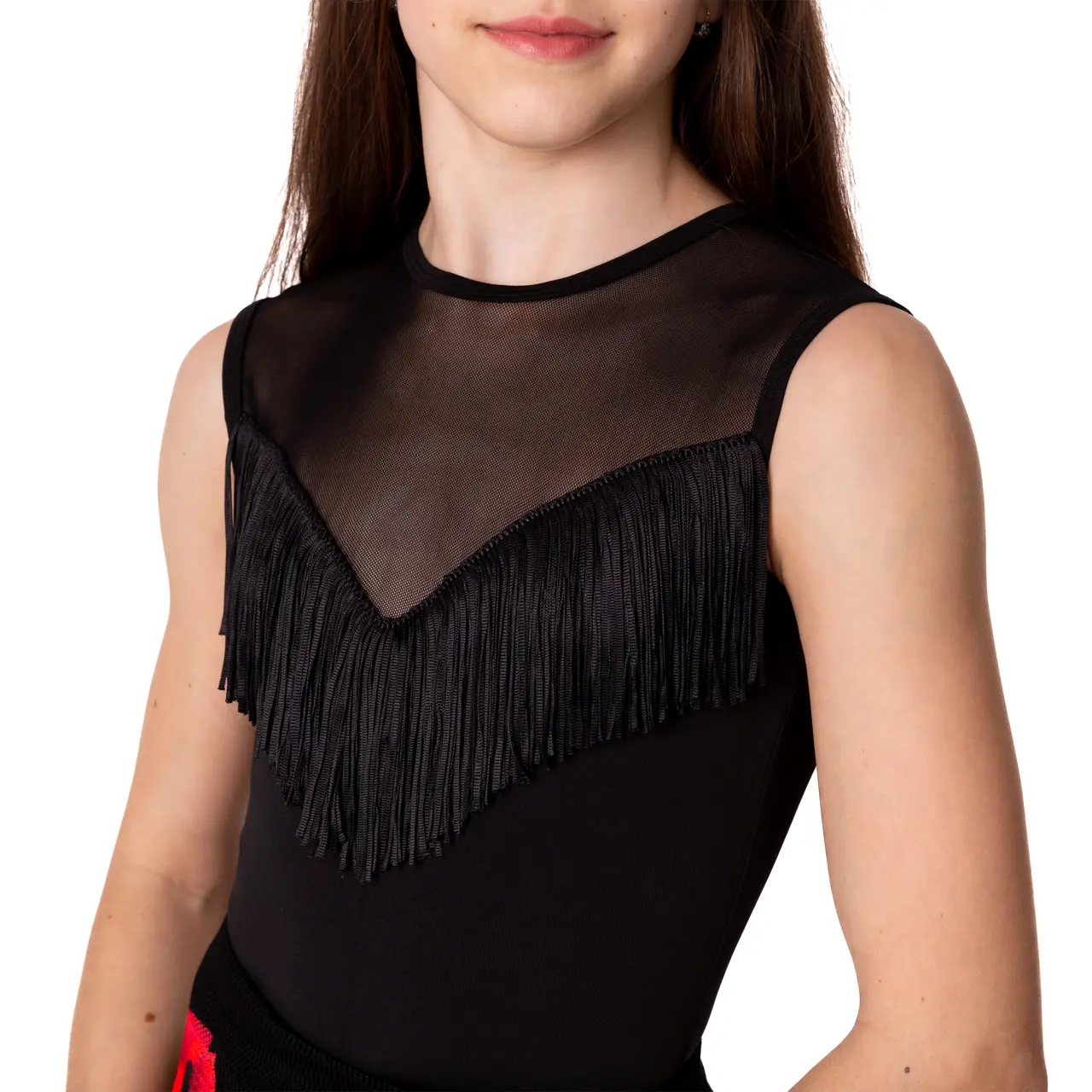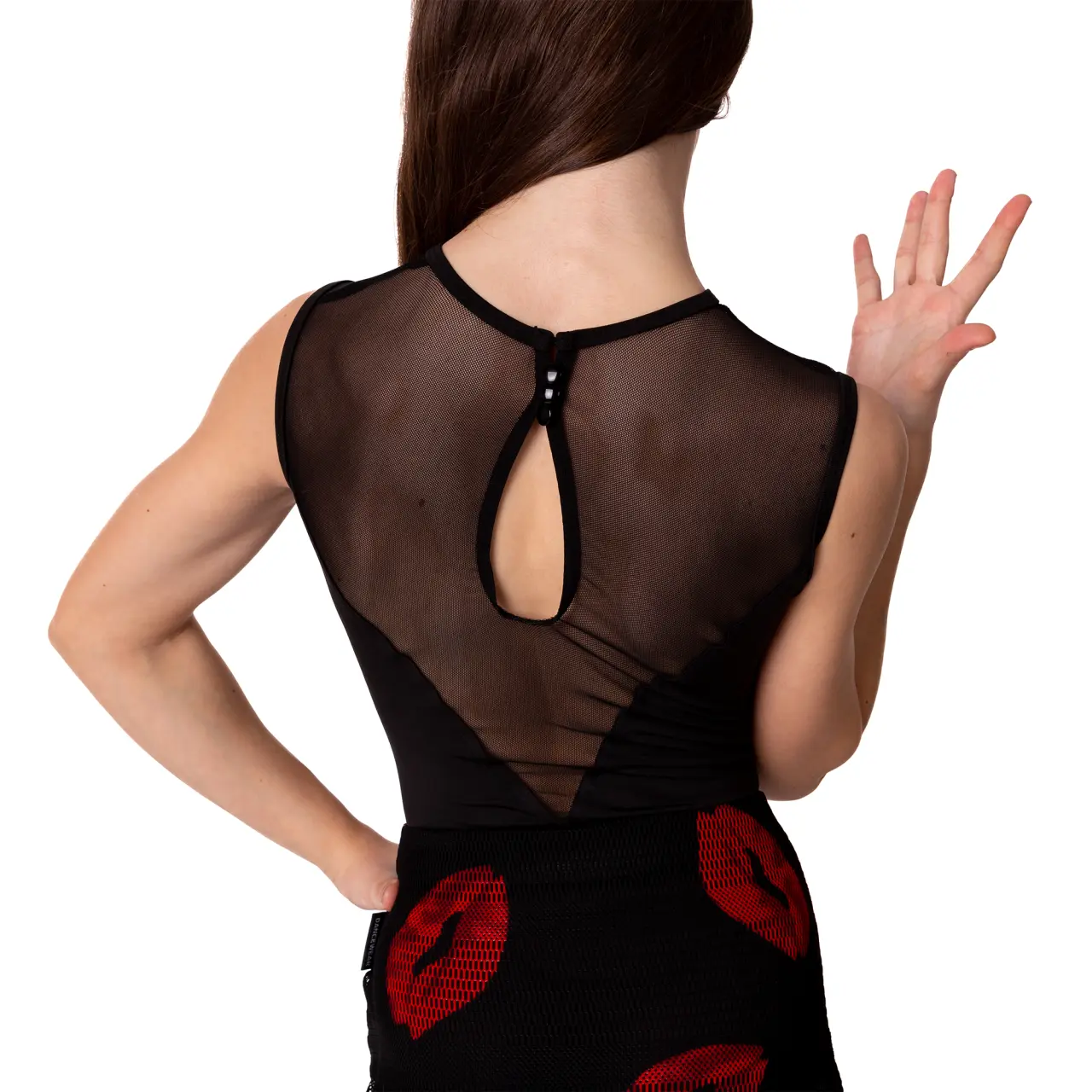 Ärmelloses Trikot, vorne mit Mesh-Einsatz auf der Brust in V-Form, eingefasst mit Fransen. Am Rücken ein tieferer, ebenfalls V-Ausschnitt. Das Mesh bedeckt einen wesentlichen Teil. Verschluss am Hals mit Knöpfen. 90% Polyamid und 10% Elasthan. In kaltem Wasser mit einem milden Waschmittel waschen und an der Luft trocknen lassen.