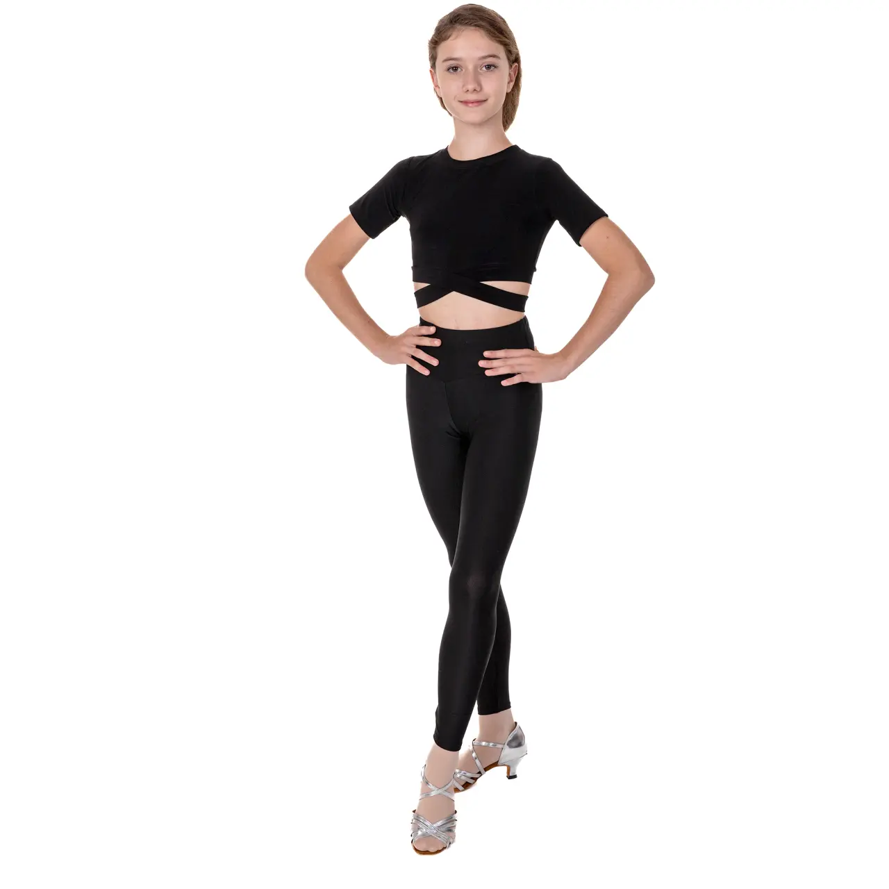 Grundlegende Mädchen-Leggings sind ein üblicher Bestandteil von Trainingsbekleidung. Der breitere Bund betont den Hüftbereich. Sie können sie auch unter kurzen Hosen oder kürzeren Röcken in der kühleren Jahreszeit tragen. Material – Viskose. Sie werden von Hand in kaltem Wasser gewaschen und zum freien Trocknen aufgehängt.