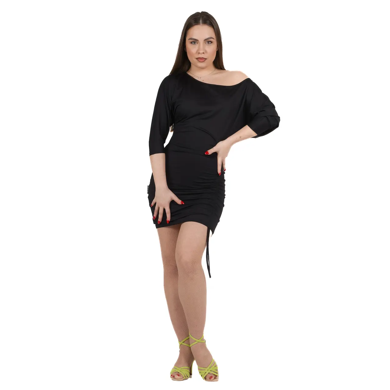 Das Selby-Kleid gehört zu den Modellen mit ultrakurzer Länge und ist auf der Tanzfläche ein besonders gewagtes Stück. Auf der linken Seite sind elastische Bänder eingenäht, mit denen Sie die Länge und die Raffung des Rocks anpassen können, um das Bein noch mutiger zu betonen. Der weitere Schnitt im oberen Bereich ermöglicht Ihnen eine perfekte, uneingeschränkte und geschmeidige Bewegung. Der 3/4-Ärmel verleiht dem Trainingskleid einen eleganten Touch. Dank seiner Eigenschaften ist es die perfekte Wahl, um Ihre Persönlichkeit im Rhythmus des Tanzes frei und bequem auszudrücken. Waschen Sie das Micropolyamid-Material in kaltem Wasser mit einem milden Waschmittel und lassen Sie es frei trocknen.