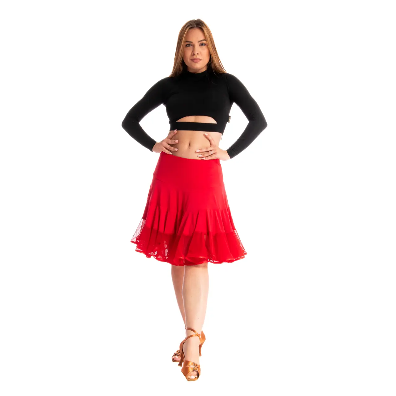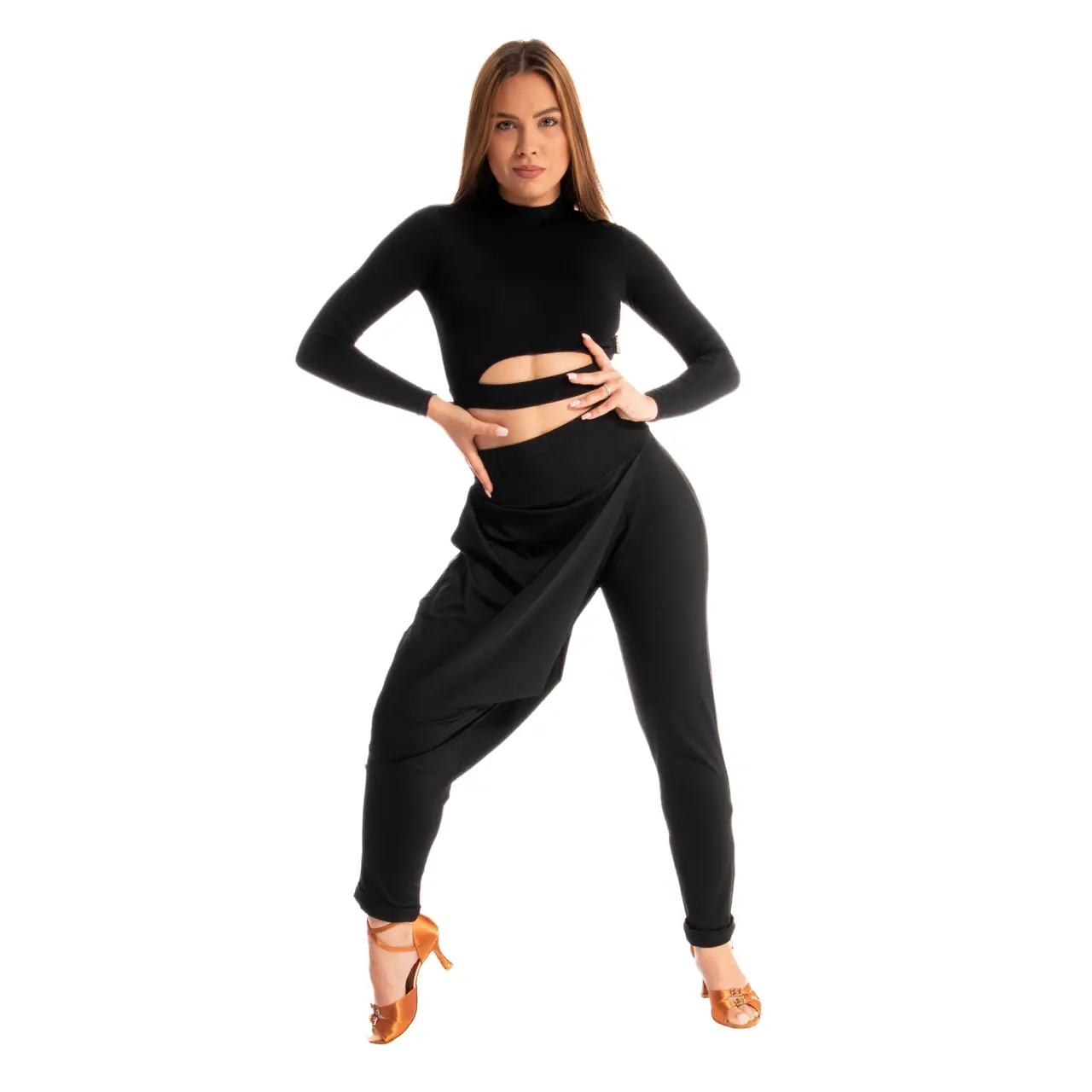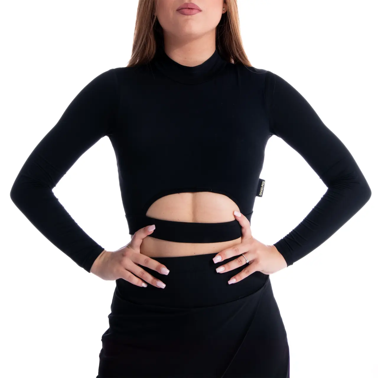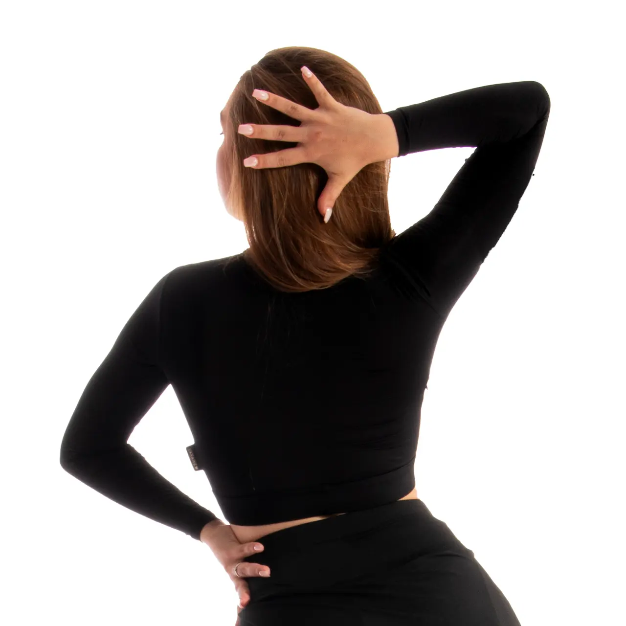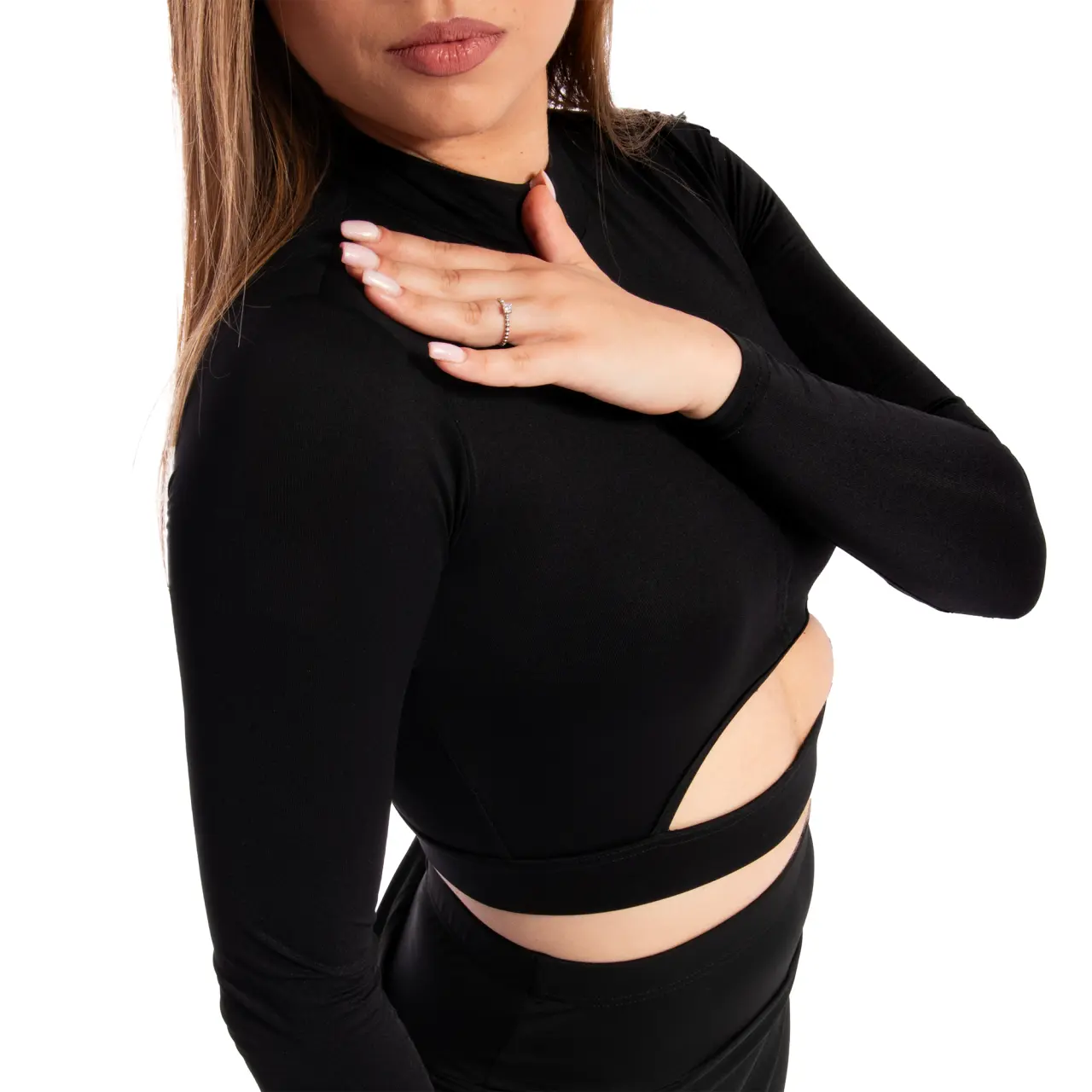 Lange Ärmel unterstreichen die Anmut der Bewegung, der Schnitt im Brustbereich betont die Körperhaltung, die Silhouette. Auf der Innenseite der Brust befindet sich ein schmaler Satinband, das festgezogen wird und am Top einen Raffeffekt erzeugt.