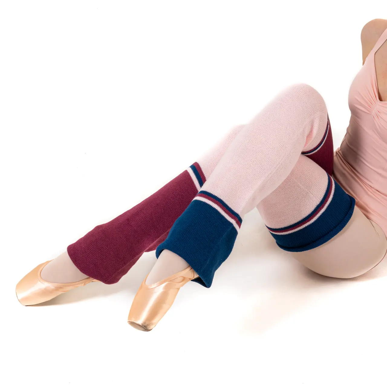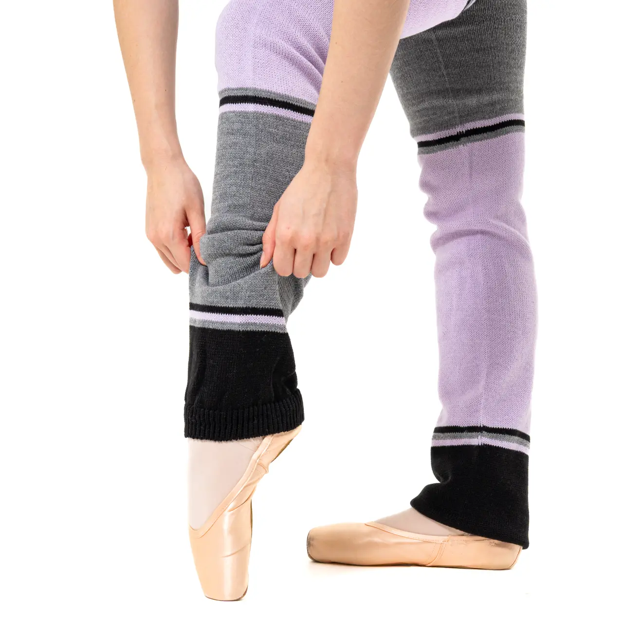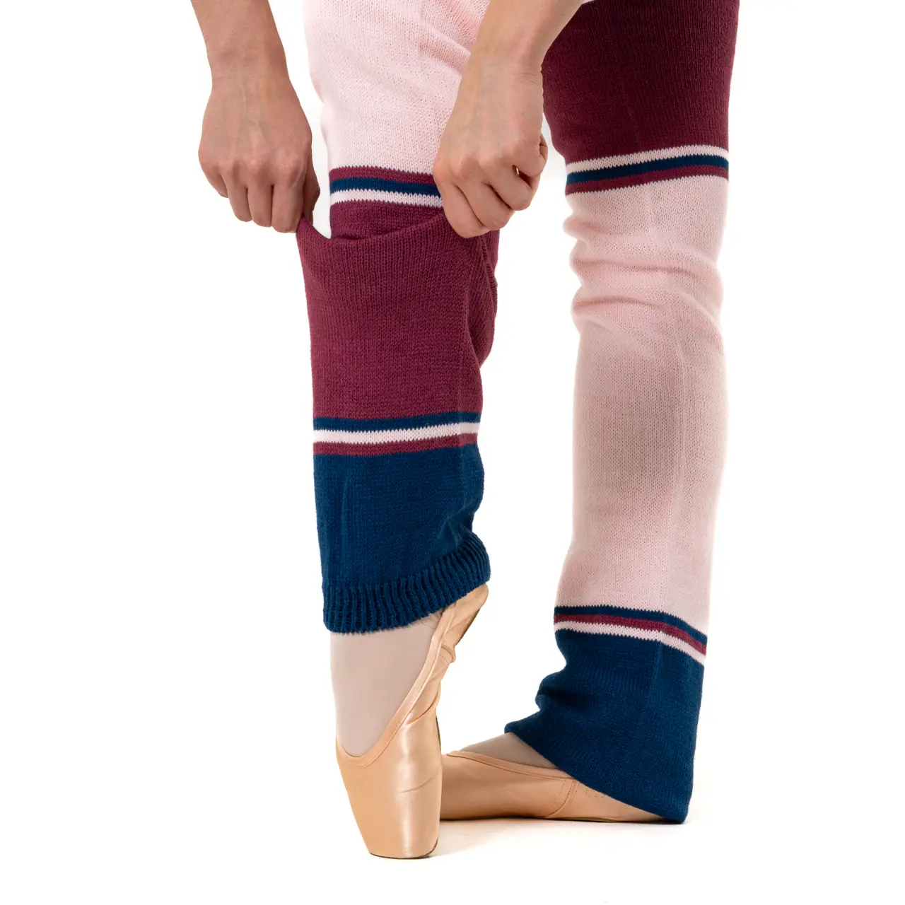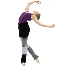 Stulpen, die nicht nur vor der Tanzstunde perfekt wärmen, sondern zugleich mit ihrem Design Freude machen. Die Kombination aus drei Farben und Streifen in unterschiedlicher, unregelmäßiger Größe ist verspielt. Sie können dazu beliebige Farben von Trikots kombinieren. Im unteren Teil sind die Stulpen offen.