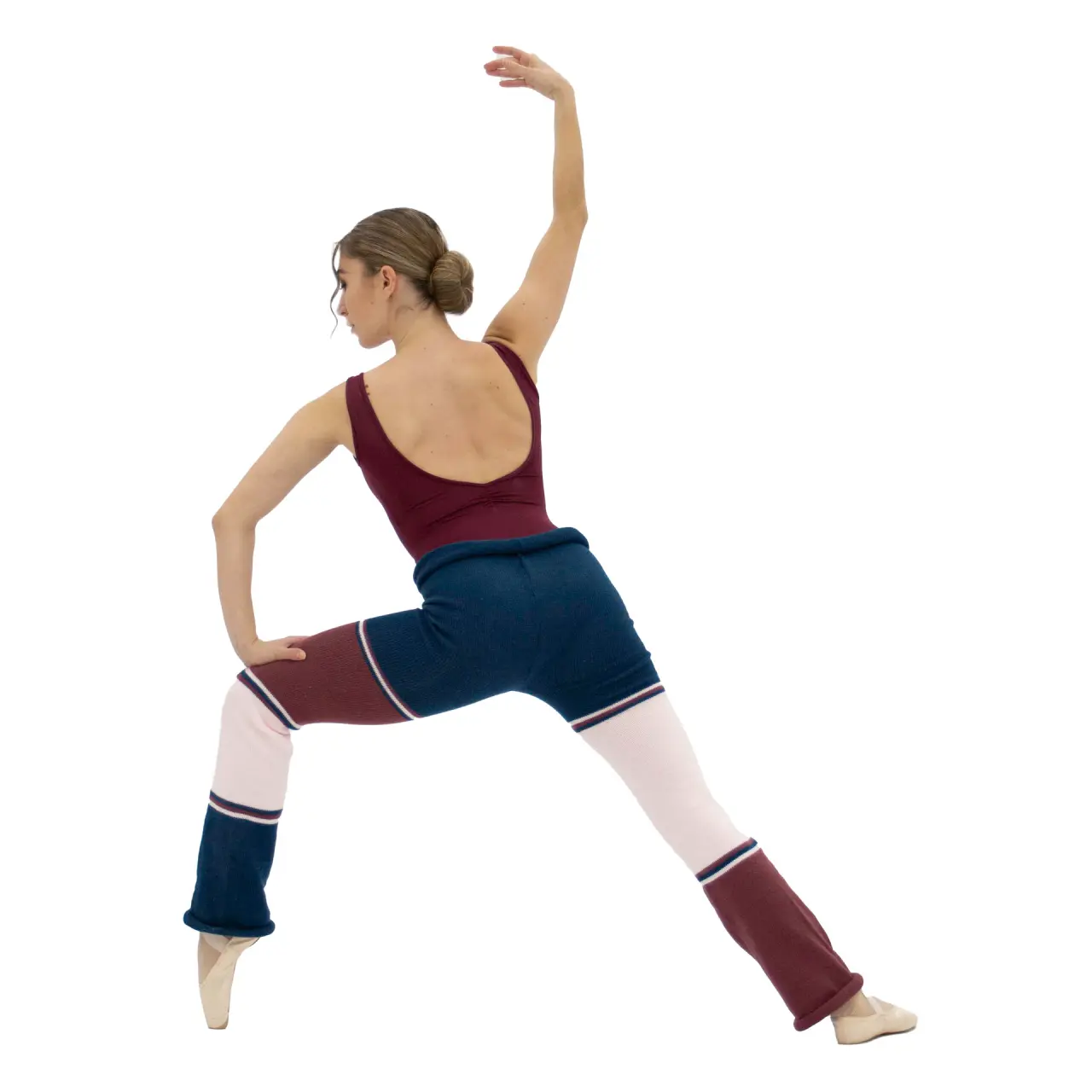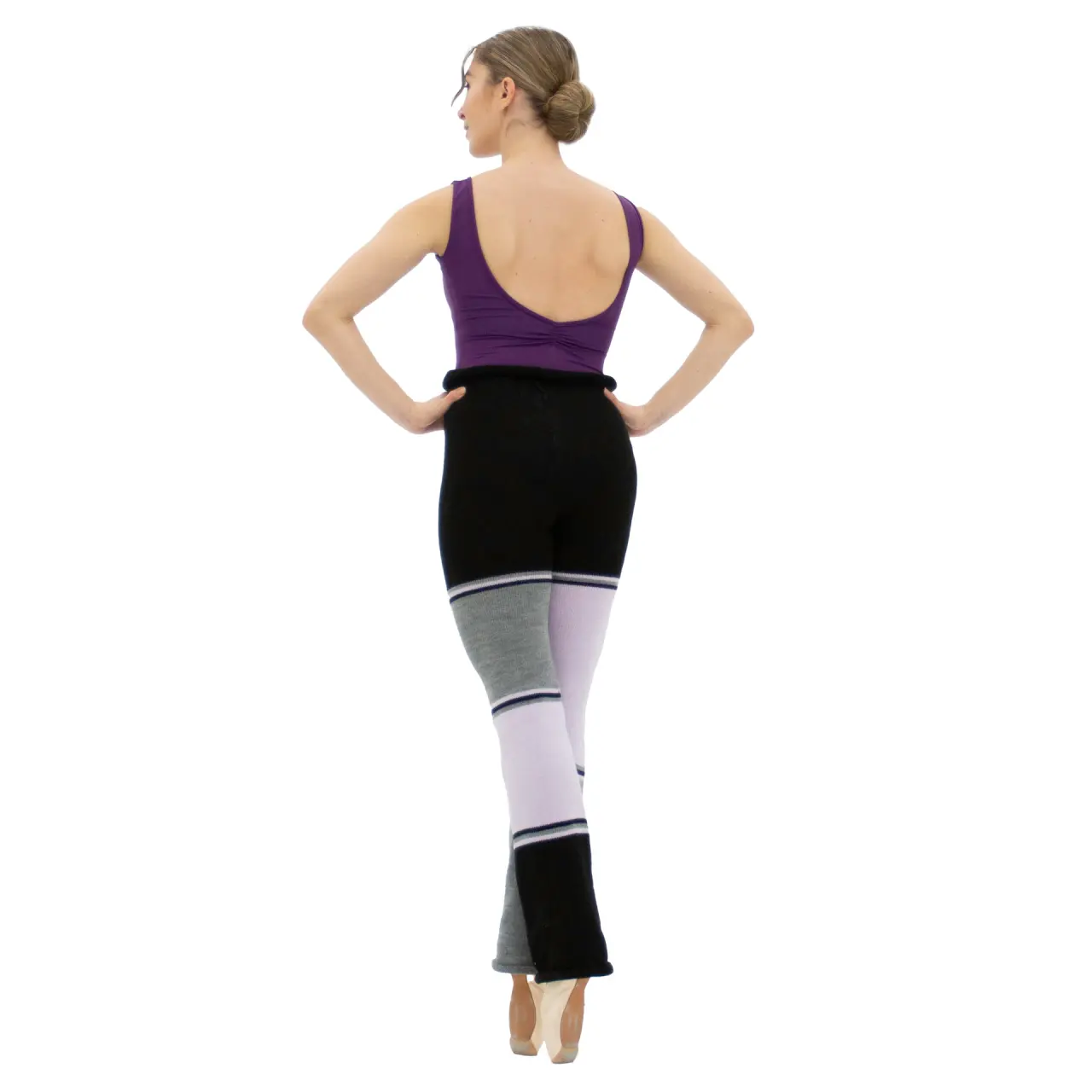 Lange Strickhose mit hohem Bund hat unregelmäßige Streifen in drei Farben an beiden Beinen. Das Material, aus dem sie hergestellt ist (100% Acryl), hält Sie bei den Aufwärmübungen warm und schützt vor Kälte auf dem Tanzboden. Sie wird von Hand in kaltem Wasser mit einem milden Waschmittel gewaschen und zum Trocknen locker aufgehängt.