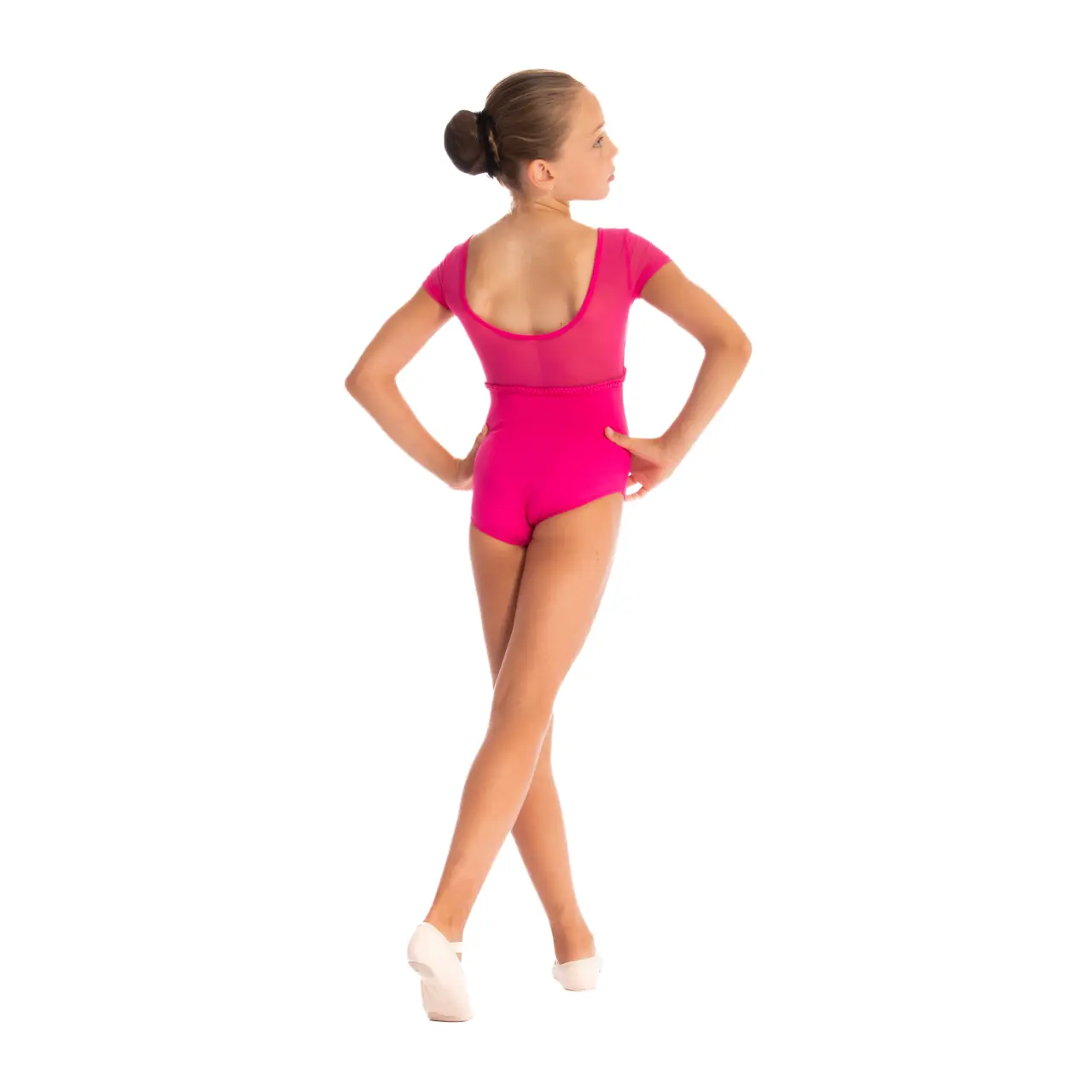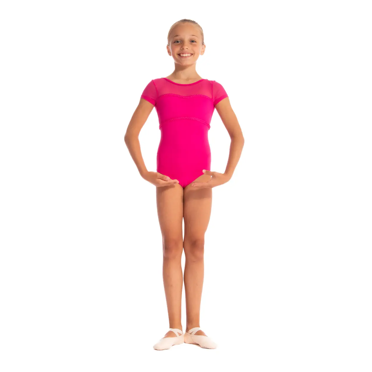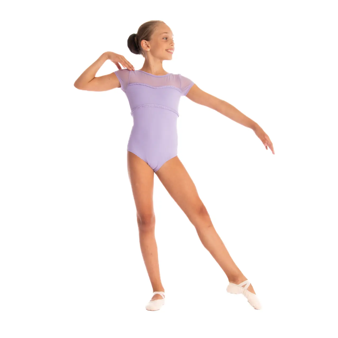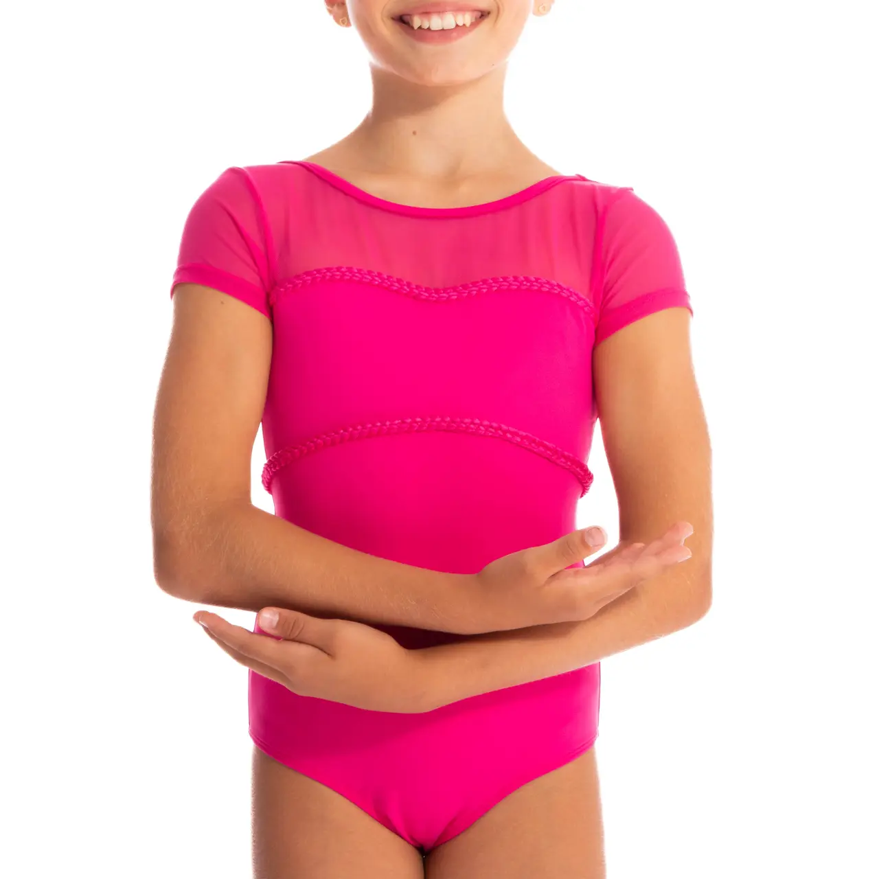 Sein zartes, angenehm wirkendes Design betont die Schönheit des Tanzes und die Einzigartigkeit der kleinen Tänzerin. Der beliebte Schnitt mit kurzen Ärmeln in Kombination mit zartem Mesh wird durch ein Detail hervorgehoben: eine Borte in Zopfmusterform, die um die Brustpartie herumführt. Kleine Tänzerinnen werden sich darin wie tanzende Prinzessinnen fühlen.