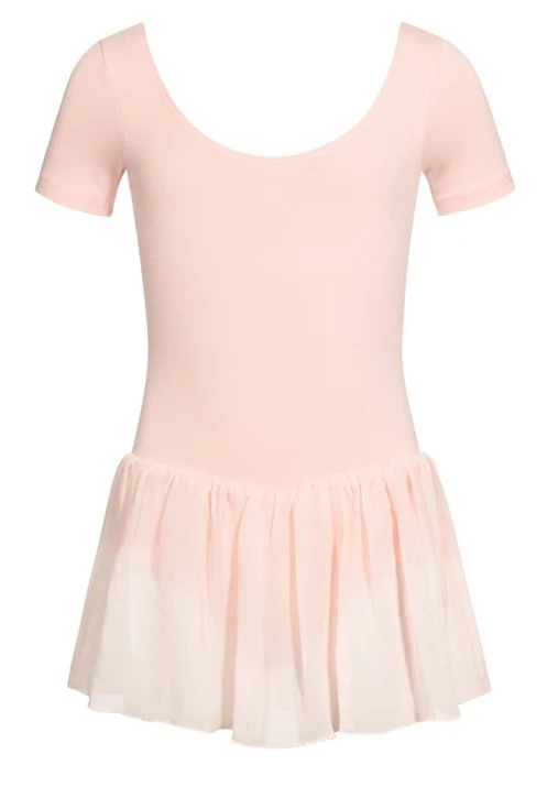 Balletttrikot mit kurzem Ärmel und mit gerafftem kurzem Röckchen. Material 93% Baumwolle 7 % Elasthan.