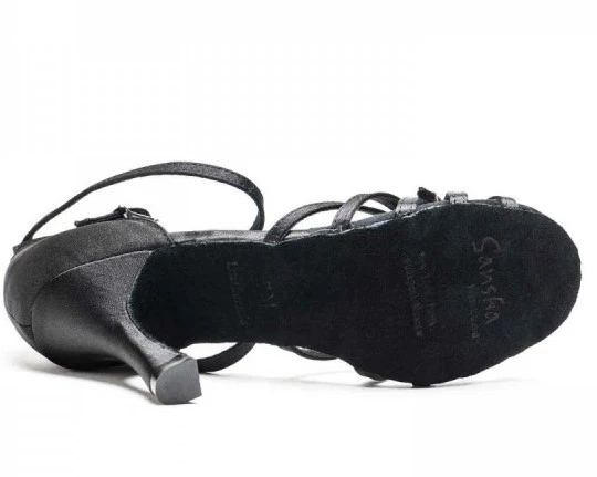 Lateinamerikanische Tanzschuhe. Einer der Riemen, die über den vorderen Teil des Fußes führen, wird mit einer kleinen Brosche geschlossen, die es ermöglicht, die Schuhweite fein zu regulieren. Der Verschluss ist um den Knöchel, hält die Ferse im hinteren Teil des Tanzschuhs fest. Der Absatz ist standardmäßig 8,6 cm hoch. Material Satin, Sohle Wildleder.