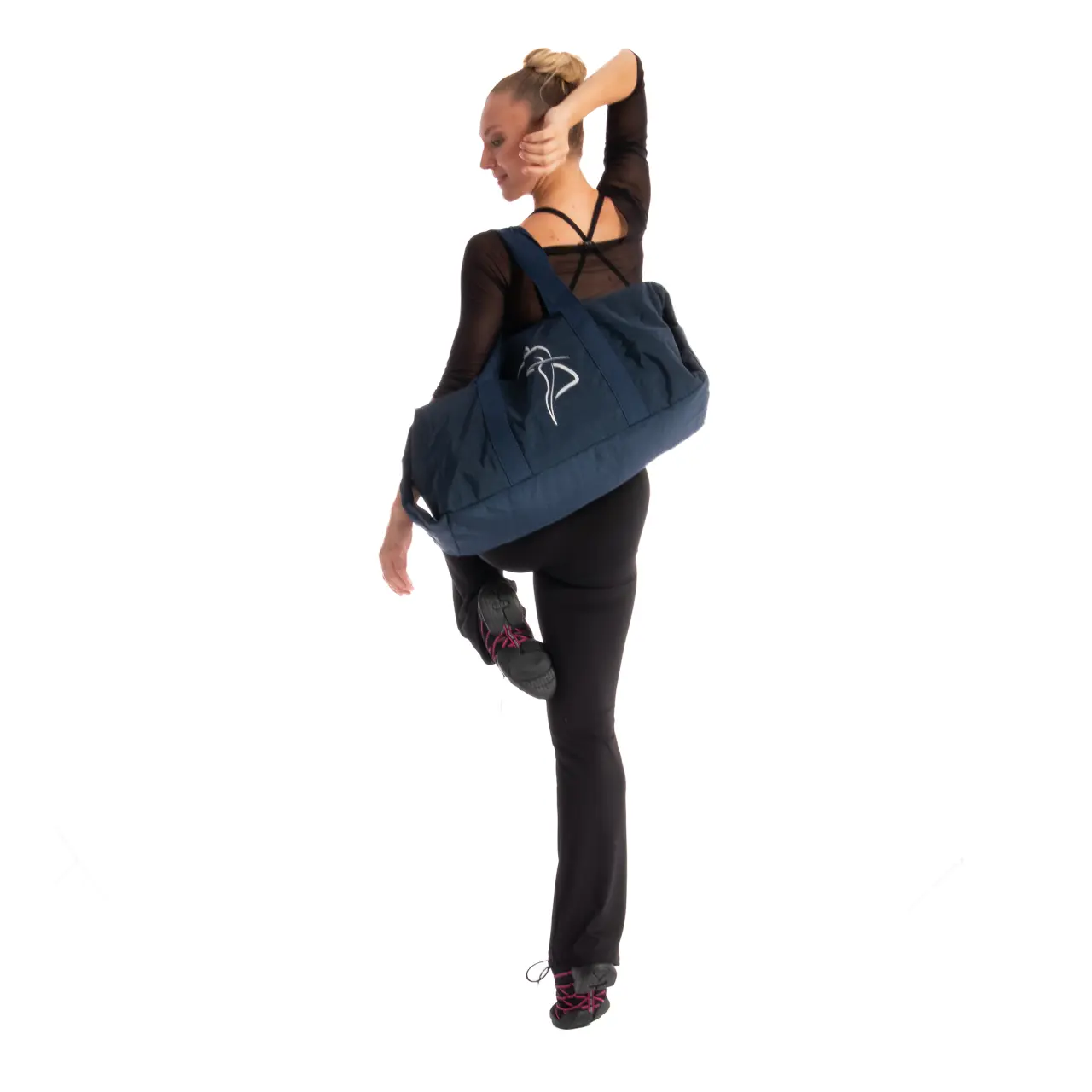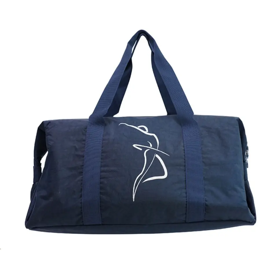 Tasche ideal für Trainings. Sie kann in der Hand oder über der Schulter getragen werden. Das Material, aus dem sie gefertigt ist, ist weich im Griff und leicht gepolstert. Die dunkelblaue matte Farbe wird durch eine weiße Zeichnung – die Linie einer Tänzerin – belebt. Oben wird sie mit einem Reißverschluss geschlossen, an dem sich ein kleiner Anhänger in Form einer Spitzenschuhspitze befindet. Innen gibt es auf einer Seite zwei größere offene Fächer und auf der anderen Seite ein Fach mit Reißverschluss. Ihre Maße sind 52,5 cm x 36 cm x 22 cm. Material 100% Polyester.