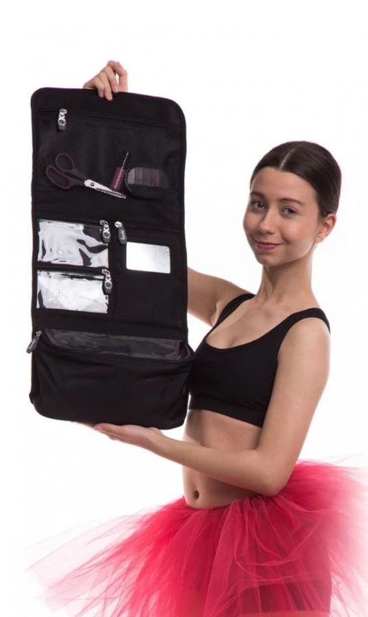 Diese kleine Tasche wird von allen Tänzerinnen geschätzt. Kleine Haarnadeln, Haargummis sowie Gummibänder für Spitzenschuhe oder auch andere notwendige Kleinigkeiten finden jetzt ihren Platz. Die Tasche lässt sich zusammenklappen. Die Fächer sind mit Reißverschluss verschließbar. Sie sind aus Netzmaterial, transparent oder blickdicht.