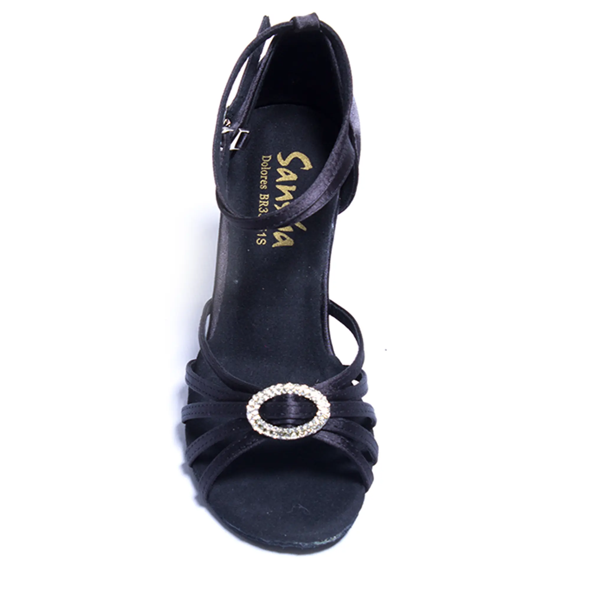 Tolle Schuhe für lateinamerikanischen Tanz mit Brosche. Der Verschluss ist um den Knöchel, hält die Ferse fest im hinteren Teil des Tanzschuhs. Der Absatz ist standardmäßig 8,6 cm hoch. Material Satin, Sohle Wildleder.