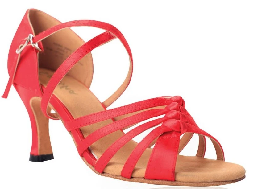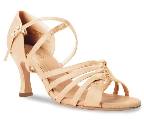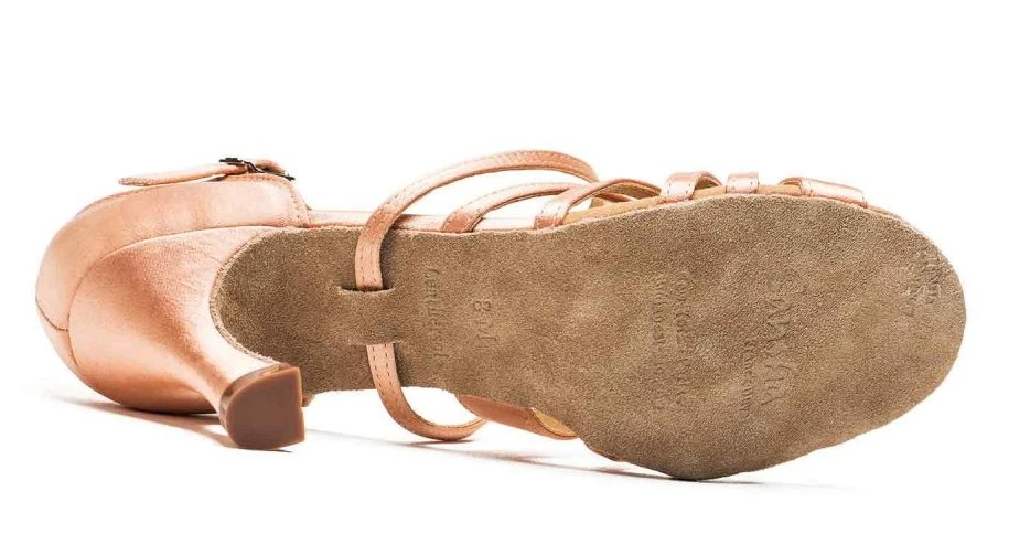 Schuhe für Gesellschaftstanz, Latein, für Erwachsene. Die Sohle ist durchgehend, aus Leder. Das Obermaterial ist aus Satin. Der Absatz ist 7,4 cm hoch.
