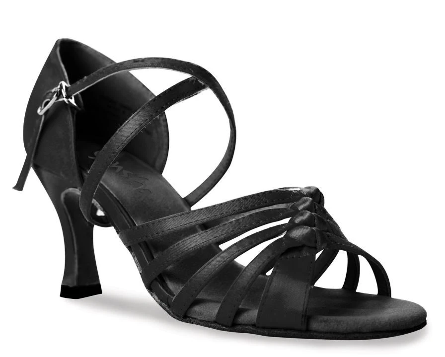 Gesellschaftstanzschuhe, Latin, für Erwachsene. Die Sohle ist durchgehend, aus Leder. Das Obermaterial ist aus Satin. Der Absatz ist 7,4 cm hoch.