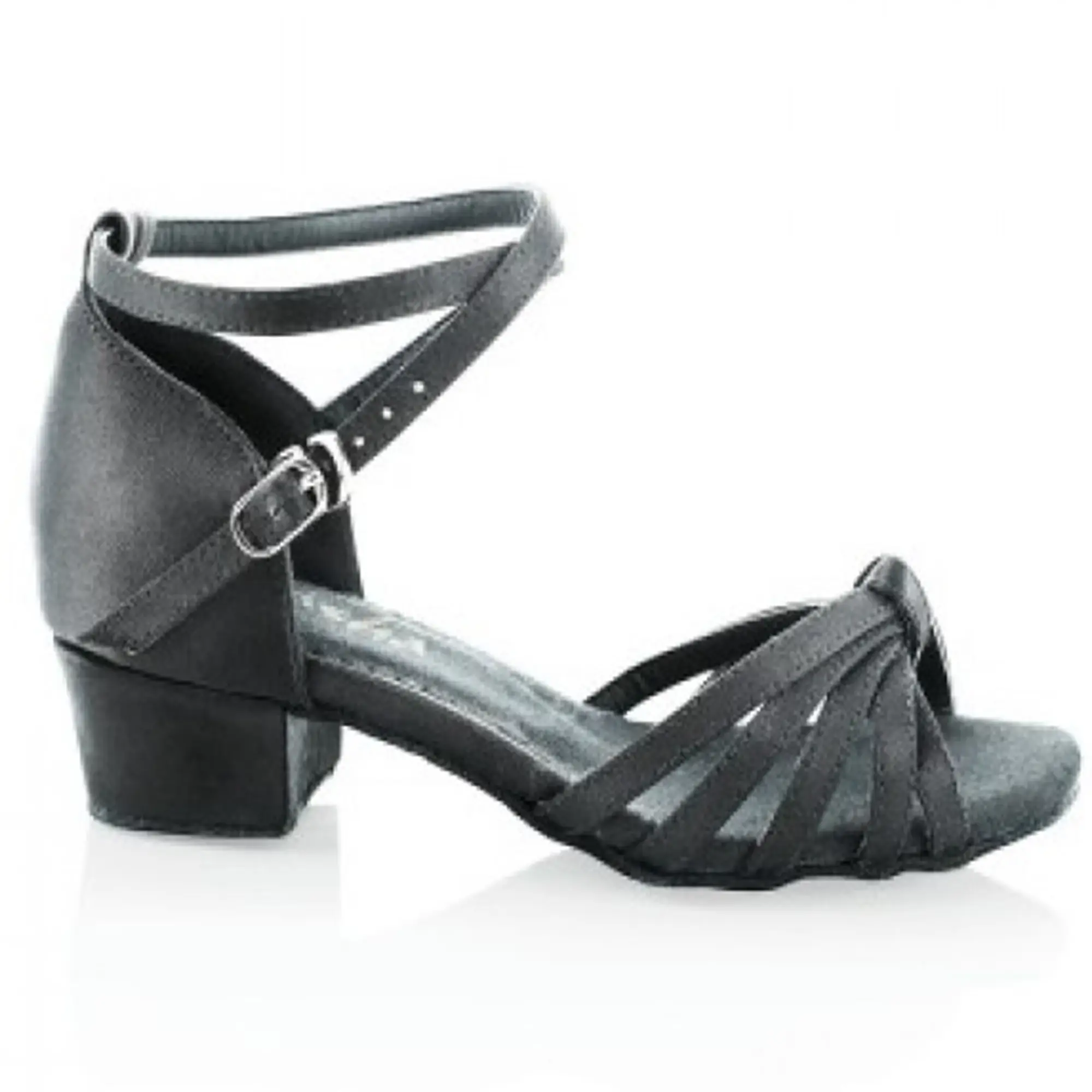 Damen-Lateinschuhe mit kubanischem Absatz. Die Sohle ist aus gebürstetem Leder. Der 3,2 cm hohe Absatz in kubanischer Form sorgt für Komfort und Stabilität. Sie werden um den Knöchel geschlossen. Über den Spann verlaufen Satinbänder, die mit einem dekorativen Knoten zusammengezogen sind.