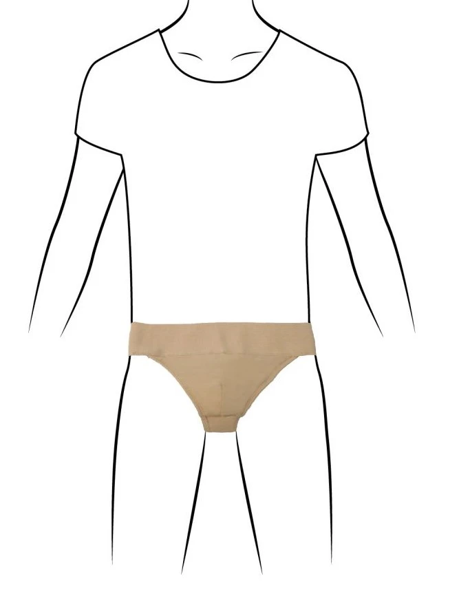 Suspensorium für Herren. Es ist aus Baumwolle und Lycra gefertigt. Der Bund ist aus Gummi und 5 cm breit. Im vorderen Bereich ist es leicht gepolstert.