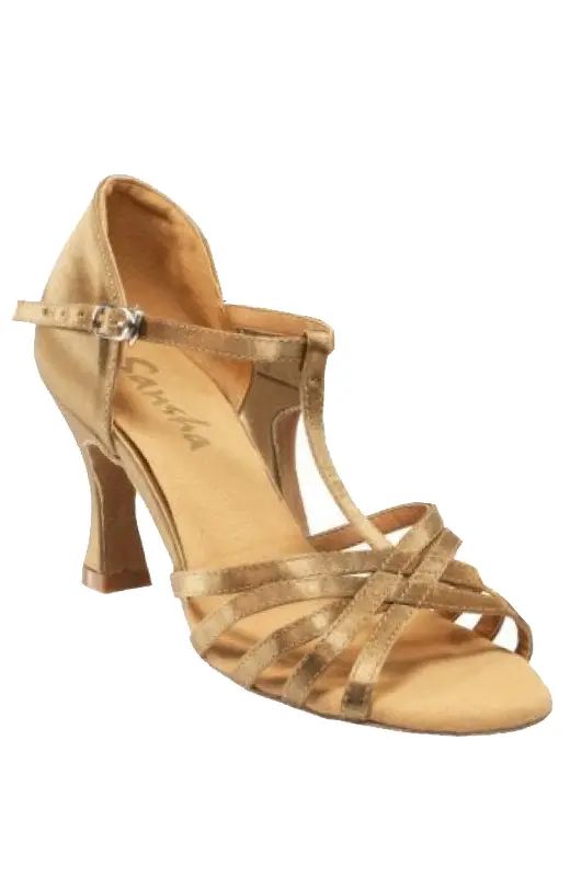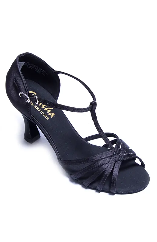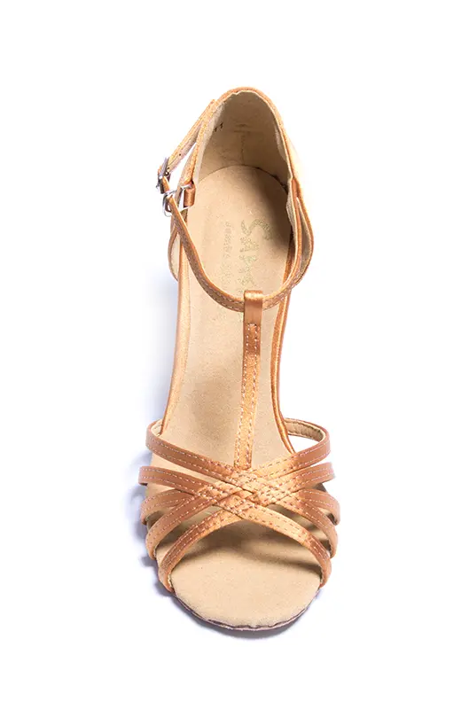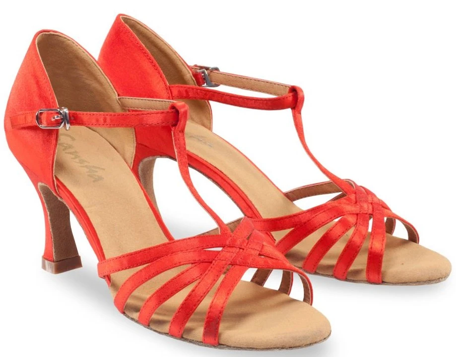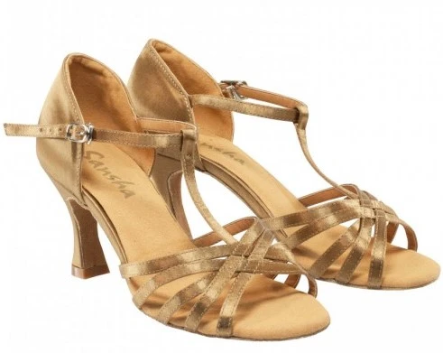Einfache und zugleich elegant feminine Latein-Tanzschuhe. Obermaterial und Riemchen sind aus Satin, die Sohle ist aus Wildleder. Der Absatz ist 7,4 cm hoch.